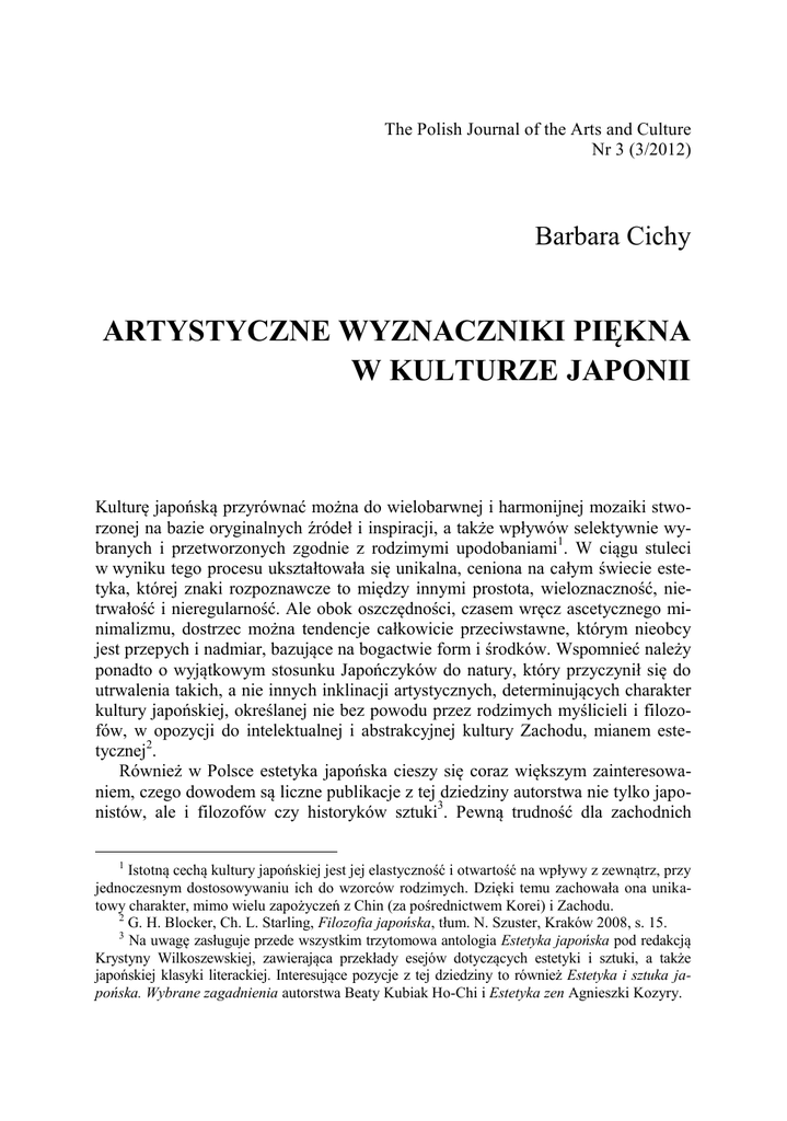 The Polish Journal of the Arts and Culture Nr 3 (3/2012) Barbara Cichy ARTYSTYCZNE WYZNACZNIKI PIĘKNA W KULTURZE JAPONII Kulturę japońską przyrównać można do wielobarwnej i harmonijnej mozaiki stworzonej na bazie oryginalnych źródeł i inspiracji, a także wpływów selektywnie wybranych i przetworzonych zgodnie z rodzimymi upodobaniami1. W ciągu stuleci w wyniku tego procesu ukształtowała się unikalna, ceniona na całym świecie estetyka, której znaki rozpoznawcze to między innymi prostota, wieloznaczność, nietrwałość i nieregularność. Ale obok oszczędności, czasem wręcz ascetycznego minimalizmu, dostrzec można tendencje całkowicie przeciwstawne, którym nieobcy jest przepych i nadmiar, bazujące na bogactwie form i środków. Wspomnieć należy ponadto o wyjątkowym stosunku Japończyków do natury, który przyczynił się do utrwalenia takich, a nie innych inklinacji artystycznych, determinujących charakter kultury japońskiej, określanej nie bez powodu przez rodzimych myślicieli i filozofów, w opozycji do intelektualnej i abstrakcyjnej kultury Zachodu, mianem estetycznej2. Również w Polsce estetyka japońska cieszy się coraz większym zainteresowaniem, czego dowodem są liczne publikacje z tej dziedziny autorstwa nie tylko japonistów, ale i filozofów czy historyków sztuki3. Pewną trudność dla zachodnich 1 Istotną cechą kultury japońskiej jest jej elastyczność i otwartość na wpływy z zewnątrz, przy jednoczesnym dostosowywaniu ich do wzorców rodzimych. Dzięki temu zachowała ona unikatowy charakter, mimo wielu zapożyczeń z Chin (za pośrednictwem Korei) i Zachodu. 2 G. H. Blocker, Ch. L. Starling, Filozofia japońska, tłum. N. Szuster, Kraków 2008, s. 15. 3 Na uwagę zasługuje przede wszystkim trzytomowa antologia Estetyka japońska pod redakcją Krystyny Wilkoszewskiej, zawierająca przekłady esejów dotyczących estetyki i sztuki, a także japońskiej klasyki literackiej. Interesujące pozycje z tej dziedziny to również Estetyka i sztuka japońska. Wybrane zagadnienia autorstwa Beaty Kubiak Ho-Chi i Estetyka zen Agnieszki Kozyry. 280 Barbara Cichy ____________________________________________________________________________________________________________________________________________________________________________________________________________________________________________ badaczy stanowi fakt, że nauka o pięknie (bigaku4) – w rozumieniu dziedziny filozofii – a co za tym idzie akademickie studia jej poświęcone zapoczątkowane zostały w Japonii stosunkowo niedawno, bo w epoce Meiji (1868−1912), kiedy skończyła się trwająca ponad dwa wieki izolacja tego kraju pod rządami rodu Tokugawa5. Refleksja estetyczna przed tym okresem oczywiście istniała, czego dowodem jest mnogość terminów związanych z poezją, teatrem, malarstwem monochromatycznym i wieloma innymi gałęziami sztuki. Piękno wyrażały więc, w zależności od okresu, ideały takie jak miyabi (elegancja), aware (melancholia), sabi (patyna, niedoskonałość), wabi (szlachetne ubóstwo), yūgen (tajemna głębia) czy iki (czar, szyk). Jednak pomimo tej różnorodności można zaryzykować twierdzenie, że tradycyjnej estetyce japońskiej wciąż brakuje definicji, istniejące odnoszą się bowiem tylko do poszczególnych właściwości. Wspomniane kategorie znajdują odzwierciedlenie nie tylko w sztuce, ale i w życiu codziennym. Szczególne, wielokrotnie opisywane uwrażliwienie mieszkańców Kraju Kwitnącej Wiśni na piękno sprawiło, że potrafili oni odnaleźć je w każdym niemal aspekcie życia, podnosząc do rangi twórczości takie czynności, jak parzenie i podawanie herbaty, projektowanie ogrodów bądź układanie kwiatów. Zwrócenie uwagi na codzienne zjawiska zaspokajało estetyczne pragnienia Japończyków w tym samym stopniu co sztuka, wszak by posłużyć się słowami Tanizakiego Junʼichirō, jednego z największych pisarzy japońskich, „poczucie piękna wyrasta z realnego życia”6. UWAGI OGÓLNE Aby zrozumieć w pełni estetykę japońską, niezbędny jest pewien rys historyczny, umożliwiający prześledzenie kontekstu kulturowego, w którym się kształtowała. Rozważania te zacząć należy od starożytności, której analiza wiele wnosi do dyskusji o sposobie rozumienia i postrzegania piękna przez Japończyków. To właśnie w drugiej połowie tego okresu przypadającego na epoki Nara (710−794) i Heian (794−1092), zdominowanej przez społeczność dworską, rozkwitł wszechobecny jego kult, a wrażliwość estetyczna stała się istotnym kryterium oceny człowieka. Życie arystokratów związanych z dworem cesarza w Kioto (Heian Kyō) upływało głównie na obcowaniu ze sztuką, poezją, podziwianiu przyrody. Każdy element życia podporządkowany był ścisłym rygorom estetycznym. Zwracano uwagę na odpowiedni dobór kolorystyczny szat, ale i perfum, gdyż zapach był nie mniej waż4 W artykule przyjęłam pisownię opartą na ogólnie przyjętej międzynarodowej transkrypcji Hepburna. W przypadku wyrazów, które przeniknęły do języka polskiego, takich jak Kioto czy siogun, zastosowane zostały spolszczenia. 5 Więcej na temat zob. B. Kubiak Ho-Chi, Japońskie odkrywanie estetyki, „Japonica” 2003, nr 16. 6 Tanizaki Junʼichirō, Pochwała cienia, tłum. H. Lipszyc [w:] Estetyka japońska. Antologia, t. 3, Estetyka życia i piękno umierania, red. K. Wilkoszewska, Kraków 2005, s. 89. Artystyczne wyznaczniki piękna w kulturze Japonii 281 ____________________________________________________________________________________________________________________________________________________________________________________________________________________________________________ ny niż strój. W niezwykłym stopniu rozwinęła się sztuka epistolarna. Prócz kaligrafii i zawartości listu przywiązywano wagę do jego wyglądu, który winien pozostawać w harmonii z panującą porą roku, dnia i nastroje