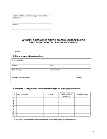 Nazwa podmiotu realizującego świadczenia rodzinne : Adres: WNIOSEK O USTALENIE PRAWA DO ZASIŁKU RODZINNEGO ORAZ DODATKÓW DO ZASIŁKU RODZINNEGO Część I. 1. Dane osoby ubiegającej się Imię i nazwisko 1.Dane wnioskodawcy PESEL *) Stan cywilny NIP *) Obywatelstwo Miejsce zamieszkania Telefon 2. Wnoszę o przyznanie zasiłku rodzinnego na następujące dzieci: Lp. Imię i nazwisko PESEL *) Rodzaj szkoły, do której dziecko uczęszcza Siedziba szkoły 1. 2. 3. 4. 5. 6. 7. *) W przypadku cudzoziemców wpisać odpowiedni numer identyfikacji (numer paszportu). 1 oraz dodatków do zasiłku rodzinnego z tytułu: (zakreślić odpowiedni kwadrat i wpisać dane dzieci) urodzenia dziecka ..............................................................., ..................................................................... (imię i nazwisko dziecka) (imię i nazwisko dziecka) opieki nad dzieckiem w okresie korzystania z urlopu wychowawczego (należy wypełnić część II) ..............................................................., ..................................................................... (imię i nazwisko dziecka) (imię i nazwisko dziecka) samotnego wychowywania dziecka (dodatek przysługuje na dwoje dzieci); (należy wypełnić część III) na: ..............................................................., ..................................................................... (imię i nazwisko dziecka) (imię i nazwisko dziecka) wychowywania dziecka w rodzinie wielodzietnej (dodatek przysługuje na trzecie i każde kolejne dziecko uprawnione do zasiłku rodzinnego) na: ..............................................................., ..................................................................... (imię i nazwisko dziecka) (imię i nazwisko dziecka) ..............................................................., ..................................................................... (imię i nazwisko dziecka) (imię i nazwisko dziecka) kształcenia i rehabilitacji dziecka niepełnosprawnego ..............................................................., ..................................................................... (imię i nazwisko dziecka) (imię i nazwisko dziecka) rozpoczęcia roku szkolnego przez: ..............................................................., na rok szkolny.............../.................. (imię i nazwisko dziecka) ..............................................................., na rok szkolny.............../.................. (imię i nazwisko dziecka) podjęcia przez dziecko nauki w szkole poza miejscem zamieszkania (na częściowe pokrycie wydatków związanych z zamieszkaniem w miejscowości, w której znajduje się siedziba szkoły) na: ..............................................................., ..................................................................... (imię i nazwisko dziecka) (imię i nazwisko dziecka) 2 na rok szkolny*)................/.................oraz rok szkolny**)......................../...................... ..............................................................., ..................................................................... (imię i nazwisko dziecka) (imię i nazwisko dziecka) na rok szkolny*).............../..................oraz rok szkolny**)......................../...................... podjęcia przez dziecko nauki w szkole poza miejscem zamieszkania (na pokrycie wydatków związanych z zapewnieniem dziecku możliwości dojazdu z miejsca zamieszkania do miejscowości, w której znajduje się siedziba szkoły) na: ..............................................................., ..................................................................... (imię i nazwisko dziecka) (imię i nazwisko dziecka) na rok szkolny*)................../...............oraz rok szkolny**)......................../...................... ..............................................................., ...................................................................... (imię i nazwisko dziecka) (imię i nazwisko dziecka) na rok szkolny*)................../................oraz rok szkolny**)......................./...................... *) **) Wpisać bieżący rok szkolny. Wypełnić w przypadku ubiegania się o dodatek także na kolejny rok szkolny; w pustym miejscu wpisać kolejny rok szkolny. Uwaga: wypełnić oświadczenie w części VI. 3. Dane członków rodziny (w tym dzieci do ukończenia 25 lat, a także dziecka, które ukończyło 25. rok życia, legitymującego się orzeczeniem o znacznym stopniu niepełnosprawności, jeżeli w związku z tą niepełnosprawnością rodzinie przysługuje świadczenie pielęgnacyjne). Do członków rodziny nie zalicza się dziecka pozostającego pod opieką opiekuna prawnego, dziecka pozostającego w związku małżeńskim, a także pełnoletniego dziecka posiadającego własne dziecko. W skład rodziny wchodzą: 1 ..................................................................................................................................... (imię i nazwisko stopień pokrewieństwa ) PESEL* urząd skarbowy) 2 ..................................................................................................................................... (imię i nazwisko stopień pokrewieństwa ) PESEL* urząd skarbowy) 3 ..................................................................................................................................... (imię i nazwisko stopień pokrewieństwa ) PESEL* urząd skarbowy) 4 ..................................................................................................................................... (imię i nazwisko stopień pokrewieństwa ) PESEL* urząd skarbowy) 5 ..................................................................................................................................... (imię i nazwisko *) stopień pokrewieństwa ) PESEL* urząd skarbowy) W przypadku cudzoziemców wpisać odpowi