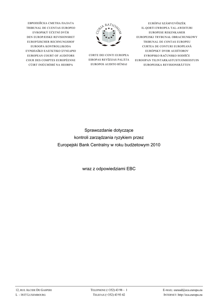 ЕВРОПЕЙСКА СМЕТНА ПАЛАТА EURÓPAI SZÁMVEVŐSZÉK TRIBUNAL DE CUENTAS EUROPEO IL-QORTI EWROPEA TAL-AWDITURI EVROPSKÝ ÚČETNÍ DVŮR EUROPESE REKENKAMER DEN EUROPÆISKE REVISIONSRET EUROPEJSKI TRYBUNAŁ OBRACHUNKOWY EUROPÄISCHER RECHNUNGSHOF TRIBUNAL DE CONTAS EUROPEU EUROOPA KONTROLLIKODA CURTEA DE CONTURI EUROPEANĂ ΕΥΡΩΠΑΪΚΟ ΕΛΕΓΚΤΙΚΟ ΣΥΝΕΔΡΙO EURÓPSKY DVOR AUDÍTOROV EUROPEAN COURT OF AUDITORS CORTE DEI CONTI EUROPEA EVROPSKO RAČUNSKO SODIŠČE COUR DES COMPTES EUROPÉENNE EIROPAS REVĪZIJAS PALĀTA EUROOPAN TILINTARKASTUSTUOMIOISTUIN CÚIRT INIÚCHÓIRÍ NA HEORPA EUROPOS AUDITO RŪMAI EUROPEISKA REVISIONSRÄTTEN Sprawozdanie dotyczące kontroli zarządzania ryzykiem przez Europejski Bank Centralny w roku budżetowym 2010 wraz z odpowiedziami EBC 12, RUE ALCIDE DE GASPERI L - 1615 LUXEMBOURG TELEPHONE (+352) 43 98 – 1 TELEFAX (+352) 43 93 42 E-MAIL: [email protected] INTERNET: http://eca.europa.eu 2 SPIS TREŚCI Punkt Wprowadzenie 1-4 Zakres kontroli i podejście kontrolne 5-6 Ustalenia kontroli 7 - 91 Czy EBC ustanowił odpowiedni i kompleksowy system zarządzania ryzykiem? 7 - 18 System zarządzania ryzykiem ogólnym 8 - 14 Ujawnianie systemu zarządzania ryzykiem EBC podmiotom zewnętrznym 15 - 18 Czy EBC zarządzał swoim ryzykiem operacyjnym w efektywny sposób? 19 - 66 Zarządzanie ryzykiem operacyjnym 20 - 39 Zarządzanie ciągłością działania EBC 40 - 66 Czy EBC skutecznie zarządzał swoim ryzykiem finansowym? 67 - 91 System zarządzania ryzykiem finansowym w zakresie inwestycji i operacji strategicznych 69 - 74 Metodyka zarządzania ryzykiem finansowym 75 - 83 Stosowanie metodyki zarządzania ryzykiem finansowym 84 - 88 Adekwatność sprawozdawczości w zakresie ryzyka finansowego 89 - 91 Wnioski i zalecenia 92 - 100 Czy EBC ustanowił odpowiednie i spójne ramy zarządzania ryzykiem? 92 - 93 Czy EBC skutecznie zarządzał swoim ryzykiem operacyjnym? 94 - 98 Czy EBC skutecznie zarządzał swoim ryzykiem finansowym? 99 - 100 IPB003773PL05-11PP-CH157-11APCFINC1-RAS-ECB_2010-TR.DOC 27.3.2012 3 WYKAZ SKRÓTÓW BCM BCP BIA BIS CBPP CRO D-CO DG-A DG-H DG-IS DG-M DG-P DG-S EB EBC ESBC FOS GIPS INV MOS MSR MSSF NCBs ORC OFM ORM RMA RMSR SMP VaR ZPW Zarządzanie ciągłością działania Plan ciągłości działania Analiza wpływu na działalność Bank Rozrachunków Międzynarodowych Program zakupu zabezpieczonych obligacji Główny specjalista ds. zarządzania ryzykiem Dyrekcja Komunikacji Dyrekcja Generalna Administracji Dyrekcja Generalna Kadr, Budżetu i Organizacji Dyrekcja Generalna Systemów Informatycznych Dyrekcja Generalna Operacji Rynkowych Dyrekcja Generalna ds. Systemów Płatności Dyrekcja Generalna Statystyki Zarząd Europejski Bank Centralny Europejski System Banków Centralnych Usługi w zakresie operacji finansowych Międzynarodowe standardy prezentacji wyników inwestycyjnych Dział inwestycyjny Systemy operacji rynkowych Międzynarodowe Standardy Rachunkowości Międzynarodowe Standardy Sprawozdawczości Finansowej Krajowe Banki Centralne Komisja ds. Ryzyka Operacyjnego Zarządzanie funduszami własnymi Zarządzanie ryzykiem operacyjnym Dział zarządzania ryzykiem (DG-H) Rada Międzynarodowych Standardów Rachunkowości Program dotyczący rynków papierów wartościowych Wartość zagrożona Zbiór procedur wewnętrznych IPB003773PL05-11PP-CH157-11APCFINC1-RAS-ECB_2010-TR.DOC 27.3.2012 4 WPROWADZENIE 1. Europejski Bank Centralny (EBC) wraz z krajowymi bankami centralnymi wszystkich państw członkowskich Unii Europejskiej (UE) tworzą Europejski System Banków Centralnych (ESBC). Głównym celem ESBC jest utrzymanie stabilności cen. ESBC wspiera także ogólne polityki gospodarcze UE, mając na względzie przyczynianie się do osiągnięcia celów UE 1. W związku z tym EBC wykonuje zadania określone w statucie 2 i odpowiada za zarządzanie swoją działalnością i finansami. 2. Podstawę przeprowadzania przez Europejski Trybunał Obrachunkowy (ETO) kontroli skuteczności zarządzania EBC stanowi art. 27 ust. 2 Protokołu w sprawie Statutu ESBC i EBC 3. Kontrola za rok 2010 obejmuje procedury i systemy zarządzania ryzykiem ustanowione przez EBC oraz ich zastosowanie. 3. Organami decyzyjnymi EBC są Rada Prezesów i Zarząd 4. Zarząd realizuje politykę pieniężną zgodnie z wytycznymi i postanowieniami Rady Prezesów 5. Spoczywa na nim ogólna odpowiedzialność za zarządzanie bieżącą działalnością EBC i jego zasobami. Na Zarządzie spoczywa ostateczna odpowiedzialność za zarządzanie ryzykiem w EBC. 1 Art. 127 ust. 1 Traktatu o funkcjonowaniu Unii Europejskiej. 2 Statut ESBC oraz EBC jest protokołem załączonym do Traktatu. 3 Art. 27 ust. 2 protokołu w sprawie Statutu Europejskiego Systemu Banków Centralnych i Europejskiego Banku Centralnego stanowi: „Postanowienia artykułu 287 Traktatu o funkcjonowaniu Unii Europejskiej stosują się tylko do badania skuteczności zarządzania EBC”. 4 Art. 9 ust. 3 Protokołu w sprawie Statutu ESBC i EBC. W skład Rady Prezesów wchodzi sześciu członków Zarządu oraz prezesi banków centralnych państw członkowskich strefy euro. W skład Zarządu wchodzą: prezes, wiceprezes i czterej inni członkowie. 5 Art. 12 ust. 1 Protokołu w sprawie Statutu ESBC i EBC. IPB003773PL05-11PP-CH157-11APCFINC1-RAS-ECB_2010-TR.DOC 27.3.2012 5 4. Ryzykiem w EBC zarządza się poprzez dwie osobne struktury. Dział zarządzania ryzykiem operacyjnym (ORM 6/BCM) odpowiada za wszystkie rodzaje ryzyka operacyjnego (zob. przyp. 22) w tym również za ciągłość działania. Dział zarządzania ryzykiem (RMA) odpowiada za zarządzanie ryzykiem finansowym (zob. pkt 70), w tym za działalność inwestycyjną EBC oraz operacje kredytowe. ZAKRES KONTROLI I PODEJŚCIE KONTROLNE 5. Celem kontroli Trybunału za rok budżetowy 2010 była ocena adekwatności ustanowionego przez EBC systemu zarządzania ryzykiem finansowym i operacyjnym 7. Zarządzanie ryzykiem w EBC było 