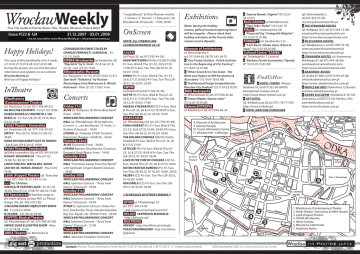 WrocławWeekly Free City Guide to Events, Music, Film, Theatre, Museum, Pubs & More Issue #123 & 124 21.12.2007 - 03.01.2008 > we are now online: www.WroclawWeekly.pl > [email protected] Happy Holidays! This issue of WrocławWeekly is for 2 weeks (21.12.07-27.12.07 & 28.12.07-03.01.08). During this period, you can find the latest information and updates on our website: WroclawWeekly.pl Wish you all happy holidays! InTheatre Współczesny (Contemporary) Theatre (ul. Rzeźnicza 12, tel. 071/ 358-89-22) Na wsi (The Country) - Fri (21.12) 19:00 Księga Rodzaju 2 (Бытие № 2 / Genesis: 2) - Fri-Sun (28-30.12) 19:15; Mon (31.12) 21:00 Polski Theatre / Kameralna (ul. Świdnicka 28, tel. 071/ 316-07-52) Smycz - Thu (27.12) 19:00; Fri (28.12) 19:00 Okno na Parlament (Out of Order) - Sat & Sun (29 & 30.12) 19:00 Polski Theatre / Świebodzki (pl.Orląt Lwowskich 20c,tel.071/341-29-54) Dziady: Ekshumacja - Thu (27.12) 19:00; Fri (28.12) 19:00 LINCZ: Pani Aoi. Wachlarz. Szafa (Aoi-no Ue. Hanjo. Dojoji) - Thu (3.01) 19:00 Lalek (Puppet) Theatre (pl. Teatralny 4, tel. 071/ 344-76-77, 344-12-16) >>> For Children: Mikołaj w Teatrze Lalek - Fri (21.12) 10:00; Thu (27.12) 17:00; Fri (28.12) 17:00 Ad Spectatores (Chamber stage at the main railway station PKP, ul. Piłsudskiego 103, tel. 502-210-735) 3 żelazne zasady mężczyzny seniora - Fri (29.12) 20:00 O-płatek - Sat (30.12) 20:00 CAPITOL Musical Theatre (ul. Piłsudskiego 67, tel. 071/789-04-00) Swing! Duke Ellington Show - Mon (31.12) 18:00, 21:00 ARKA Theatre (ul. Mennicza 3) Czarodziejski świat (Tales by Charles Perrault) / A Musical - Fri (21.12) 10:00 OPERA Wrocławska (ul.Świdnicka 35) “Rigoletto” by G. Verdi - Fri & Sat (21 & 22.12) ; Sun (23.12) 17:00 Ethnographic Museum (ul. Traugutta 111/113, tel.071/342-12-67) Spectacle “Kolędnicy” by Russian Musicologue Irina Niekrasova & Witold Kozlowski - Mon (31.12) 11:00 / Free Concerts Friday 21st ALIVE (ul. Kolejowa 12) Birma Blue Band (Free) - 20:00 WROCŁAW PHILHARMONIC CONCERT HALL (ul. Piłsudskiego 19) Symphonic Concert - L. van Beethoven / P. Vasks / J. Brahms (Classical) - 19:00 ŁYKEND (ul. Podwale 37/38) Tisztelet, Nestaman (Reggae: 10/8PLN) - 20:00 Saturday 22nd ALIVE Elucktrick (Free) - 20:00 ŁYKEND Bastion, Diasthaema, Cinamon, Entropia (Rock/Metal: Free) - 19:00 Saturday 29th WROCŁAW PHILHARMONIC CONCERT HALL “Christmas Songs From the World” with Spirituals Singers Band (Classical) - 18:00 Sunday 30th WROCŁAW PHILHARMONIC CONCERT HALL Sylvester Concert - “Arias from Opera” (Classical) - 18:00 Monday 31st WROCŁAW PHILHARMONIC CONCERT HALL Sylvester Concert - “Arias from Opera” (Classical) - 18:00 RYNEK St. Sylvester Concert: Doda, Perfect, Stachursky, Piersi, Natalia Kukulska, Big-Cyc, Kayah, etc. (Polish: Free) - 20:00 WROCŁAW PHILHARMONIC CONCERT HALL Sylvester Concert - “Arias from Opera” (Classical) - 21:00 Tuesday 1st WROCŁAW PHILHARMONIC CONCERT HALL Wrocław Chamber Orchestra “Leopoldinum” & Piotr Pławner (violin) - J. Strauss / F. Kreisler / J. Massenet / M. Moszkowski (Classical) - 17:00, 20:00 OnScreen [Note: All Cinemas Are Closed On Monday 24.12] LALKA (ul.Prusa 32, tel.071/792-44-05) Nightwatching (FR/NL/CA/DE/PL/GB) Fri-Sun, Wed & Thu (21-23, 26 & 27.12) 17:00 // Fri-Sun, Tue-Thu (28-30.12, 0103.01) 17:00 Hania (PL) Fri-Sun, Wed & Thu (21-23, 26 & 27.12) 20:00 // Fri-Sun, Tue-Thu (2830.12, 01-03.01) 20:00 LWOW (ul.Hallera15,tel.071/793-50-78) Katyń (PL) Fri-Sun, Wed & Thu (21-23, 26 & 27.12) 17:00 // Fri-Sun, Tue-Thu (2830.12, 01-03.01) 17:00 Kráska v nesnázích (CZ) Fri-Sun, Wed & Thu (21-23, 26 & 27.12) 19:30 // Fri-Sun, Tue-Thu (28-30.12, 01-03.01) 19:30 Exhibitions > “Joanna Nowek / Uśpieni” (07.12.0728.12.07) MLECZARNIA (ul.Włodkowica5) > “Tasz Yoke / Hotel” (10.12.07-??) FIRLEJ (ul. Grabiszyńska 56) > “Krzysztof Saj / Fotografie Miejskie” [Note: during the holiday season, gallery/museum opening hours will be irregular - Please check their holiday schedules at the Tourist Information Centre (Rynek)] (13.12.07-31.01.08) FORMATY (ul. Samborska 3-5) > “Lech Basel / Blisko Jazzu (Close to Jazz)” (10.11.07-03.01.08) Museum of Architecture Cultural Centre “ZAMEK” ul. Bernardynska 5 tel. 071/344-82-78/79, 343-36-75 > “One Project Gallery - Polish Architecture in the Beginning of 21st Century” (11.10.07-13.01.08) > “When Great Art is Too Great - The Work and Output of APA Kurylowicz & Associates” (15.10.07-18.01.08) > “Architectural Design Competition for Wroclaw City Stadium” (22.11.07-23.12.07) (pl. Świętojański 1, Leśnica) > “Barbara Panek-Sarnowska / Ogrody II” (14.12.07-15.01.08) FindUsHere > Hotel Tumski (Wyspa Słodowa 10, tel.071/322-60-88/99) [email protected] http://www.hotel-tumski.com.pl > ART HOTEL (ul. Kiełbaśnicza 20, tel. 071/ 78-77-100) http://www.arthotel.pl > Hotel Mercure Panorama BWA Awangarda ul. Wita Stwosza 32, tel. 071/790-25-82 > “Antoni Wajda / Darmo-wino” (12.12.07–27.01.08) Galeria ENTROPIA ul. Rzeźnicza 4, tel. 071/344-46-34 (pl. Dominikański 1, tel.071/323-27-00) [email protected] > The Stranger Hostel (ul. Kołłątaja 16/3, tel.071/344-12-06) [email protected] http://www.thestrangerhostel.com > MLECZARNIA Hostel (ul. Włodkowica 5, tel.071/787-75-70) [email protected] http://www.mleczarniahostel.pl > Cinnamon Hostel (ul. Kazimierza Wielkiego 67, tel.071/344-58-58) [email protected] http://www.cinnamonhostel.com > AKADEMIA RUCHU (ul. Ruska 47-48A, tel.071/793-29-38) [email protected] http://www. akademiaruchu.com.pl > Wrocław INFO (Sukiennice 12,Rynek) [email protected] > Zamek Kliczków (Kliczków 8, 59-724 Osiecznica, tel.075/73-40-700 thru 702) [email protected] http://www.kliczkow.com.pl WARSZAWA (ul. Piłsudskiego 64, tel. 071/792-43-83) Pora umierać (PL) Fri-Sun, Wed & Thu (21-23, 26 & 27.12) 16:00, 20:00 // Fri-Sun, Tue-Thu (28-30.12, 01-03.01) 18:00 The Golden Compass (GB/US: Polish Dubbed) Fri-Sun, Wed & Thu (21-23, 26 & 27.12) 17:00 Sz