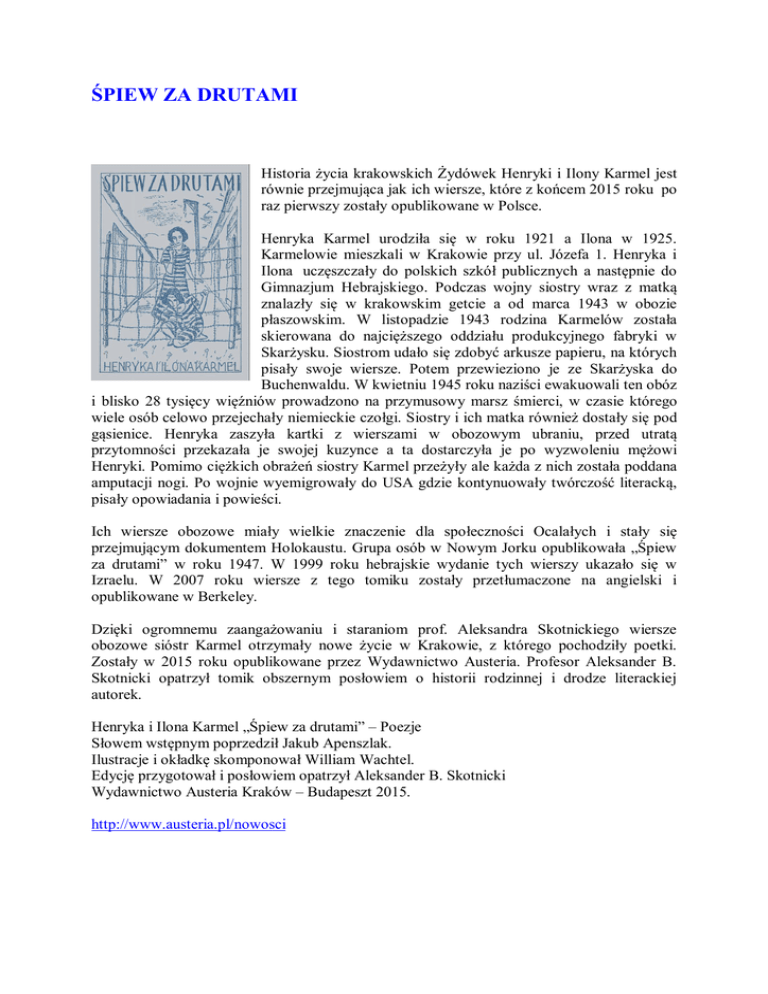 ŚPIEW ZA DRUTAMI Historia życia krakowskich Żydówek Henryki i Ilony Karmel jest równie przejmująca jak ich wiersze, które z końcem 2015 roku po raz pierwszy zostały opublikowane w Polsce. Henryka Karmel urodziła się w roku 1921 a Ilona w 1925. Karmelowie mieszkali w Krakowie przy ul. Józefa 1. Henryka i Ilona uczęszczały do polskich szkół publicznych a następnie do Gimnazjum Hebrajskiego. Podczas wojny siostry wraz z matką znalazły się w krakowskim getcie a od marca 1943 w obozie płaszowskim. W listopadzie 1943 rodzina Karmelów została skierowana do najcięższego oddziału produkcyjnego fabryki w Skarżysku. Siostrom udało się zdobyć arkusze papieru, na których pisały swoje wiersze. Potem przewieziono je ze Skarżyska do Buchenwaldu. W kwietniu 1945 roku naziści ewakuowali ten obóz i blisko 28 tysięcy więźniów prowadzono na przymusowy marsz śmierci, w czasie którego wiele osób celowo przejechały niemieckie czołgi. Siostry i ich matka również dostały się pod gąsienice. Henryka zaszyła kartki z wierszami w obozowym ubraniu, przed utratą przytomności przekazała je swojej kuzynce a ta dostarczyła je po wyzwoleniu mężowi Henryki. Pomimo ciężkich obrażeń siostry Karmel przeżyły ale każda z nich została poddana amputacji nogi. Po wojnie wyemigrowały do USA gdzie kontynuowały twórczość literacką, pisały opowiadania i powieści. Ich wiersze obozowe miały wielkie znaczenie dla społeczności Ocalałych i stały się przejmującym dokumentem Holokaustu. Grupa osób w Nowym Jorku opublikowała „Śpiew za drutami” w roku 1947. W 1999 roku hebrajskie wydanie tych wierszy ukazało się w Izraelu. W 2007 roku wiersze z tego tomiku zostały przetłumaczone na angielski i opublikowane w Berkeley. Dzięki ogromnemu zaangażowaniu i staraniom prof. Aleksandra Skotnickiego wiersze obozowe sióstr Karmel otrzymały nowe życie w Krakowie, z którego pochodziły poetki. Zostały w 2015 roku opublikowane przez Wydawnictwo Austeria. Profesor Aleksander B. Skotnicki opatrzył tomik obszernym posłowiem o historii rodzinnej i drodze literackiej autorek. Henryka i Ilona Karmel „Śpiew za drutami” – Poezje Słowem wstępnym poprzedził Jakub Apenszlak. Ilustracje i okładkę skomponował William Wachtel. Edycję przygotował i posłowiem opatrzył Aleksander B. Skotnicki Wydawnictwo Austeria Kraków – Budapeszt 2015. http://www.austeria.pl/nowosci