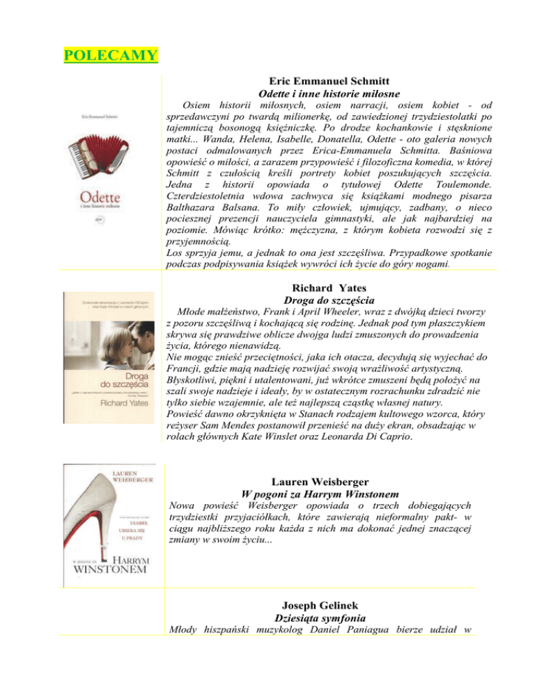POLECAMY Eric Emmanuel Schmitt Odette i inne historie miłosne Osiem historii miłosnych, osiem narracji, osiem kobiet - od sprzedawczyni po twardą milionerkę, od zawiedzionej trzydziestolatki po tajemniczą bosonogą księŜniczkę. Po drodze kochankowie i stęsknione matki... Wanda, Helena, Isabelle, Donatella, Odette - oto galeria nowych postaci odmalowanych przez Erica-Emmanuela Schmitta. Baśniowa opowieść o miłości, a zarazem przypowieść i filozoficzna komedia, w której Schmitt z czułością kreśli portrety kobiet poszukujących szczęścia. Jedna z historii opowiada o tytułowej Odette Toulemonde. Czterdziestoletnia wdowa zachwyca się ksiąŜkami modnego pisarza Balthazara Balsana. To miły człowiek, ujmujący, zadbany, o nieco pociesznej prezencji nauczyciela gimnastyki, ale jak najbardziej na poziomie. Mówiąc krótko: męŜczyzna, z którym kobieta rozwodzi się z przyjemnością. Los sprzyja jemu, a jednak to ona jest szczęśliwa. Przypadkowe spotkanie podczas podpisywania ksiąŜek wywróci ich Ŝycie do góry nogami. Richard Yates Droga do szczęścia Młode małŜeństwo, Frank i April Wheeler, wraz z dwójką dzieci tworzy z pozoru szczęśliwą i kochającą się rodzinę. Jednak pod tym płaszczykiem skrywa się prawdziwe oblicze dwojga ludzi zmuszonych do prowadzenia Ŝycia, którego nienawidzą. Nie mogąc znieść przeciętności, jaka ich otacza, decydują się wyjechać do Francji, gdzie mają nadzieję rozwijać swoją wraŜliwość artystyczną. Błyskotliwi, piękni i utalentowani, juŜ wkrótce zmuszeni będą połoŜyć na szali swoje nadzieje i ideały, by w ostatecznym rozrachunku zdradzić nie tylko siebie wzajemnie, ale teŜ najlepszą cząstkę własnej natury. Powieść dawno okrzyknięta w Stanach rodzajem kultowego wzorca, który reŜyser Sam Mendes postanowił przenieść na duŜy ekran, obsadzając w rolach głównych Kate Winslet oraz Leonarda Di Caprio. Lauren Weisberger W pogoni za Harrym Winstonem Nowa powieść Weisberger opowiada o trzech dobiegających trzydziestki przyjaciółkach, które zawierają nieformalny pakt- w ciągu najbliŜszego roku kaŜda z nich ma dokonać jednej znaczącej zmiany w swoim Ŝyciu... Joseph Gelinek Dziesiąta symfonia Młody hiszpański muzykolog Daniel Paniagua bierze udział w koncercie, podczas którego zostaje wykonana rekonstrukcja pierwszej części X Symfonii Ludwiga van Beethovena i zaczyna podejrzewać, iŜ autor tej rekonstrukcji, Ronald Thomas, być moŜe jest w posiadaniu oryginału dzieła. Wkrótce Thomas zostaje bestialsko zamordowany - mordercy odcinają swojej ofierze głowę, na której jest wytatuowana sekwencja muzyczna. Daniel Paniagua zostaje wciągnięty w wir zaskakujących wydarzeń, piętrzących się zagadek, tajemniczych przypadków, które kolejno odsłaniają nieznane fakty z biografii Ludwiga van Beethovena Roberto Saviano Gomorra Gomorra przyniosła autorowi, 27-letniemu Robertowi Saviano wielki sukces literacki, ale naraziła jego Ŝycie na tak powaŜne niebezpieczeństwo, Ŝe władze przydzieliły mu ochronę, a pisarz na jakiś czas musiał opuścić Neapol. W swojej niezwykłej, wielogatunkowej pracy Saviano opisuje nowe mechanizmy działania kamory neapolitańskiej, która w ostatnich latach niepostrzeŜenie oplotła swymi mackami praktycznie cały świat. Ukazuje wielkie imperia finansowe, które powstały na międzynarodowym handlu bronią i narkotykami, na agresywnej, nielegalnej konkurencji, na szantaŜach, wymuszeniach, korupcji i morderstwach. Opisując świat mafii, wojny między klanami, vendetty, killerów i dealerów, Saviano dowodzi, Ŝe neapolitańska kamora pod względem liczebności, siły ekonomicznej i bezwzględności jest znacznie silniejsza i potęŜniejsza niŜ sławna mafia sycylijska i inne zorganizowane grupy przestępcze południowych Włoch. Gomorra odniosła wielki sukces w wielu krajach Europy; w listopadzie 2007 roku znalazła się na liście 100 najlepszych ksiąŜek non fiction ogłaszanej kaŜdego roku przez New York Times. Recenzent tego dziennika określił jej autora jako „Salmana Rushdiego w walce przeciw przestępczości zorganizowanej”. NOWOŚCI KSIĄZKOWE – WYPOśYCZALNIA DLA DOROSŁYCH Graham Masterton Bazyliszek Robin Cook Ciało obce Helena Kowalik Córka Kaina Emily Griffin Coś poŜyczonego Emily Griffin Dziecioodporna Terry Pratchett Eryk Terry Pratchett Nauka Świata Dysku III Pisarzewska K. Halo, Wikta! Opfer H. Kato – tata nie pamiętnik Anonim Księga bez tytułu T. Isakowicz – Zalewski Moje Ŝycie nielegalne Bogusław Wołoszański Testament Odessy Wisława Szymborska Tutaj E. E. Schmitt Odette i inne historie miłosne Ewa Woydyłło Poprawka z matury M. Krajewski, M. Czubaj RóŜe cmentarne Nora Roberts Pieśń śmierci Nora Roberts Z nakazu serca Nora Roberts Słodka śmierć Joanna Chmielewska Zwyczajne Ŝycie Richard Yates Droga do szczęścia Joseph Gelinek Dziesiąta symfonia Jodi Picaoultt Dziewiętnaście minut Paulo Coelho Największy dar Roberto Saviano Gomorra Gdzie teraz jesteś Tadeusz śuczkowski Torowisko Jacek Dehnel Balzakiana Sławomir Młynarczyk Berber Olga Rudnicka Martwe jezioro Agnieszka Kacprzyk \ Matylda J.M.G. Le Clezio Protokół Jayne Ann Krentz Siódmy zmysł Lauren Weisberger W pogoni za Harrym Winstonem Karen Robards Winna Mary Higgins Clark Dean Koontz Niezniszczalny Jerzy Stuhr Stuhrowie historie rodzinne Stephenie Meyer Zmierzch Joy Fielding Zabójcze piękno Stephenie Meyer KsięŜyc w nowiu Stephenie Meyer Zaćmienie Sandra Brown Huragan miłości Stephenie Meyer Intruz Sue Monk Sekretne śycie Pszczół Jan Grzegorczyk Jan Grzegorczyk Jan Grzegorczyk Przypadki księdza Grosera Przypadki księdza Grosera Przypadki księdza Grosera Adieu Trufle Cudze pole David Weber Bolo! Antoni Libera Godot i jego cień Marek Edelman I była miłość w getcie Schache Rue Magnetyzm serca Dorota Masłowska Między nami dobrze jest John Grisham Prawnik Ewa Stec Romans z trupem w tle Anna 