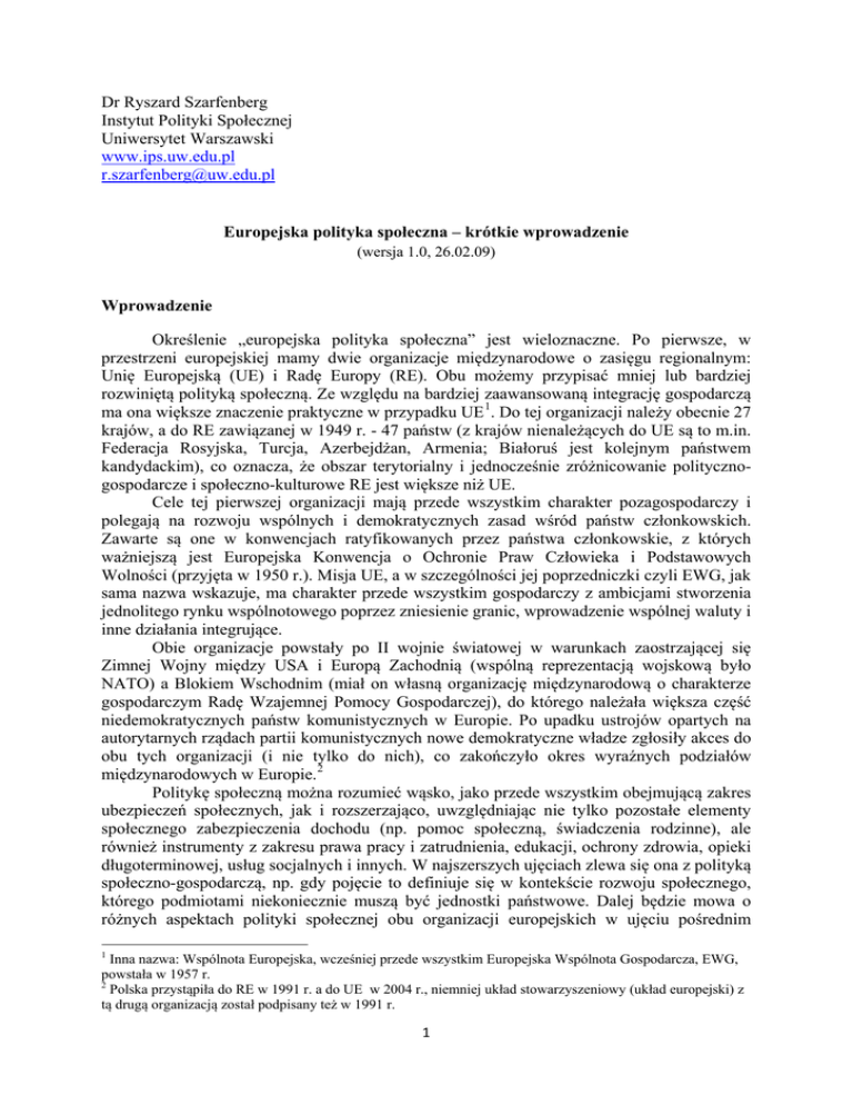 Dr Ryszard Szarfenberg Instytut Polityki Społecznej Uniwersytet Warszawski www.ips.uw.edu.pl [email protected] Europejska polityka społeczna – krótkie wprowadzenie (wersja 1.0, 26.02.09) Wprowadzenie Określenie „europejska polityka społeczna” jest wieloznaczne. Po pierwsze, w przestrzeni europejskiej mamy dwie organizacje międzynarodowe o zasięgu regionalnym: Unię Europejską (UE) i Radę Europy (RE). Obu możemy przypisać mniej lub bardziej rozwiniętą polityką społeczną. Ze względu na bardziej zaawansowaną integrację gospodarczą ma ona większe znaczenie praktyczne w przypadku UE 1. Do tej organizacji należy obecnie 27 krajów, a do RE zawiązanej w 1949 r. - 47 państw (z krajów nienależących do UE są to m.in. Federacja Rosyjska, Turcja, Azerbejdżan, Armenia; Białoruś jest kolejnym państwem kandydackim), co oznacza, że obszar terytorialny i jednocześnie zróżnicowanie politycznogospodarcze i społeczno-kulturowe RE jest większe niż UE. Cele tej pierwszej organizacji mają przede wszystkim charakter pozagospodarczy i polegają na rozwoju wspólnych i demokratycznych zasad wśród państw członkowskich. Zawarte są one w konwencjach ratyfikowanych przez państwa członkowskie, z których ważniejszą jest Europejska Konwencja o Ochronie Praw Człowieka i Podstawowych Wolności (przyjęta w 1950 r.). Misja UE, a w szczególności jej poprzedniczki czyli EWG, jak sama nazwa wskazuje, ma charakter przede wszystkim gospodarczy z ambicjami stworzenia jednolitego rynku wspólnotowego poprzez zniesienie granic, wprowadzenie wspólnej waluty i inne działania integrujące. Obie organizacje powstały po II wojnie światowej w warunkach zaostrzającej się Zimnej Wojny między USA i Europą Zachodnią (wspólną reprezentacją wojskową było NATO) a Blokiem Wschodnim (miał on własną organizację międzynarodową o charakterze gospodarczym Radę Wzajemnej Pomocy Gospodarczej), do którego należała większa część niedemokratycznych państw komunistycznych w Europie. Po upadku ustrojów opartych na autorytarnych rządach partii komunistycznych nowe demokratyczne władze zgłosiły akces do obu tych organizacji (i nie tylko do nich), co zakończyło okres wyraźnych podziałów międzynarodowych w Europie. 2 Politykę społeczną można rozumieć wąsko, jako przede wszystkim obejmującą zakres ubezpieczeń społecznych, jak i rozszerzająco, uwzględniając nie tylko pozostałe elementy społecznego zabezpieczenia dochodu (np. pomoc społeczną, świadczenia rodzinne), ale również instrumenty z zakresu prawa pracy i zatrudnienia, edukacji, ochrony zdrowia, opieki długoterminowej, usług socjalnych i innych. W najszerszych ujęciach zlewa się ona z polityką społeczno-gospodarczą, np. gdy pojęcie to definiuje się w kontekście rozwoju społecznego, którego podmiotami niekoniecznie muszą być jednostki państwowe. Dalej będzie mowa o różnych aspektach polityki społecznej obu organizacji europejskich w ujęciu pośrednim Inna nazwa: Wspólnota Europejska, wcześniej przede wszystkim Europejska Wspólnota Gospodarcza, EWG, powstała w 1957 r. 2 Polska przystąpiła do RE w 1991 r. a do UE w 2004 r., niemniej układ stowarzyszeniowy (układ europejski) z tą drugą organizacją został podpisany też w 1991 r. 1 1 (więcej niż tylko zabezpieczenie społeczne, ale już bez inicjatyw w zakresie czysto gospodarczym). Dotychczas łączono politykę społeczną głównie z działalnością państw narodowych, w związku z tym może pojawić się wątpliwość, czy organizacje wielu takich państw mogą mieć politykę w sferze społecznej niezależnie od tego, że mają ją poszczególne państwa wchodzące w skład danej organizacji. Dlatego w użyciu jest również określenie „wymiar społeczny UE” lub „europejski model społeczny”. Z powyższych względów bardziej uzasadnione jest stosowanie nazw „polityka społeczna UE”, „unijna polityka społeczna” lub „wspólnotowa polityka społeczna” i „polityka społeczna RE”, ewentualnie „wymiar społeczny UE” oraz „wymiar społeczny RE”. Dalej posługuję się tymi właśnie terminami. Polityka społeczna UE Żeby zrozumieć unijną politykę społeczną rozważmy hipotetyczny i uproszczony przykład dwóch graniczących ze sobą państw – A i B – z własnymi instytucjami polityki społecznej (PS), czyli obu możemy ją przypisać, w skrócie: PSA i PSB. Wyobraźmy sobie teraz, że przywódcy tych państw po długich negocjacjach postanowili zawiązać unię międzypaństwową UAB. Co się może stać z ich politykami społecznymi w wyniku takiej unii? Po pierwsze, może być ona oparta na umowie, w której wyraźnie stwierdzono, że UAB nie będzie miała żadnych kompetencji w dziedzinie polityki społecznej. Wówczas będziemy mieli organizację dwupaństwową bez wymiaru społecznego oraz dwie nadal niezależne od siebie PSA i PSB. Załóżmy jednak, że oba państwa postanowią zrezygnować ze swoich kompetencji w dziedzinie polityki społecznej i przekażą je UAB. Wówczas wszystkie zadania społeczne przejmie unia, a państwa A i B przestaną mieć własną politykę społeczną. Można to rozumieć nie tyle w sensie całkowitego braku jakichkolwiek kompetencji, ale jako bezwzględne podporządkowanie społecznej polityki obu państw polityce unijnej. Analogicznie, jak w bardziej scentralizowanym państwie polityka społeczna województwa podporządkowana jest polityce wyznaczanej przez rząd centralny. W praktyce i tak ogólne ramy polityki społecznej państwa określane są przez konstytucję i ustawy uchwalane przez władze centralne, w przypadku Unii byłaby to jej konstytucja i jej ustawy. Pomiędzy całkowitym brakiem unijnej polityki społecznej, a jej maksymalistyczną wersją w postaci całkowicie unijnej polityki społecznej (czyli unijnych ustaw, rozporządzeń z określonymi prawami pracowniczymi i socjalnymi obywateli gwarantowanymi na obszarze
