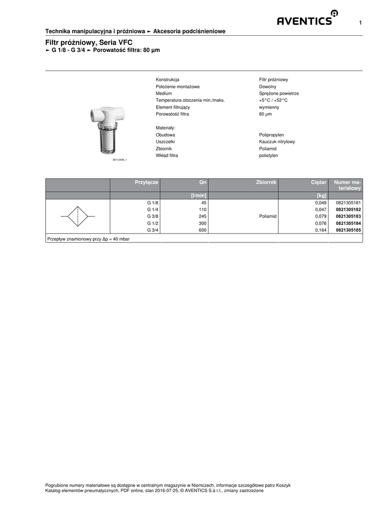 1 Technika manipulacyjna i próżniowa ► Akcesoria podciśnieniowe Filtr próżniowy, Seria VFC ► G 1/8 - G 3/4 ► Porowatość filtra: 80 µm Konstrukcja Filtr próżniowy Położenie montażowe Dowolny Medium Sprężone powietrze Temperatura otoczenia min./maks. +5°C / +52°C Element filtrujący wymienny Porowatość filtra 80 µm Materiały: 00112446_1 Obudowa Polipropylen Uszczelki Kauczuk nitrylowy Zbiornik Poliamid Wkład filtra polietylen Przyłącze G 1/8 Qn Zbiornik [l/min] Ciężar [kg] Numer materiałowy 45 0,049 0821305181 G 1/4 110 0,047 0821305182 G 3/8 245 0,079 0821305183 G 1/2 300 0,076 0821305184 G 3/4 600 0,164 0821305185 Poliamid Przepływ znamionowy przy Δp = 40 mbar Pogrubione numery materiałowe są dostępne w centralnym magazynie w Niemczech, informacje szczegółowe patrz Koszyk Katalog elementów pneumatycznych, PDF online, stan 2016-07-25, © AVENTICS S.à r.l., zmiany zastrzeżone 2 Technika manipulacyjna i próżniowa ► Akcesoria podciśnieniowe Filtr próżniowy, Seria VFC ► G 1/8 - G 3/4 ► Porowatość filtra: 80 µm wykresy (przepływy ilościowe) 00115823 Rozmiary 00115824 Pogrubione numery materiałowe są dostępne w centralnym magazynie w Niemczech, informacje szczegółowe patrz Koszyk Katalog elementów pneumatycznych, PDF online, stan 2016-07-25, © AVENTICS S.à r.l., zmiany zastrzeżone 3 Technika manipulacyjna i próżniowa ► Akcesoria podciśnieniowe Filtr próżniowy, Seria VFC ► G 1/8 - G 3/4 ► Porowatość filtra: 80 µm Numer materia- Przyłącze łowy G G A B C D Ciężar kg 0821305181 G 1/8 G 1/8 76 60 48 50 0821305182 G 1/4 G 1/4 76 60 48 50 0,049 0,047 0821305183 G 3/8 G 3/8 76 102 48 88 0,079 0821305184 G 1/2 G 1/2 76 102 48 88 0,076 0821305185 G 3/4 G 3/4 90,5 136,5 74,2 118 0,164 Pogrubione numery materiałowe są dostępne w centralnym magazynie w Niemczech, informacje szczegółowe patrz Koszyk Katalog elementów pneumatycznych, PDF online, stan 2016-07-25, © AVENTICS S.à r.l., zmiany zastrzeżone