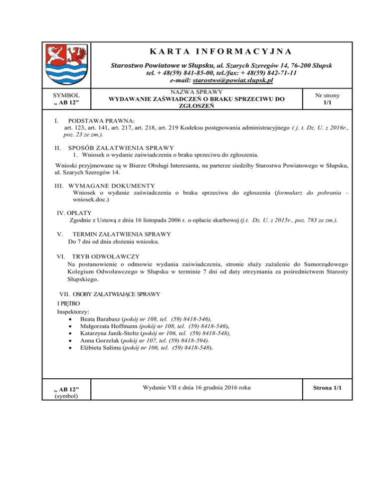 KARTA INFORMACYJNA Starostwo Powiatowe w Słupsku, ul. Szarych Szeregów 14, 76-200 Słupsk tel. + 48(59) 841-85-00, tel./fax: + 48(59) 842-71-11 e-mail: [email protected] SYMBOL „ AB 12” I. NAZWA SPRAWY WYDAWANIE ZAŚWIADCZEŃ O BRAKU SPRZECIWU DO ZGŁOSZEŃ Nr strony 1/1 PODSTAWA PRAWNA: art. 123, art. 141, art. 217, art. 218, art. 219 Kodeksu postępowania administracyjnego ( j. t. Dz. U. z 2016r., poz. 23 ze zm.). II. SPOSÓB ZAŁATWIENIA SPRAWY 1. Wniosek o wydanie zaświadczenia o braku sprzeciwu do zgłoszenia. Wnioski przyjmowane są w Biurze Obsługi Interesanta, na parterze siedziby Starostwa Powiatowego w Słupsku, ul. Szarych Szeregów 14. III. WYMAGANE DOKUMENTY Wniosek o wydanie zaświadczenia o braku sprzeciwu do zgłoszenia (formularz do pobrania – wniosek.doc.) IV. V. IV. OPŁATY Zgodnie z Ustawą z dnia 16 listopada 2006 r. o opłacie skarbowej (j.t. Dz. U. z 2015r., poz. 783 ze zm.). V. TERMIN ZAŁATWIENIA SPRAWY Do 7 dni od dnia złożenia wniosku. VI. TRYB ODWOŁAWCZY Na postanowienie o odmowie wydania zaświadczenia, stronie służy zażalenie do Samorządowego Kolegium Odwoławczego w Słupsku w terminie 7 dni od daty otrzymania za pośrednictwem Starosty Słupskiego. VII. OSOBY ZAŁATWIAJĄCE SPRAWY I PIĘTRO Inspektorzy: Beata Barabasz (pokój nr 108, tel. (59) 8418-546), Małgorzata Hoffmann (pokój nr 108, tel. (59) 8418-546), Katarzyna Janik-Stoltz (pokój nr 106, tel. (59) 8418-548), Anna Gorzelak (pokój nr 107, tel. (59) 8418-594). Elżbieta Sulima (pokój nr 106, tel. (59) 8418-548). „ AB 12” (symbol) Wydanie VII z dnia 16 grudnia 2016 roku Strona 1/1