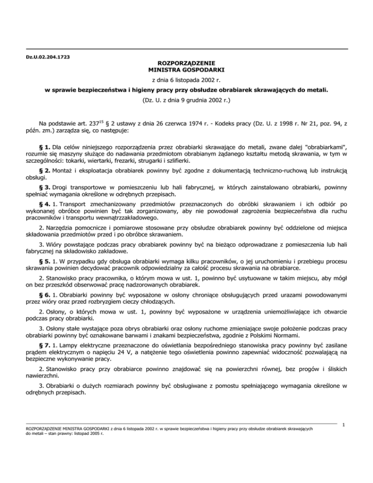 Dz.U.02.204.1723 ROZPORZĄDZENIE MINISTRA GOSPODARKI z dnia 6 listopada 2002 r. w sprawie bezpieczeństwa i higieny pracy przy obsłudze obrabiarek skrawających do metali. (Dz. U. z dnia 9 grudnia 2002 r.) Na podstawie art. 23715 § 2 ustawy z dnia 26 czerwca 1974 r. - Kodeks pracy (Dz. U. z 1998 r. Nr 21, poz. 94, z późn. zm.) zarządza się, co następuje: § 1. Dla celów niniejszego rozporządzenia przez obrabiarki skrawające do metali, zwane dalej "obrabiarkami", rozumie się maszyny służące do nadawania przedmiotom obrabianym żądanego kształtu metodą skrawania, w tym w szczególności: tokarki, wiertarki, frezarki, strugarki i szlifierki. § 2. Montaż i eksploatacja obrabiarek powinny być zgodne z dokumentacją techniczno-ruchową lub instrukcją obsługi. § 3. Drogi transportowe w pomieszczeniu lub hali fabrycznej, w których zainstalowano obrabiarki, powinny spełniać wymagania określone w odrębnych przepisach. § 4. 1. Transport zmechanizowany przedmiotów przeznaczonych do obróbki skrawaniem i ich odbiór po wykonanej obróbce powinien być tak zorganizowany, aby nie powodował zagrożenia bezpieczeństwa dla ruchu pracowników i transportu wewnątrzzakładowego. 2. Narzędzia pomocnicze i pomiarowe stosowane przy obsłudze obrabiarek powinny być oddzielone od miejsca składowania przedmiotów przed i po obróbce skrawaniem. 3. Wióry powstające podczas pracy obrabiarek powinny być na bieżąco odprowadzane z pomieszczenia lub hali fabrycznej na składowisko zakładowe. § 5. 1. W przypadku gdy obsługa obrabiarki wymaga kilku pracowników, o jej uruchomieniu i przebiegu procesu skrawania powinien decydować pracownik odpowiedzialny za całość procesu skrawania na obrabiarce. 2. Stanowisko pracy pracownika, o którym mowa w ust. 1, powinno być usytuowane w takim miejscu, aby mógł on bez przeszkód obserwować pracę nadzorowanych obrabiarek. § 6. 1. Obrabiarki powinny być wyposażone w osłony chroniące obsługujących przed urazami powodowanymi przez wióry oraz przed rozbryzgiem cieczy chłodzących. 2. Osłony, o których mowa w ust. 1, powinny być wyposażone w urządzenia uniemożliwiające ich otwarcie podczas pracy obrabiarki. 3. Osłony stałe wystające poza obrys obrabiarki oraz osłony ruchome zmieniające swoje położenie podczas pracy obrabiarki powinny być oznakowane barwami i znakami bezpieczeństwa, zgodnie z Polskimi Normami. § 7. 1. Lampy elektryczne przeznaczone do oświetlania bezpośredniego stanowiska pracy powinny być zasilane prądem elektrycznym o napięciu 24 V, a natężenie tego oświetlenia powinno zapewniać widoczność pozwalającą na bezpieczne wykonywanie pracy. 2. Stanowisko pracy przy obrabiarce powinno znajdować się na powierzchni równej, bez progów i śliskich nawierzchni. 3. Obrabiarki o dużych rozmiarach powinny być obsługiwane z pomostu spełniającego wymagania określone w odrębnych przepisach. ROZPORZĄDZENIE MINISTRA GOSPODARKI z dnia 6 listopada 2002 r. w sprawie bezpieczeństwa i higieny pracy przy obsłudze obrabiarek skrawających do metali – stan prawny: listopad 2005 r. 1 4. W przypadku gdy podczas obsługi obrabiarki istnieje ryzyko poparzenia, pracodawca powinien wyposażyć te obrabiarki w osłony, a gdy jest to niemożliwe ze względów technicznych - wyposażyć pracowników w środki ochrony indywidualnej, zgodnie z odrębnymi przepisami. § 8. Jeżeli obrabiarki zostały zainstalowane przy przejściach przeznaczonych dla ruchu pracowników, przy drogach transportu wewnątrzzakładowego lub ustawione obok siebie, to obrabiarki te należy zabezpieczyć przed zagrożeniami stwarzanymi dla: 1) sąsiednich stanowisk pracy; 2) ruchu pracowników; 3) transportu wewnętrznego. § 9. Przed uruchomieniem obrabiarki należy sprawdzić stan techniczny jej zabezpieczeń. § 10. 1. Podczas przerw w pracy obrabiarki narzędzia skrawające powinny być odsunięte od obrabianego przedmiotu. 2. W przypadku zakończenia pracy lub unieruchomienia obrabiarki na czas dłuższy niż jedna zmiana robocza, wyłączniki główne i awaryjne powinny być zablokowane. § 11. 1. Jeżeli podczas pracy obrabiarki powstaje wiór wstęgowy, należy zastosować niezbędne środki techniczne, ograniczające zagrożenia związane z powstawaniem tego typu wiórów. 2. Do środków technicznych, o których mowa w ust. 1, należą przede wszystkim zgarniacze wiórów oraz mechaniczny transporter do usuwania wiórów bezpośrednio na składowisko zakładowe. 3. W przypadku braku technicznych możliwości zastosowania mechanicznego transportera, o którym mowa w ust. 2, obsługującego obrabiarkę należy wyposażyć w narzędzia pozwalające na bezpieczne usuwanie wiórów z obrabiarki. 4. Wióry powstające podczas pracy obrabiarki wyposażonej w zbiornik do ich gromadzenia powinny być systematyczne usuwane z tego zbiornika i przechowywane w miejscu i w sposób niestwarzający zagrożeń dla pracowników. 5. Niedopuszczalne jest usuwanie wiórów sprężonym powietrzem lub bez odpowiedniego narzędzia ręcznego. § 12. Do podnoszenia i zakładania przedmiotów przeznaczonych do obróbki, o masie powyżej 10 kg, powinny być stosowane urządzenia pomocnicze zmniejszające wysiłek pracownika. § 13. 1. Przedmiot w uchwycie obrabiarki, imadle lub w przyrządzie mocującym powinien być tak zamocowany, aby podczas pracy obrabiarki nie zmienił swego położenia i nie został wyrwany z elementu mocującego, w wyniku działania sił bezwładności lub sił skrawania. 2. Obrabiarki wyposażone w uchwyt hydrauliczny lub pneumatyczny powinny być wyposażone w urządzenia blokujące, uniemożliwiające wyrwanie zamocowanego przedmiotu w przypadku zaniku ciśnienia w układzie zasilania. 3. Uruchomienie urządzenia blokującego, o którym mowa w ust. 2, powinno uniemożliwiać kontynuowanie obróbki skrawaniem oraz być sygnalizowane sygnałem świetlnym lub dźwiękowym. § 14. 1. Podczas pracy obrabiarki: 1) stosowane nar