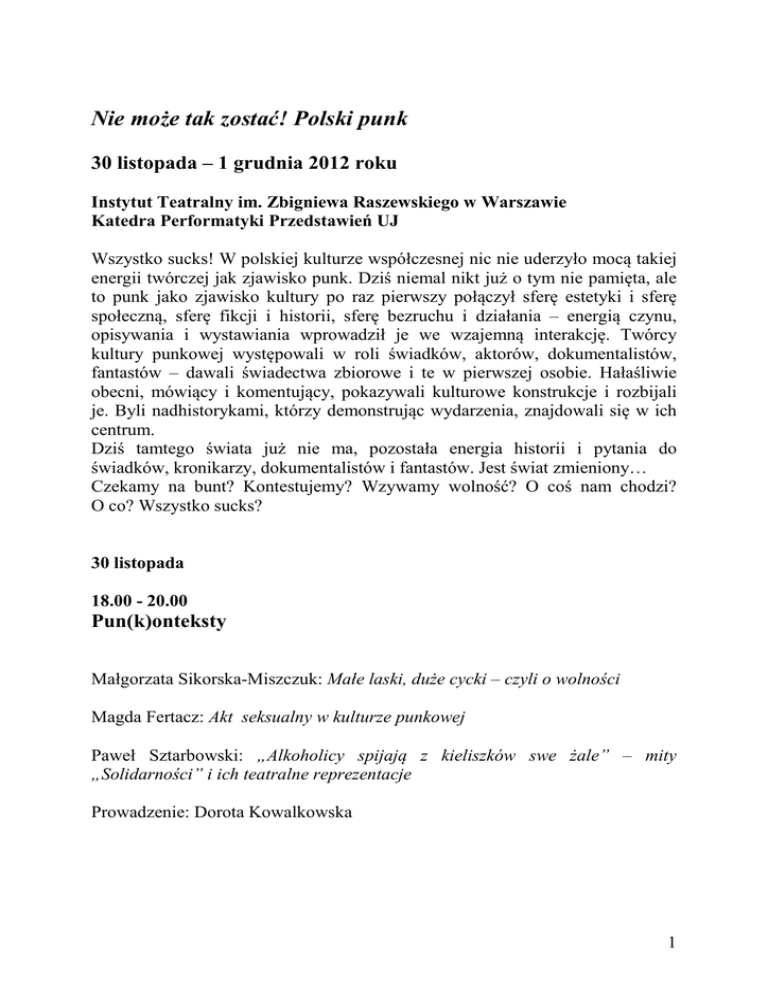 Nie może tak zostać! Polski punk 30 listopada – 1 grudnia 2012 roku Instytut Teatralny im. Zbigniewa Raszewskiego w Warszawie Katedra Performatyki Przedstawień UJ Wszystko sucks! W polskiej kulturze współczesnej nic nie uderzyło mocą takiej energii twórczej jak zjawisko punk. Dziś niemal nikt już o tym nie pamięta, ale to punk jako zjawisko kultury po raz pierwszy połączył sferę estetyki i sferę społeczną, sferę fikcji i historii, sferę bezruchu i działania – energią czynu, opisywania i wystawiania wprowadził je we wzajemną interakcję. Twórcy kultury punkowej występowali w roli świadków, aktorów, dokumentalistów, fantastów – dawali świadectwa zbiorowe i te w pierwszej osobie. Hałaśliwie obecni, mówiący i komentujący, pokazywali kulturowe konstrukcje i rozbijali je. Byli nadhistorykami, którzy demonstrując wydarzenia, znajdowali się w ich centrum. Dziś tamtego świata już nie ma, pozostała energia historii i pytania do świadków, kronikarzy, dokumentalistów i fantastów. Jest świat zmieniony… Czekamy na bunt? Kontestujemy? Wzywamy wolność? O coś nam chodzi? O co? Wszystko sucks? 30 listopada 18.00 - 20.00 Pun(k)onteksty Małgorzata Sikorska-Miszczuk: Małe laski, duże cycki – czyli o wolności Magda Fertacz: Akt seksualny w kulturze punkowej Paweł Sztarbowski: „Alkoholicy spijają z kieliszków swe żale” – mity „Solidarności” i ich teatralne reprezentacje Prowadzenie: Dorota Kowalkowska 1 20.30 Tam byliśmy - poharatane życiem książki Spotkanie z Pawłem Konjo Konnakiem i Krzysztofem Grabowskim Projekcja filmu w reżyserii Pawła Konnaka „Dezerter. Nie ma zagrożenia” 1 grudnia Pozabijać Was! - spojrzeniem młodości 15.00-17.30 Anna Matras: „Między nami dobrze jest” – ciało zbiorowe punkrockowego koncertu Justyna Stasiowska: Let's make some noise - dźwiękowe aspekty zagarniania przestrzeni społecznej w kulturze punkowej Katarzyna Peplińska: ,,Masz prawo do odmowy/I prawo do niezgody/ Odmawiaj i protestuj/Nie zgadzaj się, kontestuj…” Punk – performans oporu? Łukasz Zatorski: Tolkienowski elf czy Kafkowski rębajło? Performans twarzy Tomasza Budzyńskiego oraz spotkanie z członkami młodej punkrockowej kapeli Bigger Half Prowadzenie: Michał Pabian Historia, wspólnota i bunt 18.00 – 19.30 Prezentacja wystawy Krzysztofa Zygzaka Chojnackiego, wokalisty legendarnego punkowego zespołu TZN Xenna „Pamięć i Duma”, na którą składają się grafiki, zdjęcia i modele przedstawiające epizody z Powstania Warszawskiego. Wystawie towarzyszyła będzie rozmowa z Autorem, Krzysztofem Zygzakiem Chojnackim. Wstęp i prowadzenie: Łucja Iwanczewska 2 Kinopunk – wieczór filmowy 20.00 -Henryk Gajewski Tilt Back (1980) - Józef Robakowski Zapis energetyczny: Moskwa i moje oko... (1985) - Tomasz Sikorski Tratwa Meduzy (1982) - Akademia Ruchu Inne tańce, English Lesson (1982) - Mariusz Treliński (1983) Film o punkach - Michał Tarkowski Koncert (1982) - Piotr Łazarkiewicz Fala Jarocin 85 (1986) Każda z prezentacji filmowych poprzedzona będzie krótką relacją historyczną na temat powstania filmu i wydarzeń, o których rejestracje opowiadają. Miejsce: Instytut Teatralny im. Zbigniewa Raszewskiego w Warszawie Projekt przygotowali: dr Łucja Iwanczewska, dr Agata Adamiecka, Michał Pabian Organizatorzy: Instytut Teatralny im. Zbigniewa Raszewskiego w Warszawie, Katedra Performatyki Uniwersytet Jagielloński 3