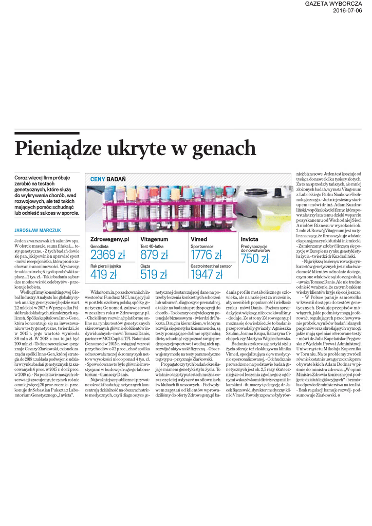 GAZETA WYBORCZA 2016-07-06 Pieniądze ukryte w genach Coraz więcej firm próbuje zarobić na testach genetycznych, które służą do wykrywania chorób, wad rozwojowych, ale też takich mających pomóc schudnąć lub odnieść sukces w sporcie. CENY BADAN JAROSŁAW MARCZUK Jeden z warszawskich salonów spa. W ofercie masaże, sauna fińska i.... te sty genetyczne. - Z tych badań dowie się pan, jaki powinien uprawiać sport - mówi recepcjonistka, która prosi o za chowanie anonimowości.Wystarczy, że oddam trochę śliny do probówki i za płacę... 2 tys. zl. - Takie badania są bar dzo modne wśród celebrytów - prze konuje kobieta. Według firmy konsultingowej Glo bal IndustryAnalysts Inc globalny ry nek analizygenetycznej będzie wart 2,2 mld dol. w 2017 r. Wprzypadku Pol ski brak dokładnych, niezależnych wy liczeń. Spółka kapitałowa Inno-Gene, która koncentruje się na inwestowa niu w testy genetyczne, twierdzi, że w 2015 r. jego wartość wyniosła 80 mln zl. W 2018 r. ma to już być 200 mln zł. - To daneszacunkowe - przy znaje Cezary Ziarkowski, członek za rządu spółki Inno-Gen, której strate gia do 2018 r.zakłada podwojenieudzia łu w rynku badań genetycznych (z sza cowanych 6 proc. w 2015 r. do12 proc. w 2018 r.). - Na podstawie naszych ob serwacji szacujemy, że rynek rośnie o mniej więcej 20 proc. rocznie - prze konuje dr Sebastian Pukszta z Labo ratorium Genetycznego „Invicta". Zdrowegeny.pl Vitagenum Vimed Invicta Genodieta Test 40-latka Sportsensor 2369 zl 879 zl 1776 zl Predyspozycje do nowotworów Rak piersi i jajnika Ciąża Gastrointestinal sensor 419 zl 519 zl 1947 zl Widać tom.in. po zachowaniach in westorów. Fundusz MCI, mającyjuż w portfelu czołową polską spółkę ge netyczną Genomed, zainwestował w zeszłym roku w Zdrowegeny.pl. - Chcieliśmy rozwinąć platformę on line na rynku testów genetycznych skierowanych głównie do klientów in dywidualnych - mówi Tomasz Danis, partnerwMCI Capital TFI. Natomiast Genomed w 2015 r. osiągnął wzrost przychodów o32 proc., choć spółka odnotowała raczejskromny zysk net to w wysokości nieco ponad 4 tys. zł. - Spowodowane tobyło głównie inwe stycjami w budowę drugiego labora torium - tłumaczy Danis. Najważniejsze publiczne i prywat ne ośrodki badań genetycznych kon centrują działalność naobszarach stric te medycznych, czyli diagnostyce ge netycznej dostarczającej dane na po trzeby leczenia konkretnych schorzeń lub zaburzeń, diagnostyce prenatalnej, a także nabadaniu predyspozycji do chorób. - To obszaryo największym po tencjale biznesowym - twierdzi dr Pu kszta. D rugim kierunkiem,w którym rozwija sięgenetyka konsumencka, są testypomagające dobrać optymalną dietę, schudnąć czypoznać swoje pre dyspozycje sportowe i według nich np. rozwijać aktywność fizyczną.- Obserwujemymodę na testy paramedyczne tego typu - przyznaje Ziarkowski. Propagatorzy tych badań określająje mianem genetyki stylu życia. To właśnie o tego typu testach można co raz częściej usłyszeć na siłowniach i w klubach fitnessowych. - Podwpły wem zapytań od klientów wprowadziliśmy do oferty Zdrowegeny.pl ba 750 zl dania profilu metabolicznego czło wieka, ale na razie jest za wcześnie, aby ocenić ich popularność iwielkość rynku - mówi Danis. - Poziom sprzedażyjest większy, niż oczekiwaliśmy - dodaje. Ze strony Zdrowegeny.pl można się dowiedzieć, że to badanie przeprowadziły gwiazdy: Agnieszka Szulim, Joanna Krupa, Katarzyna Ci chopek czy Martyna Wojciechowska. Badania z zakresu genetyki stylu życia oferuje też ekskluzywna klinika Vimed, specjalizująca się w medycy nie spersonalizowanej. - Odchudzanie prowadzone na podstawie badań ge netycznych jest ok. 2,5 razy skutecz niejsze od leczenia zgodnego z ogól nymi wskazówkami dietetycznymi i le karskimi - tłumaczytę decyzję dr Ja cek Rączewski, dyrektor medyczny kli niki Vimed. Powody zapewne były rów nież biznesowe. Jeden test kosztuje od tysiąca do nawet kilku tysięcy złotych. Za to na sprzedaży tańszych, ale mniej złożonych badań, wyrasta Yitagenum z Lubelskiego Parku Naukowo-Technologicznego. - Już niejesteśmy startupem - mówi drinż. Adam Kuzdraliński, współzałożyciel firmy,która po wstała trzylata temu dzięki wsparciu pozyskanemu od Wschodniej Sieci Aniołów Biznesu w wysokości ok. 2 mln zł. Rozwój Yitagenum jest na ty le znaczący, że firma szykuje właśnie ekspansję na rynki duński i niemiecki. - Zamierzamy zdobyć liczącą się po zycję w Europie na rynku genetyki sty lu życia - twierdzi dr Kuzdraliński. - Największą barierą w rozwoju ryn ku testówgenetycznych jest niska świa domość klientów odnośnie do tego, czym onewłaściwie są i do czego służą - uważa Tomasz Danis. Ale nie trudno odnieść wrażenie, że za tym brakiem wiedzy klientów kryje się coś jeszcze. - W Polsce panuje samowolka w kwestii dostępu do testów gene tycznych. Brakuje przepisów mó wiących, jakie podmioty mogą je ofe rować, regulujących przechowywa nie próbek,wyników badań i danych pacjentów oraz określających wymogi, jakie mają spełniać oferowane testy - mówi dr Julia Kapelańska-Pręgowska zWydziału Prawa i Administracji Uniwersytetu Mikołaja Kopernika w Toruniu. Na te problemy zwrócił również ostatnio uwagę rzecznik praw obywatelskich Adam Bodnar w pi śmie do ministra zdrowia. „W opinii Ministra Zdrowiakonieczne jest pod jęcie działań legislacyjnych" - brzmia ła odpowiedź ministerstwa na ten list. - Brak regulacji hamuje rozwój- pod sumowuje Ziarkowski. o