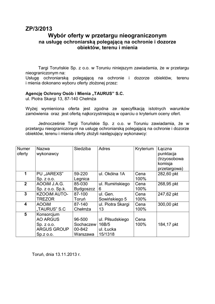 ZP/3/2013 Wybór oferty w przetargu nieograniczonym na usługę ochroniarską polegającą na ochronie i dozorze obiektów, terenu i mienia Targi Toruńskie Sp. z o.o. w Toruniu niniejszym zawiadamia, że w przetargu nieograniczonym na: Usługę ochroniarską polegającą na ochronie i dozorze obiektów, terenu i mienia dokonano wyboru oferty złożonej przez: Agencję Ochrony Osób i Mienia „TAURUS” S.C. ul. Piotra Skargi 13, 87-140 Chełmża Wyżej wymieniona oferta jest zgodna ze specyfikacją istotnych warunków zamówienia oraz jest ofertą najkorzystniejszą w oparciu o kryterium oceny ofert. Jednocześnie Targi Toruńskie Sp. z o.o. w Toruniu zawiadamia, że w przetargu nieograniczonym na usługę ochroniarską polegającą na ochronie i dozorze obiektów, terenu i mienia oferty złożyli następujący wykonawcy: Numer oferty 1 2 3 4 5 Nazwa wykonawcy Siedziba Adres PU „JAREXS” Sp. z o.o. AOOiM J.A.G. Sp. z o.o. Sp.k. KZOOiM AUTOTREZOR AOOiM „TAURUS” S.C Konsorcjum AO ARGUS Sp. z o.o. ARGUS GROUP Sp.z o.o. 59-220 Legnica 85-030 Bydgoszcz 87-100 Toruń 87-140 Chełmża ul. Okólna 1A 96-500 Sochaczew 00-842 Warszawa ul. Piłsudskiego 16B/5 ul. Łucka 15/1318 Toruń, dnia 13.11.2013 r. ul. Rumińskiego 6 ul. Gen. Sowińskiego 5 ul. Piotra Skargi 13 Kryterium Łączna punktacja (trzyosobowa komisja przetargowa) Cena 282,60 pkt 100% Cena 268,95 pkt 100% Cena 247,62 pkt 100% Cena 300,00 pkt 100% Cena 100% 184,17 pkt