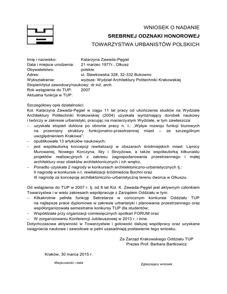 WNIOSEK O NADANIE SREBRNEJ ODZNAKI HONOROWEJ TOWARZYSTWA URBANISTÓW POLSKICH Imię i nazwisko: Katarzyna Zawada-Pęgiel Data i miejsce urodzenia: 21 marzec 1977r., Olkusz Obywatelstwo: polskie Adres: ul. Sławkowska 328, 32-332 Bukowno Wykształcenie: wyższe: Wydział Architektury Politechniki Krakowskiej Stopień/tytuł zawodowy/naukowy: dr inż. arch. Rok wstąpienia do TUP: 2007 Aktualna funkcja w TUP: Szczegółowy opis działalności: Kol. Katarzyna Zawada-Pęgiel w ciągu 11 lat pracy od ukończenia studiów na Wydziale Architektury Politechniki Krakowskiej (2004) uzyskała wyróżniający dorobek naukowy i twórczy w zakresie urbanistyki, pracując na macierzystym Wydziale, w tym zawłaszcza: uzyskała stopień doktora po obronie pracy n. t.: „Wpływ rozwoju funkcji biurowych na przemiany struktury funkcjonalno-przestrzennej miast – ze szczególnym uwzględnieniem Krakowa”; opublikowała 13 artykułów naukowych; jest współautorką koncepcji rewitalizacji w obszarach śródmiejskich miast: Lipnicy Murowanej, Nowego Korczyna, Iłży i Strzyżowa, a także współautorką kilkunastu projektów realizacyjnych z zakresu zagospodarowania przestrzennego i małej architektury oraz obiektów architektonicznych i ich wnętrz. Ponadto uzyskała 2 nagrody w konkursach architektoniczno-urbanistycznych tj.: II nagrodę w konkursie n.t. rewitalizacji śródmieścia Bochni oraz III nagrodę za koncepcję architektoniczno-urbanistyczną terenu dworca w Olkuszu. Od wstąpienia do TUP w 2007 r. tj. od 8 lat Kol. K. Zawada-Pęgiel jest aktywnym członkiem Towarzystwa i w wielu zakresach współpracuje z Zarządem Oddziału w tym: Kilkakrotnie pełniła funkcję Sekretarza w corocznym konkursie Oddziału TUP na najlepsze prace dyplomowe w zakresie urbanistyki i planowania przestrzennego oraz współorganizowała semestralne konkursy TUP dla studentów; Współdziała przy organizacji comiesięcznych spotkań FORUM oraz W zorganizowaniu Konferencji Jubileuszowej w 2013 r. i inne. Dotychczasowa aktywność w Towarzystwie i gotowość dalszej współpracy oraz uzyskane osiągniecia naukowe i zawodowe w pełni uzasadniają postawienie tego wniosku. Za Zarząd Krakowskiego Oddziału TUP Prezes Prof. Barbara Bartkowicz Kraków, 30 marca 2015 r. Miejscowość i data Zgłaszający wniosek WNIOSEK O NADANIE SREBRNEJ ODZNAKI HONOROWEJ TOWARZYSTWA URBANISTÓW POLSKICH Imię i nazwisko: Wiesław Mancewicz Data i miejsce urodzenia: 13 maj 1939 r., Wilno Obywatelstwo: polskie Adres: ul. Cieplińskiego 52/24; 31-429 Kraków Wykształcenie: wyższe: Wydział Architektury Politechniki Krakowskiej Stopień/tytuł zawodowy/naukowy: mgr inż. arch. Rok wstąpienia do TUP: 1975 Aktualna funkcja w TUP: Członek Komisji Rewizyjnej O/Kraków Szczegółowy opis działalności: Kol. Wiesław Mancewicz architekt-urbanista w ciągu ponad 40 lat pracy zawodowej (19632004) był projektantem i głównym projektantem wielu opracowań planistycznych w tym: miejscowych planów ogólnych i szczegółowych zagospodarowania przestrzennego, studiów i koncepcji dla potrzeb województwa małopolskiego oraz strategii rozwoju gmin. Od lat 70. zatrudniony w Biurze Rozwoju Krakowa (nazwa po reorganizacjach) jako kierownik pracowni Krakowskiego Zespołu Miejskiego, Planów Syntezy Regionalnej i innych – kierował dużymi zespołami wielobranżowymi. Jest autorem i współautorem wielu opracowań, w tym m.in.: Planu KZM i Aglomeracji Krakowskiej, Studium Regionu Krakowa w obszarze Makroregionu PołudniowoWschodniego, opracowań Regionu Krakowskiego dla potrzeb Planu Krakowskiego i innych. Opracowania w których uczestniczył wielokrotnie były nagradzane m.in.: Zespołowa Nagroda Min. I Stopnia za Plan KZM i Aglomerację Krakowską (1977 r.). Posiada także I Nagrodę Zespołową w Konkursie Zamkniętym TUP na otocznie Wisły w Krakowie. Kol. Wiesław Mancewicz od 40 lat jest członkiem TUP aktywnym w Oddziale Krakowskim gdzie wielokrotnie pełnił różne funkcje: jako członek Zarządu Koła TUP (przez szereg kadencji), w Biurze Rozwoju Krakowa, następnie jako Członek Komisji Rewizyjnej Oddział w kolejnych czterech kadencjach począwszy od 2003 r. do chwili obecnej. Oprócz udział w pracach Komisji Rewizyjnej Kol. Mancewicz aktywnie u czestniczy w życiu oddziału tj. w spotkaniach FORUM DYSKUSYJNEGO, w zebraniach i dyskusjach, co w pełni uzasadnia postawienie tego wniosku. Za Zarząd Krakowskiego Oddziału TUP Prezes Prof. Barbara Bartkowicz Kraków, 30 marca 2015 r. Miejscowość i data Zgłaszający wniosek WNIOSEK O NADANIE SREBRNEJ ODZNAKI HONOROWEJ TOWARZYSTWA URBANISTÓW POLSKICH Imię i nazwisko: Jarosław Żółciak Data i miejsce urodzenia: 26.04. 1956 r. Obywatelstwo: polskie Adres: Al. Pod Kopcem 22/5; 30-544 Kraków Wykształcenie: wyższe: Wydział Architektury Politechniki Krakowskiej Stopień/tytuł zawodowy/naukowy: mgr inż. arch. Rok wstąpienia do TUP: 2006 Aktualna funkcja w TUP: Szczegółowy opis działalności: Wniosek o Nadanie Srebrnej Odznaki Honorowej TUP Kol. Jarosławowi Żółciakowi uzasadniają przede wszystkim Jego zasługi w obronie Ojcowskiego Parku Narodowego i jego otuliny przed gwałtowną presją urbanizacji. Jako specjalista do spraw w Dyrekcji Parku Ojcowskiego od wielu lat opiniuje zamierzenia inwestycyjne oraz prace planistyczne i decyzje WZ w otulinie parku. Dzięki Jego wyjątkowej konsekwencji i determinacji w działaniach, otoczenie Ojcowskiego Parku Narodowego nie zostało do tej pory w pełni zurbanizowane. Ponadto kol. Żółciak jest wybitnym znawcą historycznych wartości Podgórza w Krakowie i autorem wielu specjalistycznych opracowań w tym zakresie, m.in .: dla różnych zespołów zabudowy, Parku Bednarskiego, Obozu Płaszów i wielu innych. Jest także współautorem zrekonstruowanych ogrodów wawelskich. Jako aktywny członek TUP pełni równocześnie funkcję Prezesa Zarządu Konfederacji Cracovia Urbs Europaea, która współpracuje z krakowskim Oddziałem TUP oraz