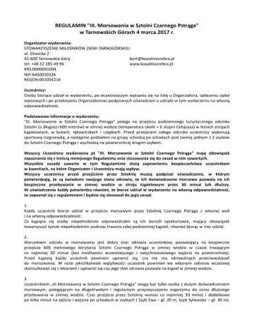 REGULAMIN "III. Morsowania w Sztolni Czarnego Pstrąga" w Tarnowskich Górach 4 marca 2017 r. Organizator wydarzenia: STOWARZYSZENIE MIŁOŚNIKÓW ZIEMI TARNOGÓRSKIEJ ul. Gliwicka 2 42-600 Tarnowskie Góry [email protected] tel: +48 32 285 49 96 www.kopalniasrebra.pl KRS:0000041094 NIP:6450010326 REGON:001054216 Uczestnicy: Osoby biorące udział w wydarzeniu, po wcześniejszym wpisaniu się na listę u Organizatora, opłaceniu opłat wpisowych i po przekazaniu Organizatorowi podpisanych oświadczeń o udziale w tym wydarzeniu na własną odpowiedzialność. Podstawowe informacje o wydarzeniu: "III. Morsowanie w Sztolni Czarnego Pstrąga" polega na przejściu podziemnego turystycznego odcinka Sztolni (o długości 600 metrów) w zimnej wodzie (temperatura około + 6 stopni Celsjusza) w letnich strojach kąpielowych, w butach, rękawiczkach i czapkach. Przed przejściem całego odcinka uczestnicy wykonują sportową rozgrzewkę, a następnie podzieleni na grupy schodzą po schodach pod ziemię jednym z 2 szybów do Sztolni Czarnego Pstrąga i wychodzą na powierzchnię drugim szybem. Wszyscy Uczestnicy wydarzenia pt "III. Morsowanie w Sztolni Czarnego Pstrąga" mają obowiązek zapoznania się z treścią niniejszego Regulaminu oraz stosowania się do zasad w nim zawartych. Wszystkie zasady zawarte w tym Regulaminie służą zapewnieniu bezpieczeństwa uczestnikom w kwestiach, na które Organizator i Uczestnicy mają wpływ. Wszyscy uczestnicy przed przejściem przez Sztolnię muszą podpisać oświadczenie, w którym potwierdzają, że są świadomi swojego stanu zdrowia, że ich doświadczenie morsowe pozwala na ich bezpieczne przebywanie w zimnej wodzie w stroju kąpielowym przez 30 minut lub dłuższy. W oświadczeniu każdy potwierdza również, że bierze udział w wydarzeniu na własną odpowiedzialność, że zapoznał się z regulaminem i będzie się stosował do jego zasad: 1. Każdy uczestnik bierze udział w przejściu morsowym przez Sztolnię Czarnego Pstrąga z własnej woli i na własną odpowiedzialność. Za kąpiące się osoby niepełnoletnie odpowiedzialni są ich dorośli opiekunowie, mający obowiązek towarzyszyć tymże niepełnoletnim podczas trwania całej podziemnej kąpieli, również biorąc w niej udział. 2. Warunkiem udziału w morsowaniu jest dobry stan zdrowia uczestników, pozwalający na bezpieczne przejście 600 metrowego korytarza Sztolni Czarnego Pstrąga w zimnej wodzie w czasie trwającym co najmniej 30 minut (bez możliwości wcześniejszego i natychmiastowego wyjścia na powierzchnię). Przed kąpielą każdy uczestnik powinien upewnić się, czy nie ma zdrowotnych przeciwwskazań do morsowania. W razie jakichkolwiek wątpliwości uczestnik powinien we własnym zakresie wcześniej skonsultować się z lekarzem i upewnić się czy jego stan zdrowia pozwala na kąpiel w zimnej wodzie. 3. Uczestnikiem „III Morsowania w Sztolni Czarnego Pstrąga” mogą być tylko osoby z dużym doświadczeniem morsowym, polegającym na długotrwałym i regularnym przyzwyczajaniu organizmu do coraz dłuższego przebywania w zimnej wodzie. Czas przejścia przez Sztolnię wynosi co najmniej 30 minut i dodatkowo po kilka minut na zejście i wejście po schodach w szybach ( Szyb Ewa – gł. 20 m, Szyb Sylwester – gł. 30 m). Przejścia przez Sztolnię nie da się przerwać w dowolnym momencie i jednocześnie niezwłocznie wydostać się na powierzchnię, ponieważ szyby będące wejściami do sztolni znajdują się tylko na 2 przeciwległych końcach 600 metrowego podziemnego korytarza. 4. Każdy uczestnik wydarzenia jest zobowiązany do bezwzględnego stosowania się do niniejszego regulaminu, poprzez podpisanie oświadczenia i przekazanie go organizatorowi przed rozpoczęciem przejścia przez Sztolnię. 5. Każdy uczestnik jest zobowiązany do stosowania się w trakcie wydarzenia do poleceń organizatorów oraz służb porządkowych, mundurowych i ratowniczych, a także do harmonogramu wydarzenia. 6. Każdy uczestnik przed wejściem do kąpieli w Sztolni obowiązkowo musi wykonać sportową rozgrzewkę, przygotowującą organizm w wystarczający sposób do bezpiecznego wytrzymania w zimnej wodzie przez cały czas trwania kąpieli. 7. Zabroniony jest udział w wydarzeniu osobom pod wpływem alkoholu i innych środków odurzających. Użycie tego rodzaju środków przed kąpielą morsową i po niej może zaszkodzić życiu lub zdrowiu takich osób. 8. Przed rozpoczęciem przejścia przez Sztolnię, wszyscy Uczestnicy mogą być zbadani przez Policję alkomatem. Osoby, u których zostanie wykryte jakiekolwiek stężenie alkoholu we krwi, nie będą wpuszczone do Sztolni. 9. W czasie przejścia przez Sztolnię Czarnego Pstrąga każdy uczestnik obowiązkowo musi być ubrany, poza letnim strojem kąpielowym, w: - czapkę zapobiegającą utracie ciepła przez głowę, - rękawiczki, - obuwie z grubą podeszwą (np neoprenowe obuwie nurkowe z gumową podeszwą), aby chronić stopy przed nadmiernym wychłodzeniem i przed skaleczeniami o ostre przedmioty, mogące znajdować się na dnie Sztolni. 10. Po kąpieli i po wyjściu na powierzchnię należy jak najszybciej wytrzeć się i przebrać w suche ubranie. 11. W przypadku braku udziału w wydarzeniu osoby, która wcześniej zapisała się i wpłaciła opłatę wpisową, zwrot tej kwoty od Organizatora jest możliwy jedynie w szczególnych przypadkach i po wcześniejszym obustronnym porozumieniem się stron. 12. Każdy uczestnik, poprzez podpisanie oświadczenia, wyraża zgodę na nieodpłatne publikowanie swojego wizerunku w materiałach medialnych (internet, radio, telewizja, prasa, publikacje drukowane) oraz w materiałach marketingowych Organizatora służących promocji Sztolni Czarnego Pstrąga i w materiałach marketingowych innych instytucji powiązanych z organizacją tego wydarzenia.