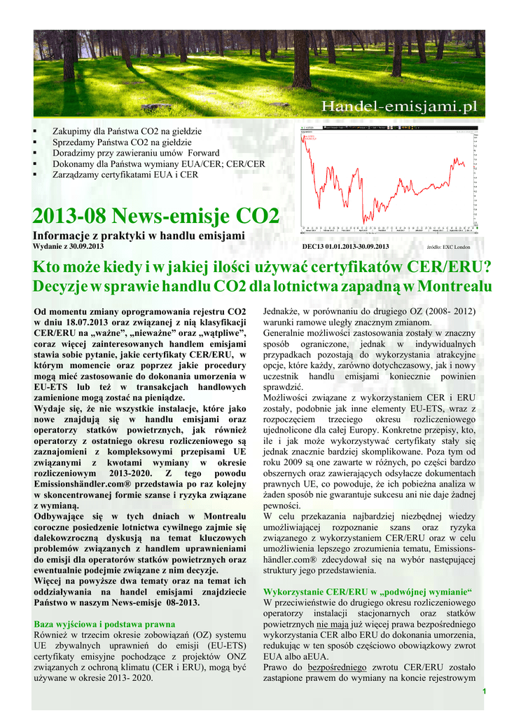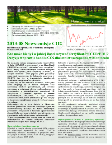 Zakupimy dla Państwa CO2 na giełdzie Sprzedamy Państwa CO2 na giełdzie Doradzimy przy zawieraniu umów Forward Dokonamy dla Państwa wymiany EUA/CER; CER/CER Zarządzamy certyfikatami EUA i CER 2013-08 News-emisje CO2 Informacje z praktyki w handlu emisjami Wydanie z 30.09.2013 DEC13 01.01.2013-30.09.2013 źródło: EXC London Kto może kiedy i w jakiej ilości używać certyfikatów CER/ERU? Decyzje w sprawie handlu CO2 dla lotnictwa zapadną w Montrealu Od momentu zmiany oprogramowania rejestru CO2 w dniu 18.07.2013 oraz związanej z nią klasyfikacji CER/ERU na „ważne”, „nieważne” oraz „wątpliwe”, coraz więcej zainteresowanych handlem emisjami stawia sobie pytanie, jakie certyfikaty CER/ERU, w którym momencie oraz poprzez jakie procedury mogą mieć zastosowanie do dokonania umorzenia w EU-ETS lub też w transakcjach handlowych zamienione mogą zostać na pieniądze. Wydaje się, że nie wszystkie instalacje, które jako nowe znajdują się w handlu emisjami oraz operatorzy statków powietrznych, jak również operatorzy z ostatniego okresu rozliczeniowego są zaznajomieni z kompleksowymi przepisami UE związanymi z kwotami wymiany w okresie rozliczeniowym 2013-2020. Z tego powodu Emissionshändler.com® przedstawia po raz kolejny w skoncentrowanej formie szanse i ryzyka związane z wymianą. Odbywające się w tych dniach w Montrealu coroczne posiedzenie lotnictwa cywilnego zajmie się dalekowzroczną dyskusją na temat kluczowych problemów związanych z handlem uprawnieniami do emisji dla operatorów statków powietrznych oraz ewentualnie podejmie związane z nim decyzje. Więcej na powyższe dwa tematy oraz na temat ich oddziaływania na handel emisjami znajdziecie Państwo w naszym News-emisje 08-2013. Baza wyjściowa i podstawa prawna Również w trzecim okresie zobowiązań (OZ) systemu UE zbywalnych uprawnień do emisji (EU-ETS) certyfikaty emisyjne pochodzące z projektów ONZ związanych z ochroną klimatu (CER i ERU), mogą być używane w okresie 2013- 2020. Jednakże, w porównaniu do drugiego OZ (2008- 2012) warunki ramowe uległy znacznym zmianom. Generalnie możliwości zastosowania zostały w znaczny sposób ograniczone, jednak w indywidualnych przypadkach pozostają do wykorzystania atrakcyjne opcje, które każdy, zarówno dotychczasowy, jak i nowy uczestnik handlu emisjami koniecznie powinien sprawdzić. Możliwości związane z wykorzystaniem CER i ERU zostały, podobnie jak inne elementy EU-ETS, wraz z rozpoczęciem trzeciego okresu rozliczeniowego ujednolicone dla całej Europy. Konkretne przepisy, kto, ile i jak może wykorzystywać certyfikaty stały się jednak znacznie bardziej skomplikowane. Poza tym od roku 2009 są one zawarte w różnych, po części bardzo obszernych oraz zawierających odsyłacze dokumentach prawnych UE, co powoduje, że ich pobieżna analiza w żaden sposób nie gwarantuje sukcesu ani nie daje żadnej pewności. W celu przekazania najbardziej niezbędnej wiedzy umożliwiającej rozpoznanie szans oraz ryzyka związanego z wykorzystaniem CER/ERU oraz w celu umożliwienia lepszego zrozumienia tematu, Emissionshändler.com® zdecydował się na wybór następującej struktury jego przedstawienia. Wykorzystanie CER/ERU w „podwójnej wymianie“ W przeciwieństwie do drugiego okresu rozliczeniowego operatorzy instalacji stacjonarnych oraz statków powietrznych nie mają już więcej prawa bezpośredniego wykorzystania CER albo ERU do dokonania umorzenia, redukując w ten sposób częściowo obowiązkowy zwrot EUA albo aEUA. Prawo do bezpośredniego zwrotu CER/ERU zostało zastąpione prawem do wymiany na koncie rejestrowym 1 CER/ERU na EUA lub aEUA w stosunku 1:1 w sytuacji, kiedy przedsiębiorstwo spełnia określone warunki. Odmienny sposób wykorzystania stanowi zasadniczo tylko różnicę formalną, która w indywidualnych przypadkach oznaczać może nawet korzyść dla przedsiębiorstwa. Dotychczasowa możliwość wymiany EUA lub aEUA na giełdzie lub przez handlowców określana była jako „wymiana CO2”, dlatego w przyszłości należy zwracać uwagę na to, o co konkretnie się rozchodzi, kiedy używane jest określenie „wymiana CO2”. Lub też, jak przedstawiono poniżej, w przyszłości istniały będą dwa różne zdarzenia, mogące nosić miano wymiany CO2: a) Wymiana EUA lub aEUA na CER lub ERU na giełdzie lub u handlowca w celu ich posiadania i zdeponowania na koncie rejestrowym b) Zamiana (wymiana) certyfikatów CER/ERU na własnym koncie na certyfikaty EUA lub aEUA poprzez funkcję wymiany (zamiany) na koncie rejestrowym (funkcja ta będzie do dyspozycji dopiero za kilka miesięcy) w celu ich ostatecznego użycia do spełnienia obowiązku zwrotu certyfikatów EUA lub aEUA Emissionshändler.com® poinformuje odpowiednio wcześniej przed upływem terminu zwrotu w kwietniu 2014 o dokładnym przebiegu zamiany certyfikatów CER/ERU na koncie rejestrowym operatorów instalacji stacjonarnych lub statków powietrznych. Uprawnione konta rejestrowe i pierwszy termin wymiany Zasadniczo o bezpłatną wymianę CER/ERU na EUA lub aEUA mogą wnioskować tylko tacy operatorzy instalacji stacjonarnych lub statków powietrznych, którzy w momencie składania wniosku o wymianę podlegają EU-ETS. Nie dotyczy to więc posiadaczy kont osobistych ani handlowców, którzy to nie podlegają obowiązkowi dokonania zwrotu certyfikatów. Zgodnie z informacją przekazaną w dniu 16.09.2013 przez Komisję UE wnioskowanie o wymianę z wykorzystaniem oprogramowania rejestru będzie zdaniem Emissionshändler.com® prawdopodobnie technicznie możliwe najwcześniej na początku lutego 2014, co umożliwi jeszcze przed 30.04.2014 dokonanie zamiany certyfikatów na koncie rejestrowym. W konsekwencji oznacza to, że na przykład operatorzy instalacji, którzy według wymienionych poniżej kryteriów mieliby prawo do dokonania wymiany, nie będą mogli jej dokonać z racji tego, że wystąpią z EUETS zanim możliwe będzie wykorzyst