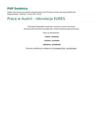 PUP Świdnica Źródło: http://www.praca.swidnica.pl/pl/aktualnosci/11673,Praca-w-Austrii-rekrutacja-EURES.html Wygenerowano: Czwartek, 2 marca 2017, 03:42 Praca w Austrii - rekrutacja EURES Dolnośląski Wojewódzki Urząd Pracy realizuje w ramach sieci Eures rekrutację dla austriackich pracodawców z branży hotelarsko-gastronomicznej. Praca na stanowiskach: - kelner / kelnerka - kucharz / kucharka - pokojowy / pokojówka Rozmowy kwalifikacyjne odbędą się 4-5 listopada 2014 r. we Wrocławiu. Metryka strony Data publikacji 14.10.2014 Rejestr zmian Osoba publikująca: MO Autor: MO Liczba wejść: 1177 Drukuj Generuj PDF Powiadom znajomego Wstecz