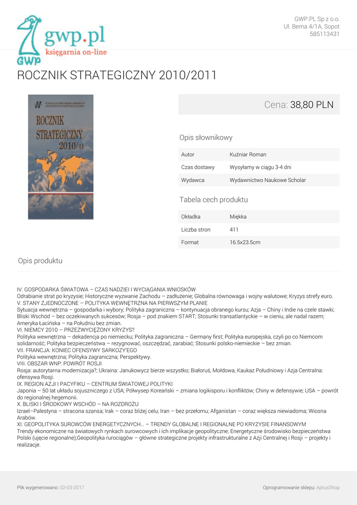 GWP.PL Sp z o.o. Ul. Bema 4/1A, Sopot 585113431 ROCZNIK STRATEGICZNY 2010/2011 Cena: 38,80 PLN Opis słownikowy Autor Kuźniar Roman Czas dostawy Wysyłamy w ciągu 3-4 dni Wydawca Wydawnictwo Naukowe Scholar Tabela cech produktu Okładka Miękka Liczba stron 411 Format 16.5x23.5cm Opis produktu IV. GOSPODARKA ŚWIATOWA – CZAS NADZIEI I WYCIĄGANIA WNIOSKÓW Odrabianie strat po kryzysie; Historyczne wyzwanie Zachodu – zadłużenie; Globalna równowaga i wojny walutowe; Kryzys strefy euro. V. STANY ZJEDNOCZONE – POLITYKA WEWNĘTRZNA NA PIERWSZYM PLANIE Sytuacja wewnętrzna – gospodarka i wybory; Polityka zagraniczna – kontynuacja obranego kursu; Azja – Chiny i Indie na czele stawki; Bliski Wschód – bez oczekiwanych sukcesów; Rosja – pod znakiem START; Stosunki transatlantyckie – w cieniu, ale nadal razem; Ameryka Łacińska – na Południu bez zmian. VI. NIEMCY 2010 – PRZEZWYCIĘŻONY KRYZYS? Polityka wewnętrzna – dekadencja po niemiecku; Polityka zagraniczna – Germany first; Polityka europejska, czyli po co Niemcom solidarność; Polityka bezpieczeństwa – rezygnować, oszczędzać, zarabiać; Stosunki polsko-niemieckie – bez zmian. VII. FRANCJA: KONIEC OFENSYWY SARKOZY’EGO Polityka wewnętrzna; Polityka zagraniczna; Perspektywy. VIII. OBSZAR WNP: POWRÓT ROSJI Rosja: autorytarna modernizacja?; Ukraina: Janukowycz bierze wszystko; Białoruś, Mołdowa, Kaukaz Południowy i Azja Centralna: ofensywa Rosji. IX. REGION AZJI I PACYFIKU – CENTRUM ŚWIATOWEJ POLITYKI Japonia – 50 lat układu sojuszniczego z USA; Półwysep Koreański – zmiana logikisporu i konfliktów; Chiny w defensywie; USA – powrót do regionalnej hegemonii. X. BLISKI I ŚRODKOWY WSCHÓD – NA ROZDROŻU Izrael–Palestyna – stracona szansa; Irak – coraz bliżej celu; Iran – bez przełomu; Afganistan – coraz większa niewiadoma; Wiosna Arabów. XI. GEOPOLITYKA SUROWCÓW ENERGETYCZNYCH… – TRENDY GLOBALNE I REGIONALNE PO KRYZYSIE FINANSOWYM Trendy ekonomiczne na światowych rynkach surowcowych i ich implikacje geopolityczne; Energetyczne środowisko bezpieczeństwa Polski (ujęcie regionalne);Geopolityka rurociągów – główne strategiczne projekty infrastrukturalne z Azji Centralnej i Rosji – projekty i realizacje. Plik wygenerowano: 02-03-2017 Oprogramowanie sklepu: AptusShop GWP.PL Sp z o.o. Ul. Bema 4/1A, Sopot 585113431 XII. VOJNA PRIHAJA NA KRILIH, ODHAJA PA PEŠ…: REFLEKSJE W DWADZIEŚCIA LAT PO ROZPADZIE JUGOSŁAWII Gdy lody topnieją: specyfika wojny w byłej Jugosławii; A gdyby tak cofnąć czas? Krytycznie o działaniach „społeczności międzynarodowej” podczas wojny w byłej Jugosławii; Konsekwencje rozpadu Jugosławii; Perspektywy: ostrożny optymizm i uzasadnione obawy. XIII. POLITYKA ZAGRANICZNA POLSKI W TRUDNYM ROKU 2010 W Unii Europejskiej głównie o kryzysie; Polityka bezpieczeństwa; Po pierwsze Rosja… Plik wygenerowano: 02-03-2017 Powered by TCPDF (www.tcpdf.org) Oprogramowanie sklepu: AptusShop