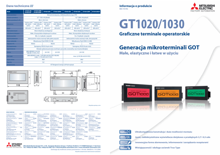 MITSUBISHI ELECTRIC Informacja o produkcie GT1020-LBD GT1020-LBL* Model GT1020-LBDW GT1020-LBLW* GT1020-LBD2 GT1020-LBDW2 GT1030-LBD GT1030-LBD2 GT1030-LBDW FACTORY AUTOMATION GT1030-LBD2W Monochromatyczny, ciekłokrystaliczny typu STN Rodzaj wyświetlacza 3,7" (160 x 64 pikseli) Przekątna wyświetlacza 86,4 x 34,5 mm Rozmiar wyświetlacza (S x W) Podświetlenie Jasność 109,4 x 36 mm 3 kolory LED ziel., pom., czerw. 3 kolory LED bial., różowy, czerw. 3 kolory LED ziel., pom., czerw. 3 kolory LED bial., różowy, czerw. 3 kolory LED ziel., pom., czerw. 3 kolory LED bial., różowy, czerw. 3 kolory LED ziel., pom., czerw. 3 kolory LED bial., różowy, czerw. 200 cd/m2 300 cd/m2 200 cd/m2 300 cd/m2 200 cd/m2 300 cd/m2 200 cd/m2 300 cd/m2 Ekran dotykowy (analogowy) Ekran dotykowy (matryca) Maks. 50 przycisków dotykowych na ekran Maks. 50 przycisków dotykowych na ekran Min. 2 x 2 piksele / przycisk 16 x 16 piksele / przycisk Jednocześnie można nacisnąć tylko jeden przycisk Jednocześnie można nacisnąć maks. dwa przyciski Wbudowany Flash ROM (512 kB) Wbudowany Flash ROM (1,5 MB) Wprowadzanie danych Liczba klawiszy funkcyjnych Rozmiar przycisków Przyciski symultaniczne 4,5" (288 x 96 pikseli) Pamięć użytkownika RS422 Połączenie z PLC RS232 RS422 Szeregowy, RS232 (6-pin mini) Port programowania RS232 Szeregowy, RS232 (6-pin mini) Dźwięk wydawany jest przy naciśnięciu przycisku (ustawialny czas trwania dźwięku) Sygnał akustyczny LBD/LBD(W)2: 24 V DC *LBL(W): 5 V DC z PLC Zasilanie 24 V DC 24 V DC Generacja mikroterminali GOT Małe, elastyczne i łatwe w użyciu 24 V DC LBD/LBD(W)2: maks. 1,9 W (80 mA/24 V DC)*LBL(W): maks. 1,1 W (220 mA/5 V DC) max. 2,2 W (90 mA/24 V DC) Stopień ochrony IP67 IP67 Waga (kg) 0,2 Pobór prądu Graficzne terminale operatorskie 0,3 GT Designer2 (wersja 2,59 lub wyższa) Oprogramowanie 74 65 >80 27 113 Wszystkie wymiary w mm ODDZIALY EUROPEJSKIE PRZEDSTAWICIELSTWA EUROPEJSKIE MITSUBISHI ELECTRIC EUROPE B.V. 25, Boulevard des Bouvets GEVA Wiener Straße 89 AutoCont C. S., s.r.o. Technologická 374/6 UTECO A.B.E.E. 5, Mavrogenous Str. INTEHSIS srl bld. Traian 23/1 ICOS Ryazanskij Prospekt, 8A, Office 100 Beijer Electronics AB Box 426 Phone: +33 (0)1 / 55 68 55 68 MITSUBISHI ELECTRIC EUROPE B.V. Gothaer Straße 8 Phone: +43 (0)2252 / 85 55 20 TEHNIKON Oktyabrskaya 16/5, Off. 703-711 Phone: +420 595 691 150 B:TECH, a. s. Na Ostrove 84 Phone: +30 211 / 1206 900 MELTRADE Ltd. Fertő utca 14. Phone: +373 (0)22 / 66 4242 Koning & Hartman B.V. Haarlerbergweg 21-23 Phone: +7 495 / 232 0207 NPP “URALELEKTRA” Sverdlova 11A Phone: +46 (0)40 / 35 86 00 ECONOTEC AG Hinterdorfstr. 12 Phone: +49 (0)2102/486-0 MITSUBISHI ELECTRIC EUROPE B.V. Westgate Business Park, Ballymount Phone: +375 (0)17 / 210 46 26 Koning & Hartman B.V. Woluwelaan 31 Phone: +420 (0)569 / 408 841 B:TECH, a. s. Headoffice, U Borové 69 Phone: +36 (0)1 / 431-9726 ILAN & GAVISH Ltd. 24 Shenkar St., Kiryat Arie Phone: +31 (0)20 / 587 76 00 Beijer Electronics AS Postboks 487 Phone: +7 343 / 353 2745 CRAFT Cons. & Eng. d.o.o. Bulevar Svetog Cara Konstantina 80-86 Phone: +41 (0)44 / 838 48 11 GTS Darulaceze Cad. No. 43 KAT. 2 Phone: +353 (0)1 419 88 00 MITSUBISHI ELECTRIC EUROPE B.V. Viale Colleoni 7 Phone: +32 (0)2 / 257 02 40 AKHNATON 4 Andrej Ljapchev Blvd. Pb 21 Phone: +420 569 777 777 Beijer Electronics A/S Lautruphoj 1-3 Phone: +972 (0)3 / 922 18 24 Kazpromautomatics Ltd. 2, Scladskaya str. Phone: +47 (0)32 / 24 30 00 MPL Technology Sp. z o.o. Ul. Krakowska 50 Phone:+381(0)18/292-24-4/5,523962 INEA SR d.o.o. Karadjordjeva 12/260 Phone: +90 (0)212 / 320 1640 CSC Automation Ltd. 15, M. Raskova St., Fl. 10, Office 1010 Phone: +39 039 / 60 53 1 MITSUBISHI ELECTRIC EUROPE B.V. Carretera de Rubí 76-80 Phone: +359 (0)2 / 97 44 05 8 INEA CR d.o.o. Losinjska 4 a Phone: +45 (0)70 / 26 46 46 Beijer Electronics Eesti OÜ Pärnu mnt.160i Phone: +7 3212 / 50 11 50 Beijer Electronics SIA Vestienas iela 2 Phone: +48 (0)12 / 630 47 00 Sirius Trading & Services srl Aleea Lacul Morii Nr. 3 Phone: +381 (0)26 / 617 163 CS MTrade Slovensko, s.r.o. Vajanskeho 58 Phone: +380 (0)44 / 494 33 55 Phone: +34 93 / 565 3131 MITSUBISHI ELECTRIC EUROPE B.V. Travellers Lane Phone: +385 (0)1 / 36 940 - 01/ -02/ -03 AutoCont C. S., s.r.o. Jelinkova 59/3 Phone: +372 (0)6 / 51 81 40 Beijer Electronics OY Jaakonkatu 2 Phone: +371 (0)784 / 2280 Beijer Electronics UAB Savanoriu Pr. 187 Phone: +40 (0)21 / 430 40 06 ELEKTROSTILY Rubzowskaja nab. 4-3, No. 8 Phone: +421 (0)33 / 7742 760 INEA d.o.o. Stegne 11 CBI Ltd. Private Bag 2016 Phone: +44 (0)1707 / 27 61 00 Phone: +420 (0)59 / 5691 150 Phone: +358 (0)207 / 463 500 Phone: +370 (0)5 / 232 3101 Phone: +7 495 / 545 3419 Phone: +386 (0)1 / 513 8100 Phone: + 27 (0)11 / 928 2000 MITSUBISHI ELECTRIC FACTORY AUTOMATION Mitsubishi Electric Europe B.V. /// FA - European Business Group /// Gothaer Straße 8 /// D-40880 Ratingen /// Germany Tel.: +49(0)2102-4860 /// Fax: +49(0)2102-4861120 /// [email protected] /// www.mitsubishi-automation.com Zastrzega się możliwość zmiany parametrów /// Nr kat. 206038-A /// 01.2008 Wszystkie zarejestrowane znaki towarowe zastrzeżone Ultrakompaktowa konstrukcja i duże możliwości montażu Twórcza wizualizacja w małym opakowaniu 쐽 Proste tworzenie ekranu Dzięki konstrukcji panelu dotykowego, przyciski na ekranie mogą być szybko stwo- GT1020/1030 – pierwsze mikroterminale 쐽 Ekran dotykowy dużej rozdzielczości Urządzenia nowej serii GT1020/1030 posiadają jasny, monochromatyczny, ciekłokrystaliczny wyświetlacz dotykowy o przekątnych od 3,7 do 4,5 cala z trójkolorowym podświetleniem, który może zostać użyty w różnorodnych zastosowaniach. Te mikro GOT-y mają wpraw- rzone i rozmieszczone w każdej pozycji z dokładnością 1 piksela. 쐽 Wielojęzyczność Panele GT1020/1030 mogą wyświetlać komunikaty dla wielu krajów i regionów, utworzone w różnych językach i różnymi alfabetami. W łatwy sposób można stworzy