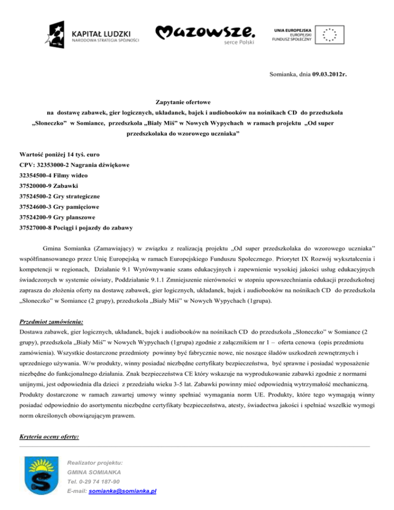 Somianka, dnia 09.03.2012r. Zapytanie ofertowe na dostawę zabawek, gier logicznych, układanek, bajek i audiobooków na nośnikach CD do przedszkola „Słoneczko” w Somiance, przedszkola „Biały Miś” w Nowych Wypychach w ramach projektu „Od super przedszkolaka do wzorowego uczniaka” Wartość poniżej 14 tyś. euro CPV: 32353000-2 Nagrania dźwiękowe 32354500-4 Filmy wideo 37520000-9 Zabawki 37524500-2 Gry strategiczne 37524600-3 Gry pamięciowe 37524200-9 Gry planszowe 37527000-8 Pociągi i pojazdy do zabawy Gmina Somianka (Zamawiający) w związku z realizacją projektu „Od super przedszkolaka do wzorowego uczniaka” współfinansowanego przez Unię Europejską w ramach Europejskiego Funduszu Społecznego, Priorytet IX Rozwój wykształcenia i kompetencji w regionach, Działanie 9.1 Wyrównywanie szans edukacyjnych i zapewnienie wysokiej jakości usług edukacyjnych świadczonych w systemie oświaty, Poddziałanie 9.1.1 Zmniejszenie nierówności w stopniu upowszechniania edukacji przedszkolnej zaprasza do złożenia oferty na dostawę zabawek, gier logicznych, układanek, bajek i audiobooków na nośnikach CD do przedszkola „Słoneczko” w Somiance (2 grupy), przedszkola „Biały Miś” w Nowych Wypychach (1grupa). Przedmiot zamówienia: Dostawa zabawek, gier logicznych, układanek, bajek i audiobooków na nośnikach CD do przedszkola „Słoneczko” w Somiance (2 grupy), przedszkola „Biały Miś” w Nowych Wypychach (1grupa) zgodnie z załącznikiem nr 1 – oferta cenowa (opis przedmiotu zamówienia). Wszystkie dostarczone przedmioty powinny być fabrycznie nowe, nie noszące śladów uszkodzeń zewnętrznych i uprzedniego używania. W/w produkty, winny posiadać niezbędne certyfikaty bezpieczeństwa, być sprawne i posiadać wyposażenie niezbędne do funkcjonalnego działania. Znak bezpieczeństwa CE który wskazuje na wyprodukowanie zabawki zgodnie z normami unijnymi, jest odpowiednia dla dzieci z przedziału wieku 3-5 lat. Zabawki powinny mieć odpowiednią wytrzymałość mechaniczną. Produkty dostarczone w ramach zawartej umowy winny spełniać wymagania norm UE. Produkty, które tego wymagają winny posiadać odpowiednio do asortymentu niezbędne certyfikaty bezpieczeństwa, atesty, świadectwa jakości i spełniać wszelkie wymogi norm określonych obowiązującym prawem. Kryteria oceny oferty: __________________________________________________________________________________________________________ Realizator projektu: GMINA SOMIANKA Tel. 0-29 74 187-90 E-mail: [email protected] 100% cena. Zamawiający nie dopuszcza możliwości składania ofert częściowych. Cena za usługę obejmuje: zakup i dostawę zabawek, gier logicznych, układanek, bajek i audiobooków na nośnikach CD do przedszkola „Słoneczko” w Somiance i przedszkola „Biały Miś” w Nowych Wypychach. Termin, miejsce i sposób złożenia oferty: Ofertę sporządzoną na formularzu udostępnionym przez Zamawiającego bądź innym spełniającym kryteria wyznaczone w załączonym dokumencie. Oferta winna być podpisana przez osobę upoważnioną do składania oświadczeń woli w imieniu Wykonawcy. Ofertę należy przedłożyć osobiście / listownie w zamkniętej kopercie z dopiskiem „dot. zapytania na zabawki”. Miejsce składania ofert: Urząd Gminy Somianka, Somianka – Parcele 16B, 07-203 Somianka, pokój nr 10 (Biuro projektu). Termin składania ofert upływa dnia 22.03.2012r. (do godziny 16.00). Liczy się data wpływu. Inne istotne warunki zamówienia: Ważne aspekty zamówienia dotyczące szczegółów jakości i parametrów towaru prosimy uzgadniać telefonicznie, nr tel. 29/ 741 87 90 wew. 49. Zamawiający informuje jednocześnie, że Zamówienie zostanie udzielone Wykonawcy, który zaoferuje najniższą cenę za dostarczone zabawki, gry logiczne, układanki, bajki i audiobooki na nośnikach CD. Wykonawca może zaproponować tylko jedną cenę. Wartość jednego przedmiotu nie może być wyższa niż 350 zł netto. Zgodnie z art. 4 ust 8 Ustawy z dn. 29.01.2004 r. Prawo zamówień publicznych (Dz. U. t.j. z 2010r. Nr 113 poz. 759 ze zm.) wobec zamówienia nie stosuje się ustawy Prawo Zamówień Publicznych. W związku z powyższym niniejsze zaproszenie do składania ofert nie jest zamówieniem i otrzymanie od Państwa ofert nie powoduje powstania żadnych zobowiązań wobec stron. O ewentualnym wyborze oferty zostaniecie Państwo poinformowani poprzez zaproszenie do podpisania umowy. Informacja o wyborze najkorzystniejszej oferty zostanie zamieszczona na stronie internetowej Zamawiającego (www.somianka.pl). Zamawiający dopuszcza możliwość zwiększenia zakresu zamówienia w przypadku powstania oszczędności w ramach niniejszego zapytania. Wójt Gminy Somianka Andrzej Żołyński W załączeniu: 1. oferta cenowa/opis przedmiotu zamówienia __________________________________________________________________________________________________________ Realizator projektu: GMINA SOMIANKA Tel. 0-29 74 187-90 E-mail: [email protected] Załącznik nr 1 oferta cenowa/opis przedmiotu zamówienia Oferta cenowa Nazwa i siedziba Wykonawcy: ................................................................................................................................…………… ………………………………………………………………………………………………… NIP........................................... FAX ........................................ TEL ………………………… Nazwa i adres Zamawiającego: Gmina Somianka, Somianka - Parcele 16B, 07-203 Somianka Nawiązując do przedstawionego zapytania ofertowego składam ofertę na dostawę zabawek, gier logicznych, układanek, bajek i audiobooków na nośnikach CD na potrzeby projektu pn. „Od super przedszkolaka do wzorowego uczniaka” realizowanego przez Gminę Somianka w ramach Programu Operacyjnego Kapitał Ludzki na lata 2007 – 2013. Oferuję wykonanie dostawy za cenę brutto 