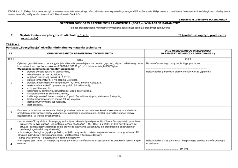 ZP-36.1 /11 „Zakup i dostawa sprzętu i wyposażenia laboratoryjnego dla Laboratorium Kryminalistycznego KWP w Gorzowie Wlkp. wraz z montażem i elementami instalacji oraz niezbędnymi elementami do podłączenia do mediów”- Powtórzenie Części IV Załącznik nr 2 do SIWZ PO ZMIANACH SZCZEGÓŁOWY OPIS PRZEDMIOTU ZAMÓWIENIA (SOPZ)– WYMAGANE PARAMETRY Poniżej przedstawiono minimalne wymagania jakie musi spełniać przedmiot zamówienia I. Gęstościomierz oscylacyjny do alkoholi – 1 szt. urządzenia) ...............................................................................................*) (podać nazwę/typ, producenta TABELA 1 Poniższa „Specyfikacja” określa minimalne wymagania techniczne LP. OPIS OFEROWANEGO URZĄDZENIA/ PARAMETRY TECHNICZNE OFEROWANE *) OPIS WYMAGANYCH PARAMETRÓW TECHNICZNYCH Kol.1 Kol.2 1 Cyfrowy gęstościomierz oscylacyjny (do alkoholi) pozwalający na pomiar gęstości, ciężaru właściwego oraz koncentracji roztworów w zakresie 0,00000-1,99999 g/cm3 z dokładnością 0,00005g/cm3. Wymagane minimalne parametry urządzenia: pompa perystaltyczna w standardzie, wbudowany termostat Peltiera, objętość mierzonej próbki ok. 0,2cm3, zakres temperatur 5 ÷ 40 stopnia Celsjusza, powtarzalność nastawy temperatury :+/- 0,02 stopnie Celsjusza, maksymalna lepkość dynamiczna próbki 50 mPa s (cP), czas pomiaru ok. 1s, kalibracja w punktowa, powietrzem i wodą destylowaną, tala pomiarowa ze stali nierdzewnej, kalibracja wartości mierzonej 4 ÷10 punktów kalibracyjnych, wielomian 3 stopnia, liczba programowanych metod 99 lub większa, pamięć 999 wyników lub większa, port drukarki. 2 Dostawa przedmiotu zamówienia obejmuje dostarczenie urządzenia (na koszt wykonawcy) – wniesienie urządzenia przez pracowników wykonawcy, instalację i uruchomienie, krótki instruktaż stanowiskowy bezpośrednio w trakcie uruchamiania 3 4 Kol.3 - oznaczenie CE zgodnie z obowiązującymi w tym zakresie dyrektywami Wspólnoty Europejskiej i przepisami krajowymi, w tym ustawą „O systemie oceny zgodności” – (t.j. Dz.U. z 2010r. nr 138 poz.935, art. 6 i art.12) (Zamawiający zastrzega sobie prawo do wezwania Wykonawcy do przedłożenia odpowiednich deklaracji zgodności przy dostawie) - instrukcja obsługi w języku polskim, a jeśli urządzenie zostało wyprodukowane poza granicami RP, to również instrukcja w języku angielskim - dostarczona w terminie dostawy - kartą gwarancyjna - dostarczona w terminie dostawy Wymagany jest mim. 24 miesięczny okres gwarancji na oferowane urządzenie oraz bezpłatny serwis w tym okresie . Nazwa oferowanego urządzenia /typ, producent:…………………… ……………………………………………………………………………………… Należy podać parametry oferowane lub wpisać „spełnia”: …………………………………………………………………………………………………………. …………………………………………………………………………………………………………. Należy podać okres gwarancji i bezpłatnego serwisu dla oferowanego urządzenia …………………………………………….. (m-cy) 1/8 ZP-36.1 /11 „Zakup i dostawa sprzętu i wyposażenia laboratoryjnego dla Laboratorium Kryminalistycznego KWP w Gorzowie Wlkp. wraz z montażem i elementami instalacji oraz niezbędnymi elementami do podłączenia do mediów”- Powtórzenie Części IV Załącznik nr 2 do SIWZ PO ZMIANACH II. Pompa próżniowa olejowa – 1 szt. ...................................................................................*) (podać nazwę/typ, producenta urządzenia) TABELA 2 Poniższa „Specyfikacja” określa minimalne wymagania techniczne LP. OPIS WYMAGANYCH PARAMETRÓW TECHNICZNYCH OPIS OFEROWANEGO URZĄDZENIA/ PARAMETRY TECHNICZNE OFEROWANE *) Kol.1 Kol.2 Kol.3 Nazwa oferowanego urządzenia /typ, producent:…………………… ……………………………………………………………………………………… 1 Pompa (próżniowa) olejowa łopatkowa, jednostopniowa z napędem bezpośrednim o cichej pracy. Nie wymagająca chłodzenia wodą. Posiadająca wbudowany zawór odcinający, zabezpieczający przed zapowietrzeniem i przedostawaniem się oleju do instalacji. Przeznaczona do odpompowywania powietrza lub gazów chemicznie obojętnych. Parametry pompy muszą oscylować w granicach podanych poniżej wartości, nie powinny być jednak znacząco mniejsze niż podane: podciśnienie - 3 mbar, wydajność - ok. 7m3/min, napięcie zasilania - 220V, moc silnika - 0,25kW, prędkość obrotowa - 1400 obrotów/minutę, poziom hałasu - 50 db, masa -około 15kg, ilość oleju ok. 0,15l 2 Dostawa przedmiotu zamówienia obejmuje dostarczenie urządzenia (na koszt wykonawcy) – wniesienie urządzenia przez pracowników wykonawcy, instalację i uruchomienie, krótki instruktaż stanowiskowy bezpośrednio w trakcie uruchamiania …………………………………………………………………………………………………………. 3 - oznaczenie CE zgodnie z obowiązującymi w tym zakresie dyrektywami Wspólnoty Europejskiej i przepisami krajowymi, w tym ustawą „O systemie oceny zgodności” – (t.j. Dz.U. z 2010r. nr 138 poz.935, art. 6 i art.12) (Zamawiający zastrzega sobie prawo do wezwania Wykonawcy do przedłożenia odpowiednich deklaracji zgodności przy dostawie) - instrukcja obsługi w języku polskim, a jeśli urządzenie zostało wyprodukowane poza granicami RP, to również instrukcja w języku angielskim - dostarczona w terminie dostawy - kartą gwarancyjna - dostarczona w terminie dostawy 4 Wymagany jest mim. 24 miesięczny okres gwarancji na oferowane urządzenie oraz bezpłatny serwis w tym okresie . 2/8 Należy podać parametry oferowane lub wpisać „spełnia”: ……………………………………………………………………………………………