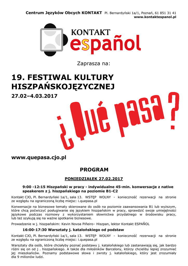 Centrum Języków Obcych KONTAKT Pl. Bernardyński 1a/1, Poznań, 61 851 31 41 www.kontaktespanol.pl Zaprasza na: 19. FESTIWAL KULTURY HISZPAŃSKOJĘZYCZNEJ 27.02–4.03.2017 www.quepasa.cjo.pl PROGRAM PONIEDZIAŁEK 27.02.2017 9:00 -12:15 Hiszpański w pracy - indywidualne 45-min. konwersacje z native speakerem z j. hiszpańskiego na poziomie B1-C2 Kontakt CJO, Pl. Bernardyński 1a/1, sala 13. WSTĘP WOLNY - konieczność rezerwacji na stronie ze względu na ograniczoną liczbę miejsc: i.quepasa.pl Konwersacje na biznesowe tematy skierowane do osób na poziomie zaawansowania B1 lub wyŜszym, które chcą poćwiczyć posługiwanie się językiem hiszpańskim w pracy, sprawdzić swoje umiejętności językowe podczas rozmowy z wykorzystaniem słownictwa przydatnego w środowisku pracy, lub teŜ szykują się na waŜne spotkanie biznesowe. Prowadzenie w j. hiszpańskim: Kevin Novoa Piñeiro– Hiszpan, lektor Kontakt ESPAÑOL 16:00-17:30 Warsztaty j. katalońskiego od podstaw Kontakt CJO, Pl. Bernardyński 1a/1, sala 13. WSTĘP WOLNY - konieczność rezerwacji na stronie ze względu na ograniczoną liczbę miejsc: i.quepasa.pl Warsztaty dla osób, które chciałyby poznać podstawy j. katalońskiego lub zastanawiają się, jak bardzo róŜni się on od j . hiszpańskiego. A takŜe dla miłośników Barcelony, którzy chcieliby lepiej zrozumieć jej mieszkańców. Poznamy podstawowe słowa i zwroty j. katalońskiego, który jest zrozumiały dla 9 milionów ludzi. Prowadzenie w j. hiszpańskim: Carlos Martínez Giménez– Hiszpan, lektor Kontakt ESPAÑOL 16:30-17:30 „La dama del Alba” - spektakl teatralny w j. hiszp. TROPS - Akademickie Centrum Kultury, Św. Rocha 9; www.trops.awf.poznan.pl; WSTĘP WOLNY konieczność rezerwacji na stronie ze względu na ograniczoną liczbę miejsc: i.quepasa.pl Spektakl w reŜyserii Alejandro Casona, w adaptacji Lucila González Alfaya. Pewna asturiańska rodzina, dotknięta tragedią, Ŝyje pogrąŜona w smutku i apatii, aŜ którejś nocy przychodzi do nich tajemnicza pątniczka. Tej samej nocy, rodzina wyciąga młodą dziewczynę z rzeki i udziela jej schronienia w swoim domu. Adela wnosi w Ŝycie rodziny oŜywienie i radość, ale jednocześnie przysparza nowych konfliktów i zmusza do ujawnienia starych sekretów. Jedynie pątniczka moŜe przywrócić równowagę rodzinną i dlatego ponownie zapuka do drzwi rodziny w Noc Świętojańską... Sztuka wystawiona w j. hiszpańskim: Grupa teatralna Sección Bilingüe española de Poznan 17:30-19:00 "El misterio del euskera" – prezentacja w j. hiszp. Cafe Misja, ul. Gołębia 1; www.cafemisja.pl; WSTĘP WOLNY W Kraju Basków ludność posługuje się językiem, który uznawany jest za jeden z najtrudniejszych języków świata. Nawet teraz nikt nie zna jego dokładnego pochodzenia, poniewaŜ język ten nie ma Ŝadnych bliskich powiązań. Podczas tej prezentacji dowiemy się, jak wyglądała jego ewolucja na przestrzeni lat oraz poznamy powody, dla których język nie wygasł i wciąŜ jest aktualny. Prowadzenie w j. hiszpańskim: Kevin Novoa Piñeiro– Hiszpan, lektor Kontakt ESPAÑOL 18:30-19:30 Opowieść o Tangu wraz z nauką kroków podstawowych Południe – ul. A. Mickiewicza 24a/21; www.facebook.com/tangopoludnie; WSTĘP konieczność rezerwacji na stronie ze względu na ograniczoną liczbę miejsc: i.quepasa.pl WOLNY – To idealna okazja dla tych, którzy nigdy przedtem nie mieli styczności z tangiem, poniewaŜ w trakcie spotkania odbędzie się lekcja podstawowych kroków. Klasyczne tango argentyńskie jest tańcem charakteryzującym się improwizacją i bliskością partnerów. Podczas spotkania wysłuchamy równieŜ opowieści o historii tanga i nie tylko… Prowadzenie w j. polskim: Sylwester Łazicki 19:00-20:00 Degustacja win hiszpańskich La Rambla, ul. Woźna 5; www.larambla.pl, Wejściówki: 20 zł do nabycia w sekretariacie Kontakt CJO – liczba miejsc ograniczona W tętniącym Ŝyciem miejscu, w samym sercu Poznania, gdzie klimat hiszpański aŜ unosi się w powietrzu, będziemy poznawać smaki hiszpańskich win. Skosztujemy następujących win: Diorama, Gran Cardiel, Casa De La Vega, Museum Vinea crianza. Spotkanie prowadzone w j. polskim WTOREK 28.02.2017 9:00-10:00 Poranna kawa – Guatemala Casi Cielo – pokaz parzenia wraz z degustacją Kawiarnia Starbucks w PasaŜu Galerii MM, Św. Marcin 24; www.starbucks.pl; WSTĘP WOLNY – konieczność rezerwacji na stronie ze względu na ograniczoną liczbę miejsc: i.quepasa.pl Kolejny dzień festiwalu zaczniemy od wyśmienitej kawy, prosto z Ameryki Południowej. Zobaczymy, jak się parzy kawę metodami alternatywnymi. Guatemala Casi Cielo jest średniopaloną kawą z regionu Antigua w Gwatemali. Jest wyśmienicie kremowa i delikatna, a jednocześnie odpowiednio zaparzona nie daje o sobie zapomnieć, wciąŜ dodając do naparu swoje delikatne kakaowe nuty i nawet mocniejsze nuty cytrusa. Jest to kawa stworzona do delektowania się nią tylko przez pewien czas, poniewaŜ same ziarna zawierające te wspaniałe nuty cytrusowe są zbierane na plantacjach w bardzo krótkim przedziale czasu i to wtedy plantatorzy oddzielają je od reszty, aby stworzyć limitowaną edycję kawy z Gwatemali. Podczas spotkania niespodzianki dla uczestników. Prowadzenie w j. polskim 18:00-19:30 "Pura Vida - przyroda Ameryki Środkowej" – spotkanie podróŜnicze Wydział Nauk Geograficzny i Geologicznych UAM w Poznaniu - sala nr. 4, ul. Krygowskiego 10; wngig.amu.edu.pl; WSTĘP WOLNY Panama, Kostaryka i Nikaragua – duŜo je łączy, a jeszcze więcej dzieli. PodróŜ Śladami Marzeń, której głównym motywem przewodnim była przyroda, bioróŜnorodność i związane z nimi aktywności. Podczas prezentacji zobaczymy podwodny świat w morskim Parku Narodowym Coiba, będziemy śledzić pumę na półwyspie Osa, zajrzymy do krateru wulkanu Masaya i dowiemy się czym jest vulkano boarding. Prowadzenie w j. polskim: Tomasz PodróŜniczego Śladami Marzeń.