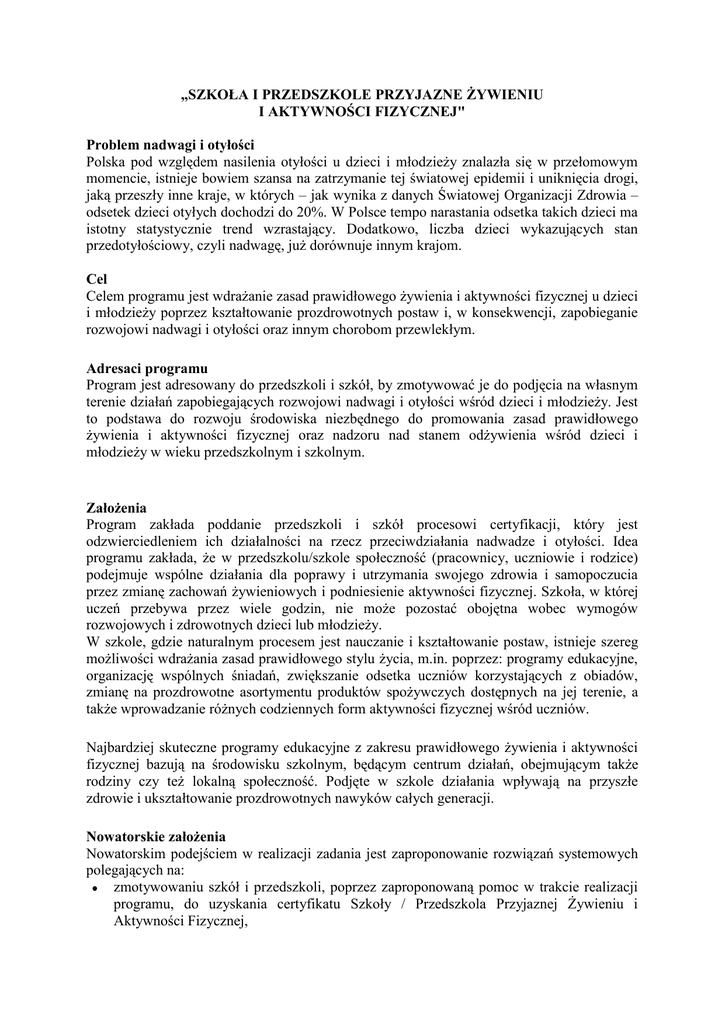 „SZKOŁA I PRZEDSZKOLE PRZYJAZNE ŻYWIENIU I AKTYWNOŚCI FIZYCZNEJ" Problem nadwagi i otyłości Polska pod względem nasilenia otyłości u dzieci i młodzieży znalazła się w przełomowym momencie, istnieje bowiem szansa na zatrzymanie tej światowej epidemii i uniknięcia drogi, jaką przeszły inne kraje, w których – jak wynika z danych Światowej Organizacji Zdrowia – odsetek dzieci otyłych dochodzi do 20%. W Polsce tempo narastania odsetka takich dzieci ma istotny statystycznie trend wzrastający. Dodatkowo, liczba dzieci wykazujących stan przedotyłościowy, czyli nadwagę, już dorównuje innym krajom. Cel Celem programu jest wdrażanie zasad prawidłowego żywienia i aktywności fizycznej u dzieci i młodzieży poprzez kształtowanie prozdrowotnych postaw i, w konsekwencji, zapobieganie rozwojowi nadwagi i otyłości oraz innym chorobom przewlekłym. Adresaci programu Program jest adresowany do przedszkoli i szkół, by zmotywować je do podjęcia na własnym terenie działań zapobiegających rozwojowi nadwagi i otyłości wśród dzieci i młodzieży. Jest to podstawa do rozwoju środowiska niezbędnego do promowania zasad prawidłowego żywienia i aktywności fizycznej oraz nadzoru nad stanem odżywienia wśród dzieci i młodzieży w wieku przedszkolnym i szkolnym. Założenia Program zakłada poddanie przedszkoli i szkół procesowi certyfikacji, który jest odzwierciedleniem ich działalności na rzecz przeciwdziałania nadwadze i otyłości. Idea programu zakłada, że w przedszkolu/szkole społeczność (pracownicy, uczniowie i rodzice) podejmuje wspólne działania dla poprawy i utrzymania swojego zdrowia i samopoczucia przez zmianę zachowań żywieniowych i podniesienie aktywności fizycznej. Szkoła, w której uczeń przebywa przez wiele godzin, nie może pozostać obojętna wobec wymogów rozwojowych i zdrowotnych dzieci lub młodzieży. W szkole, gdzie naturalnym procesem jest nauczanie i kształtowanie postaw, istnieje szereg możliwości wdrażania zasad prawidłowego stylu życia, m.in. poprzez: programy edukacyjne, organizację wspólnych śniadań, zwiększanie odsetka uczniów korzystających z obiadów, zmianę na prozdrowotne asortymentu produktów spożywczych dostępnych na jej terenie, a także wprowadzanie różnych codziennych form aktywności fizycznej wśród uczniów. Najbardziej skuteczne programy edukacyjne z zakresu prawidłowego żywienia i aktywności fizycznej bazują na środowisku szkolnym, będącym centrum działań, obejmującym także rodziny czy też lokalną społeczność. Podjęte w szkole działania wpływają na przyszłe zdrowie i ukształtowanie prozdrowotnych nawyków całych generacji. Nowatorskie założenia Nowatorskim podejściem w realizacji zadania jest zaproponowanie rozwiązań systemowych polegających na: zmotywowaniu szkół i przedszkoli, poprzez zaproponowaną pomoc w trakcie realizacji programu, do uzyskania certyfikatu Szkoły / Przedszkola Przyjaznej Żywieniu i Aktywności Fizycznej, całościowym wdrażaniu programu (udział całego środowiska szkolnego, rodziców, społeczności lokalnej i władz samorządowych), stałym przygotowywaniu przez IŻŻ i AWF materiałów pomocniczych dla nauczycieli, dyrektorów szkół, organizatorów żywienia i rodziców, monitorowaniu wdrażania programu w celu ewentualnej korekty w trakcie jego realizacji. Wdrażanie programu W najbliższych 5 latach program będzie realizowany w 100 placówkach w każdym województwie (25 przedszkoli, 25 szkół podstawowych, 25 gimnazjów i 25 szkół ponadgimnazjalnych), a w następnych latach obejmie kolejne placówki. Program ten jest dobrowolną inicjatywą, stwarza system spontanicznej możliwości przyłączania przedszkola/szkoły do programu, co jest dla nich nobilitacją i realną korzyścią (otrzymują np. specjalne materiały edukacyjne dla placówki, nauczycieli i rodziców z zakresu żywienia i aktywności fizycznej, m.in. plakaty). Przedszkole/szkoła, które pomyślnie wdrożą program zgodnie z opracowanymi kryteriami, otrzymają certyfikat Szkoły / Przedszkola Przyjaznej Żywieniu i Aktywności Fizycznej. Certyfikat Przedszkole/szkoła ubiegające się o certyfikat mają za zadanie tworzenie na swoim terenie środowiska sprzyjającego realizacji założeń programu zwalczania nadwagi i otyłości, promującego prawidłowe żywienie i aktywność fizyczną. Kryteria certyfikacji są zróżnicowane dla poszczególnych rodzajów szkół oraz przedszkoli: CERTYFIKAT W ZAKRESIE ŻYWIENIA Kryteria Opis Zapewnienie śniadań, obiadów i podwieczorków (jeśli są prowadzone) zgodnych z rekomendacjami IŻŻ Dokumentacja Jadłospisy/posiłki zgodne z Raport (1/rok): rekomendacjami IŻŻ, przerwy między posiłkami nie dłuższe niż 3–4 godz., 10-dniowy jadłospis dostęp do wody pitnej między posiłkami. Umieszczanie w widocznym miejscu (dla rodziców) codziennego menu Organizowanie zajęć Podjęcie przynajmniej jednego z Raport (1/rok): motywujących przedszkolaki do przykładowych działań: samodzielnych prozdrowotnych krótki opis działań (rodzaj, wyborów dni warzywne i owocowe np. ilość) owocowe wtorki, marchewkowe zdjęcia z przeprowadzonych środy, zajęć poznawanie nowych smaków, % przedszkolaków wycieczki na okoliczne stragany, uczestniczących w zajęciach Organizacja wystaw prac przedszkolaków promujących zdrowe żywienie Rozwijanie zdolności przedszkolaków i ich wiedzy kulinarnej zgodnej z zasadami racjonalnego żywienia (zajęcia praktyczne) Edukacja rodziców Ograniczenie wpływu reklamy żywności i napojów na terenie przedszkola zabawy, konkursy, teatrzyki, przedstawienia kukiełkowe z wykorzystaniem warzyw i owoców, prace plastyczne, rebusy, układanki Zorganizowanie stałej wystawy prac przedszkolaków na temat prawidłowego żywienia – np. „Warzywa, owoce w każdym posiłku”, „Mleko i jego produkty na co dzień” Podjęcie przynajmniej jednego z wymienionych działań: zaj