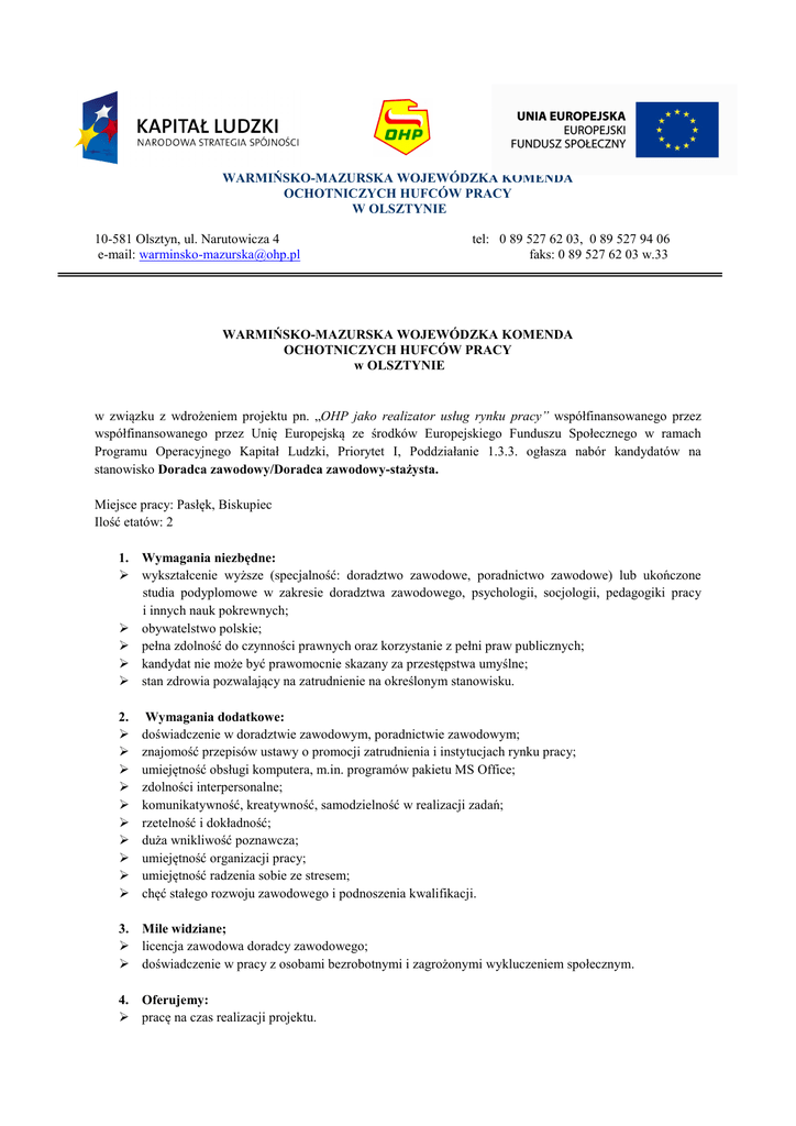 WARMIŃSKO-MAZURSKA WOJEWÓDZKA KOMENDA OCHOTNICZYCH HUFCÓW PRACY W OLSZTYNIE 10-581 Olsztyn, ul. Narutowicza 4 e-mail: [email protected] tel: 0 89 527 62 03, 0 89 527 94 06 faks: 0 89 527 62 03 w.33 WARMIŃSKO-MAZURSKA WOJEWÓDZKA KOMENDA OCHOTNICZYCH HUFCÓW PRACY w OLSZTYNIE w związku z wdrożeniem projektu pn. „OHP jako realizator usług rynku pracy” współfinansowanego przez współfinansowanego przez Unię Europejską ze środków Europejskiego Funduszu Społecznego w ramach Programu Operacyjnego Kapitał Ludzki, Priorytet I, Poddziałanie 1.3.3. ogłasza nabór kandydatów na stanowisko Doradca zawodowy/Doradca zawodowy-stażysta. Miejsce pracy: Pasłęk, Biskupiec Ilość etatów: 2 1. Wymagania niezbędne: wykształcenie wyższe (specjalność: doradztwo zawodowe, poradnictwo zawodowe) lub ukończone studia podyplomowe w zakresie doradztwa zawodowego, psychologii, socjologii, pedagogiki pracy i innych nauk pokrewnych; obywatelstwo polskie; pełna zdolność do czynności prawnych oraz korzystanie z pełni praw publicznych; kandydat nie może być prawomocnie skazany za przestępstwa umyślne; stan zdrowia pozwalający na zatrudnienie na określonym stanowisku. 2. Wymagania dodatkowe: doświadczenie w doradztwie zawodowym, poradnictwie zawodowym; znajomość przepisów ustawy o promocji zatrudnienia i instytucjach rynku pracy; umiejętność obsługi komputera, m.in. programów pakietu MS Office; zdolności interpersonalne; komunikatywność, kreatywność, samodzielność w realizacji zadań; rzetelność i dokładność; duża wnikliwość poznawcza; umiejętność organizacji pracy; umiejętność radzenia sobie ze stresem; chęć stałego rozwoju zawodowego i podnoszenia kwalifikacji. 3. Mile widziane; licencja zawodowa doradcy zawodowego; doświadczenie w pracy z osobami bezrobotnymi i zagrożonymi wykluczeniem społecznym. 4. Oferujemy: pracę na czas realizacji projektu. 5. Wymagane dokumenty i oświadczenia. Kandydaci na stanowisko doradcy zawodowego/ doradcy zawodowego -stażysty obowiązani są przedłożyć następujące dokumenty i oświadczenia: życiorys (CV); list motywacyjny; kserokopie dokumentów potwierdzających wykształcenie; kserokopie dokumentów potwierdzających doświadczenie zawodowe; kserokopie innych dokumentów o posiadanych kwalifikacjach i umiejętnościach; oświadczenie o posiadaniu pełnej zdolności do czynności prawnych, korzystaniu z pełni praw publicznych oraz o niekaralności za przestępstwa umyślne. Wymagane dokumenty aplikacyjne: list motywacyjny, CV, powinny być opatrzone klauzulą: „Wyrażam zgodę na przetwarzanie moich danych osobowych zawartych w ofercie pracy dla potrzeb niezbędnych do realizacji procesu rekrutacji zgodnie z ustawą z dnia 29 sierpnia 1997r. o ochronie danych osobowych ( Dz. U. z 2002 r. Nr 101, poz. 926, z późn. zm.). Ofertę zawierającą wszystkie w/w dokumenty i oświadczenia należy składać na adres: Warmińsko-Mazurska Wojewódzka Komenda OHP, ul. Narutowicza 4, 10-581 Olsztyn. Termin składania ofert upływa w dniu 04.05.2010 r. Wybrani kandydaci zostaną zaproszeni na rozmowę kwalifikacyjną. Wojewódzki Komendant OHP Jarosław Dzioba Sporządził: Anna Krzyżelewska