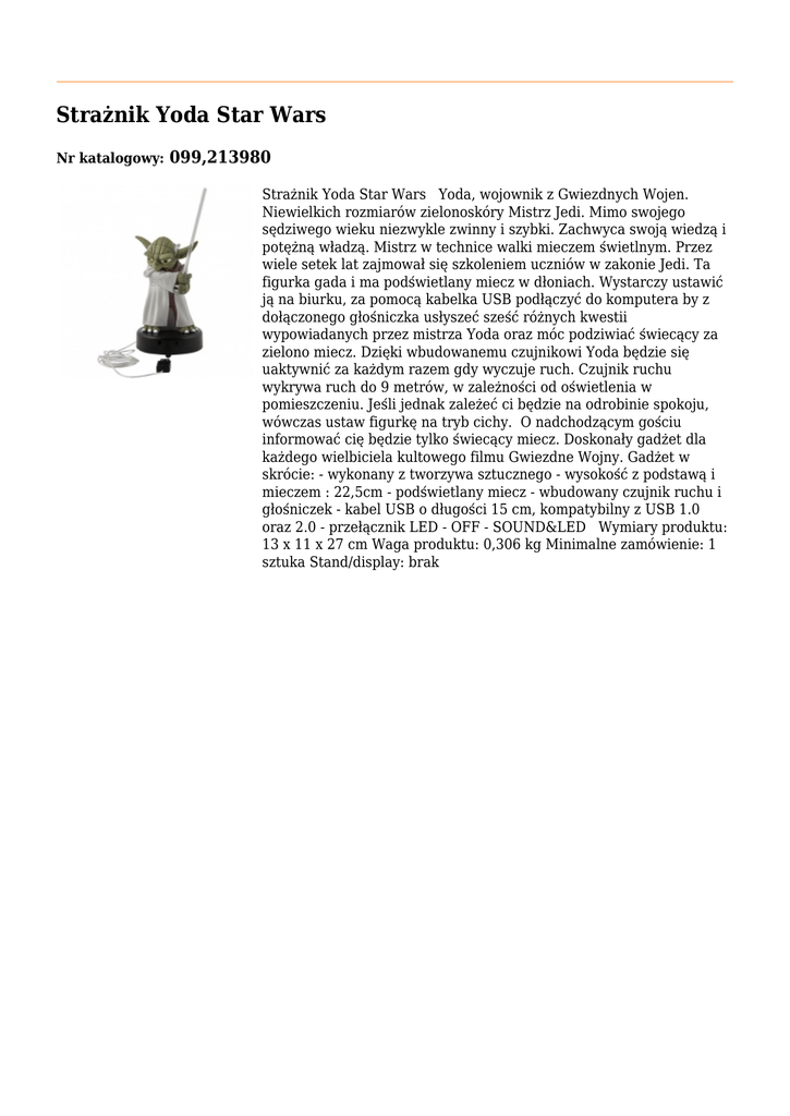 Strażnik Yoda Star Wars Nr katalogowy: 099,213980 Strażnik Yoda Star Wars Yoda, wojownik z Gwiezdnych Wojen. Niewielkich rozmiarów zielonoskóry Mistrz Jedi. Mimo swojego sędziwego wieku niezwykle zwinny i szybki. Zachwyca swoją wiedzą i potężną władzą. Mistrz w technice walki mieczem świetlnym. Przez wiele setek lat zajmował się szkoleniem uczniów w zakonie Jedi. Ta figurka gada i ma podświetlany miecz w dłoniach. Wystarczy ustawić ją na biurku, za pomocą kabelka USB podłączyć do komputera by z dołączonego głośniczka usłyszeć sześć różnych kwestii wypowiadanych przez mistrza Yoda oraz móc podziwiać świecący za zielono miecz. Dzięki wbudowanemu czujnikowi Yoda będzie się uaktywnić za każdym razem gdy wyczuje ruch. Czujnik ruchu wykrywa ruch do 9 metrów, w zależności od oświetlenia w pomieszczeniu. Jeśli jednak zależeć ci będzie na odrobinie spokoju, wówczas ustaw figurkę na tryb cichy. O nadchodzącym gościu informować cię będzie tylko świecący miecz. Doskonały gadżet dla każdego wielbiciela kultowego filmu Gwiezdne Wojny. Gadżet w skrócie: - wykonany z tworzywa sztucznego - wysokość z podstawą i mieczem : 22,5cm - podświetlany miecz - wbudowany czujnik ruchu i głośniczek - kabel USB o długości 15 cm, kompatybilny z USB 1.0 oraz 2.0 - przełącznik LED - OFF - SOUND&LED Wymiary produktu: 13 x 11 x 27 cm Waga produktu: 0,306 kg Minimalne zamówienie: 1 sztuka Stand/display: brak