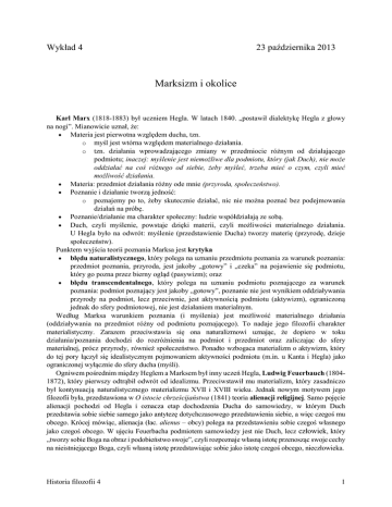 Wykład 4 23 października 2013 Marksizm i okolice Karl Marx (1818-1883) był uczniem Hegla. W latach 1840. „postawił dialektykę Hegla z głowy na nogi”. Mianowicie uznał, że: Materia jest pierwotna względem ducha, tzn. o myśl jest wtórna względem materialnego działania. o tzn. działania wprowadzającego zmiany w przedmiocie różnym od działającego podmiotu; inaczej: myślenie jest niemożliwe dla podmiotu, który (jak Duch), nie może oddziałać na coś różnego od siebie, żeby myśleć, trzeba mieć o czym, czyli mieć możliwość działania. Materia: przedmiot działania różny ode mnie (przyroda, społeczeństwo). Poznanie i działanie tworzą jedność: o poznajemy po to, żeby skutecznie działać, nic nie można poznać bez podejmowania działań na próbę. Poznanie/działanie ma charakter społeczny: ludzie współdziałają ze sobą. Duch, czyli myślenie, powstaje dzięki materii, czyli możliwości materialnego działania. U Hegla było na odwrót: myślenie (przedstawienie Ducha) tworzy materię (przyrodę, dzieje społeczeństw). Punktem wyjścia teorii poznania Marksa jest krytyka błędu naturalistycznego, który polega na uznaniu przedmiotu poznania za warunek poznania: przedmiot poznania, przyroda, jest jakoby „gotowy” i „czeka” na pojawienie się podmiotu, który go pozna przez bierny ogląd (pasywizm); oraz błędu transcendentalnego, który polega na uznaniu podmiotu poznającego za warunek poznania: podmiot poznający jest jakoby „gotowy”, poznanie nie jest wynikiem oddziaływania przyrody na podmiot, lecz przeciwnie, jest aktywnością podmiotu (aktywizm), ograniczoną jednak do sfery podmiotowej, nie jest działaniem materialnym. Według Marksa warunkiem poznania (i myślenia) jest możliwość materialnego działania (oddziaływania na przedmiot różny od podmiotu poznającego). To nadaje jego filozofii charakter materialistyczny. Zarazem przeciwstawia się ona naturalizmowi uznając, że dopiero w toku działania/poznania dochodzi do rozróżnienia na podmiot i przedmiot oraz zaliczając do sfery materialnej, prócz przyrody, również społeczeństwo. Ponadto wzbogaca materializm o aktywizm, który do tej pory łączył się idealistycznym pojmowaniem aktywności podmiotu (m.in. u Kanta i Hegla) jako ograniczonej wyłącznie do sfery ducha (myśli). Ogniwem pośrednim między Heglem a Marksem był inny uczeń Hegla, Ludwig Feuerbauch (18041872), który pierwszy odtrąbił odwrót od idealizmu. Przeciwstawił mu materializm, który zasadniczo był kontynuacją naturalistycznego materializmu XVII i XVIII wieku. Jednak nowym motywem jego filozofii była, przedstawiona w O istocie chrześcijaństwa (1841) teoria alienacji religijnej. Samo pojęcie alienacji pochodzi od Hegla i oznacza etap dochodzenia Ducha do samowiedzy, w którym Duch przedstawia sobie siebie samego jako antytezę dotychczasowego przedstawienia siebie, a więc czegoś mu obcego. Krócej mówiąc, alienacja (łac. alienus – obcy) polega na przedstawieniu sobie czegoś własnego jako czegoś obcego. W ujęciu Feuerbacha podmiotem samowiedzy jest nie Duch, lecz człowiek, który „tworzy sobie Boga na obraz i podobieństwo swoje”, czyli rozpoznaje własną istotę przenosząc swoje cechy na nieistniejącego Boga, czyli własną istotę przedstawiając sobie jako istotę czegoś obcego, nieczłowieka. Historia filozofii 4 1 Historia religii jest zatem historią samowiedzy ludzkości. Bóstwa religii prymitywnych są potężne i złośliwe, ponieważ człowiek zrazu ceni sobie w sobie tylko siłę. W chrześcijaństwie samowiedza ludzkości osiąga swój szczyt dzięki docenieniu miłości i mądrości. Jednak alienacja polegająca na przeniesieniu najcenniejszych cech człowieka poza niego, na Boga, zniechęca człowieka do zabiegów o poprawę własnego losu. Człowiek bowiem czuje się niegodny miłości współczującej jego niedoli, nie dość mądry, by wiedzieć, jakie podjąć kroki, i nie dość potężny, żeby te kroki były skuteczne. Skoro to Bóg jest wszechwiedzącą i wszechwładną miłością, to człowiek, zamiast wziąć los we własne ręce, zdaje się na Bożą Opatrzność. Dlatego alienacja religijna wymaga zniesienia za pomocą uświadomienia jej sobie. Rozpoznawszy, że pod postacią Boga człowiek wielbi siebie samego, człowiek, dzięki miłości własnej użyje własnej mądrości i sił, przestając oglądać się na Opatrzność. Marx, najpierw gorący zwolennik Feuerbacha, później doszedł do wniosku, że jego teoria alienacji religijnej jest obciążona pozostałością idealizmu, jaką jest myśl, że do zniesienia alienacji wystarczy uświadomienie jej sobie (jak u Hegla: zniesienie alienacji polega na uświadomieniu sobie przez Ducha, że antyteza jest jego własnym przedstawieniem, co prowadzi do syntezy). Konsekwentny materializm musi uznać prymat materii nad duchem, czyli poszukiwać materialnych źródeł alienacji, których usunięcie jest do zniesienia niezbędne. Religia, w ujęciu Marksa, jest „opium dla ludu”: uśmierza ból spowodowany wyzyskiem, obiecując pośmiertną nagrodę i utrzymuje lud w narkotycznej apatii (posłuszeństwie), co jest w interesie kapitalisty. Źródłem alienacji religijnej jest zatem wyzysk ekonomiczny, toteż jej zniesienie jest możliwe tylko przez zniesienie wyzysku. Wyzysk ekonomiczny jest według Marksa, inaczej niż według socjalistów utopijnych, tylko jednym z aspektów ucisku. Teoretycznie donioślejsze są różne formy alienacji, z których alienacja religijna nie jest najważniejsza. O wiele większe znaczenie ma alienacja pracy, która polega na przedstawieniu sobie pracy jako czegoś obcego, jako przeszkody w realizowaniu własnego człowieczeństwa, we własnym rozwoju. Nie zaś jako czynności najbardziej ludzkiej (bardziej ludzkiej od myślenia, które jest wtórne względem materialnego działania, a więc pracy), głównego środka realizacji własnego człowiecze