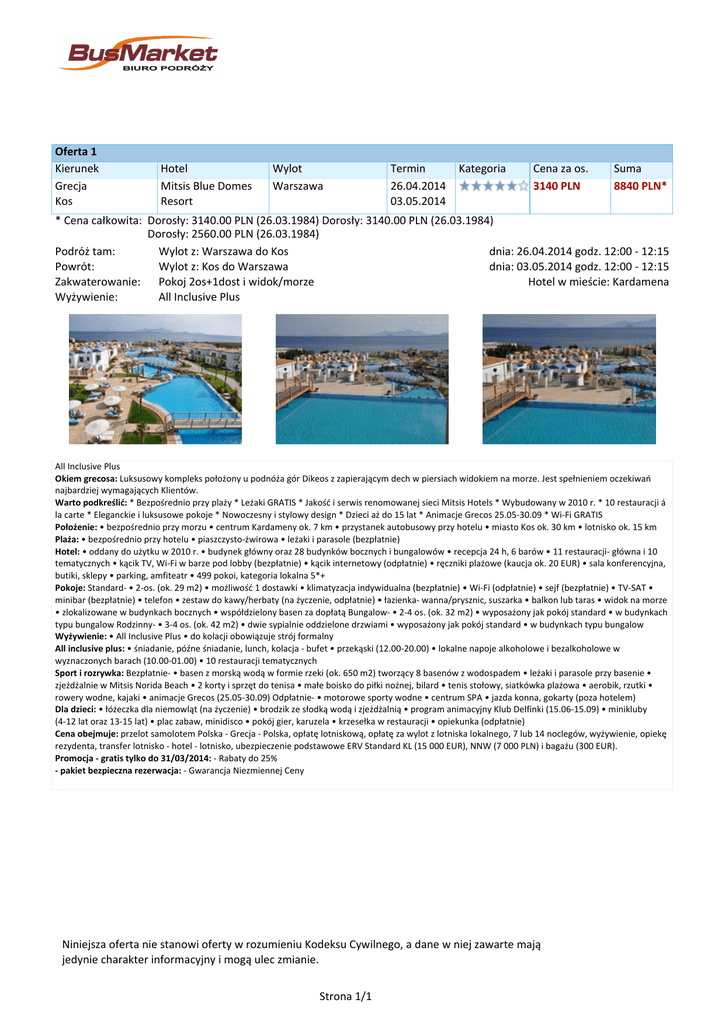 Oferta 1 Kierunek Grecja Kos Hotel Mitsis Blue Domes Resort Wylot Warszawa Termin 26.04.2014 03.05.2014 Kategoria Cena za os. 3140 PLN Suma 8840 PLN* * Cena całkowita: Dorosły: 3140.00 PLN (26.03.1984) Dorosły: 3140.00 PLN (26.03.1984) Dorosły: 2560.00 PLN (26.03.1984) Podróż tam: Wylot z: Warszawa do Kos dnia: 26.04.2014 godz. 12:00 - 12:15 Powrót: Wylot z: Kos do Warszawa dnia: 03.05.2014 godz. 12:00 - 12:15 Zakwaterowanie: Pokoj 2os+1dost i widok/morze Hotel w mieście: Kardamena Wyżywienie: All Inclusive Plus All Inclusive Plus Okiem grecosa: Luksusowy kompleks położony u podnóża gór Dikeos z zapierającym dech w piersiach widokiem na morze. Jest spełnieniem oczekiwań najbardziej wymagających Klientów. Warto podkreślić: * Bezpośrednio przy plaży * Leżaki GRATIS * Jakość i serwis renomowanej sieci Mitsis Hotels * Wybudowany w 2010 r. * 10 restauracji á la carte * Eleganckie i luksusowe pokoje * Nowoczesny i stylowy design * Dzieci aż do 15 lat * Animacje Grecos 25.05-30.09 * Wi-Fi GRATIS Położenie: • bezpośrednio przy morzu • centrum Kardameny ok. 7 km • przystanek autobusowy przy hotelu • miasto Kos ok. 30 km • lotnisko ok. 15 km Plaża: • bezpośrednio przy hotelu • piaszczysto-żwirowa • leżaki i parasole (bezpłatnie) Hotel: • oddany do użytku w 2010 r. • budynek główny oraz 28 budynków bocznych i bungalowów • recepcja 24 h, 6 barów • 11 restauracji- główna i 10 tematycznych • kącik TV, Wi-Fi w barze pod lobby (bezpłatnie) • kącik internetowy (odpłatnie) • ręczniki plażowe (kaucja ok. 20 EUR) • sala konferencyjna, butiki, sklepy • parking, amfiteatr • 499 pokoi, kategoria lokalna 5*+ Pokoje: Standard- • 2-os. (ok. 29 m2) • możliwość 1 dostawki • klimatyzacja indywidualna (bezpłatnie) • Wi-Fi (odpłatnie) • sejf (bezpłatnie) • TV-SAT • minibar (bezpłatnie) • telefon • zestaw do kawy/herbaty (na życzenie, odpłatnie) • łazienka- wanna/prysznic, suszarka • balkon lub taras • widok na morze • zlokalizowane w budynkach bocznych • współdzielony basen za dopłatą Bungalow- • 2-4 os. (ok. 32 m2) • wyposażony jak pokój standard • w budynkach typu bungalow Rodzinny- • 3-4 os. (ok. 42 m2) • dwie sypialnie oddzielone drzwiami • wyposażony jak pokój standard • w budynkach typu bungalow Wyżywienie: • All Inclusive Plus • do kolacji obowiązuje strój formalny All inclusive plus: • śniadanie, późne śniadanie, lunch, kolacja - bufet • przekąski (12.00-20.00) • lokalne napoje alkoholowe i bezalkoholowe w wyznaczonych barach (10.00-01.00) • 10 restauracji tematycznych Sport i rozrywka: Bezpłatnie- • basen z morską wodą w formie rzeki (ok. 650 m2) tworzący 8 basenów z wodospadem • leżaki i parasole przy basenie • zjeżdżalnie w Mitsis Norida Beach • 2 korty i sprzęt do tenisa • małe boisko do piłki nożnej, bilard • tenis stołowy, siatkówka plażowa • aerobik, rzutki • rowery wodne, kajaki • animacje Grecos (25.05-30.09) Odpłatnie- • motorowe sporty wodne • centrum SPA • jazda konna, gokarty (poza hotelem) Dla dzieci: • łóżeczka dla niemowląt (na życzenie) • brodzik ze słodką wodą i zjeżdżalnią • program animacyjny Klub Delfinki (15.06-15.09) • minikluby (4-12 lat oraz 13-15 lat) • plac zabaw, minidisco • pokój gier, karuzela • krzesełka w restauracji • opiekunka (odpłatnie) Cena obejmuje: przelot samolotem Polska - Grecja - Polska, opłatę lotniskową, opłatę za wylot z lotniska lokalnego, 7 lub 14 noclegów, wyżywienie, opiekę rezydenta, transfer lotnisko - hotel - lotnisko, ubezpieczenie podstawowe ERV Standard KL (15 000 EUR), NNW (7 000 PLN) i bagażu (300 EUR). Promocja - gratis tylko do 31/03/2014: - Rabaty do 25% - pakiet bezpieczna rezerwacja: - Gwarancja Niezmiennej Ceny Niniejsza oferta nie stanowi oferty w rozumieniu Kodeksu Cywilnego, a dane w niej zawarte mają jedynie charakter informacyjny i mogą ulec zmianie. Strona 1/1 Powered by TCPDF (www.tcpdf.org)