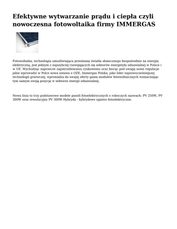 Efektywne wytwarzanie prądu i ciepła czyli nowoczesna fotowoltaika firmy IMMERGAS Fotowoltaika, technologia umożliwiająca przemianę światła słonecznego bezpośrednio na energię elektryczną, jest jednym z najszybciej rozwijających się sektorów energetyki odnawialnej w Polsce i w UE. Wychodząc naprzeciw zapotrzebowaniu rynkowemu oraz biorąc pod uwagę nowe regulacje jakie wprowadzi w Polce nowa ustawa o OZE, Immergas Polska, jako lider najnowocześniejszej technologii grzewczej, wprowadza do swojej oferty gamę modułów fotowoltaicznych wzmacniając tym samym swoją pozycję w sektorze energii odnawialnej. Nowa linia to trzy podstawowe modele paneli fotoelektrycznych o roboczych nazwach: PV 250W, PV 300W oraz rewolucyjny PV 300W Hybryda - hybrydowe ogniwo fotoelektryczne. Moduły fotowoltaiczne PV 250W i PV 300W – to urządzenia służące do konwersji energii promieniowania słonecznego na prąd elektryczny. Budowa modułów oparta jest na polikrystalicznych ogniwach krzemu. Moduły te mogą zostać wykorzystane zarówno w instalacjach wyspowych „off-grid” tj. samodzielnych, bez podłączenia do krajowej sieci energetycznej, jak również w instalacjach „on-grid”, podłączonych do sieci energetycznej. Moduł fotowoltaiczny PV 250W o mocy max Pmax = 250W/m2 (moc szczytowa, przy napromieniowaniu słonecznym 1000 W/m2) zbudowany jest z 60 ogniw połączonych szeregowo-równolegle, szczelnie zalaminowanych, pokrytych szybą hartowaną o grubości 4 milimetrów, oprawionych w specjalny, opatentowany profil aluminiowy. Moduł fotowoltaiczny PV 300W o mocy max Pmax = 300W/m2 (moc szczytowa, przy napromieniowaniu słonecznym 1000 W/m2) zbudowany jest z 72 ogniw połączonych szeregowo-równolegle, szczelnie zalaminowanych, pokrytych szybą hartowaną o grubości 4 milimetrów, oprawionych w specjalny, opatentowany profil aluminiowy. System hybrydowy: panel fotowoltaiczny + kolektor słoneczny Rewolucyjnym rozwiązaniem techniki fotoelektrycznej dostępnym w ofercie Immergas jest moduł PV 300W Hybryda. Hybrydowy panel słoneczny jest połączeniem kolektora słonecznego płaskiego przetwarzającego energię słoneczną w energię cieplną z modułem fotowoltaicznym przetwarzającym promieniowanie słoneczne w prąd elektryczny. Kolektor hybrydowy PV 300W Hybryda jest przeznaczony do podgrzania wody użytkowej lub ogrzewania budynków przy równoczesnej produkcji prądu. Konstrukcja kolektora i zastosowane materiały zapewniają wysoką wydajność cieplną przy zachowaniu korzystnej sprawności w zakresie produkcji prądu. Połączenie panelu fotowoltaicznego z kolektorem słonecznym pozwala lepiej zagospodarować miejsce pod instalację słoneczną i wykorzystać w użyteczny sposób ciepło odpadowe z ogniw PV. W efekcie radykalnie rośnie ogólna efektywność wykorzystania energii słonecznej. Takie połączenie ma dwie ważne korzyści. Pierwszą z nich jest chłodzenie ogniw w wyniku, którego pracują one z wyższą sprawnością oraz zwiększa się ich żywotność. Wraz ze wzrostem temperatury sprawność ogniw spada, dlatego ich chłodzenie z punktu widzenia efektywności pracy instalacji fotowoltaicznej jest bardzo korzystne. Drugą zaletą jest wykorzystanie odpadowego ciepła w użyteczny sposób. Za pomocą jednej instalacji możliwe jest dostarczenie do budynku zarówno ciepła, jak i elektryczności. Zamiast dwóch osobnych instalacji, fotowoltaicznej do produkcji energii elektrycznej i kolektorów słonecznych do ogrzewania ciepłej wody, na dachu instalowana jest jedna. Rozwiązanie to ma dużą zaletę zwłaszcza w przypadku ograniczonego miejsca na montaż instalacji słonecznej. Ponadto dzięki zastosowaniu kolektorów hybrydowych zostaną obniżone koszty instalacji solarnej. W miejsce dwóch instalacji (solarnej i PV) można zastosować jedną instalację – takie rozwiązanie obniży koszty prac instalacyjnych o ok. 30%! W kolektorach hybrydowych zastosowano absorbery (wymienniki) bioniczne wykonane z aluminium, które zapewniają większą wydajność od dostępnych wymienników (meandrycznych i harfowych wykonywanych w technologii połączenia rur z blachą absorbera). Dzięki temu płaska, a zarazem prosta powierzchnia z jednej strony absorbera, pozwala uzyskać lepsze połączenie absorbera z ogniwem PV. To także możliwość wykonania absorbera o bardzo dużej gęstości kanałów. Warto również dodać, że odbiór ciepła przez czynnik solarny z absorbera bionicznego jest do 25% większy, niż w przypadku absorbera standardowego ze względu na dużo większą powierzchnię styku. Zalety kolektora PV 300W Hybryda ● ● ● ● ● Uzyskanie trwałej szczelności i wysokiej stabilności dzięki zaprojektowaniu profilu głównego Zastosowanie wydajnego absorbera bionicznego Uzyskanie optymalnego bilansu cieplnego (transferu ciepła z ogniw do absorbera odbierającego ciepło) co prowadzi do uzyskania dużej wydajności cieplnej przy zachowaniu korzystnej wydajności w zakresie produkcji prądu Produkcja energii cieplnej i energetycznej przy zastosowaniu jednej instalacji (obniżenie kosztów montażu) Zwiększenie wydajności w zakresie produkcji energii elektrycznej o ok. 15% w stosunku do standardowego kolektora PV Najwyższa jakość technologii fotowoltaicznej Immergas jako lider branży techniki grzewczej stawia na jakość produktów oferowanych dla użytkowników. Ogniwa lutowane są bezdotykowo za pomocą ciepłego powietrza , co minimalizuje powstawanie mikronapięć w strukturze ogniw. Cały proces lutowania modułu fotowoltaicznego odbywa się w wysokiej klasy laminatorach w warunkach głębokiej próżni. Parametry laminacji są ściśle określone technologią i nie mogą być zmieniane przez operatorów – gwarantuje to wysoką jakość i powtarzalność laminacji. Proces wytwarzania jest kontrolowany i monitorowany na całej płaszczyźnie produkcji: przeprowadzenie komputerowego monitoringu jakości ogniw przed i po luto