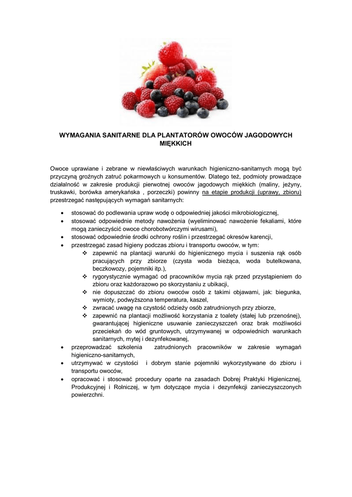 WYMAGANIA SANITARNE DLA PLANTATORÓW OWOCÓW JAGODOWYCH MI KKICH Owoce uprawiane i zebrane w niew ciwych warunkach higieniczno-sanitarnych mog by przyczyn gro nych zatru pokarmowych u konsumentów. Dlatego te , podmioty prowadz ce dzia alno w zakresie produkcji pierwotnej owoców jagodowych mi kkich (maliny, je yny, truskawki, borówka ameryka ska , porzeczki) powinny na etapie produkcji (uprawy, zbioru) przestrzega nast puj cych wymaga sanitarnych: stosowa do podlewania upraw wod o odpowiedniej jako ci mikrobiologicznej, stosowa odpowiednie metody nawo enia (wyeliminowa nawo enie fekaliami, które mog zanieczy ci owoce chorobotwórczymi wirusami), stosowa odpowiednie rodki ochrony ro lin i przestrzega okresów karencji, przestrzega zasad higieny podczas zbioru i transportu owoców, w tym: zapewni na plantacji warunki do higienicznego mycia i suszenia r k osób pracuj cych przy zbiorze (czysta woda bie ca, woda butelkowana, beczkowozy, pojemniki itp.), rygorystycznie wymaga od pracowników mycia r k przed przyst pieniem do zbioru oraz ka dorazowo po skorzystaniu z ubikacji, nie dopuszcza do zbioru owoców osób z takimi objawami, jak: biegunka, wymioty, podwy szona temperatura, kaszel, zwraca uwag na czysto odzie y osób zatrudnionych przy zbiorze, zapewni na plantacji mo liwo korzystania z toalety (sta ej lub przeno nej), gwarantuj cej higieniczne usuwanie zanieczyszcze oraz brak mo liwo ci przecieka do wód gruntowych, utrzymywanej w odpowiednich warunkach sanitarnych, mytej i dezynfekowanej, przeprowadza szkolenia zatrudnionych pracowników w zakresie wymaga higieniczno-sanitarnych, utrzymywa w czysto ci i dobrym stanie pojemniki wykorzystywane do zbioru i transportu owoców, opracowa i stosowa procedury oparte na zasadach Dobrej Praktyki Higienicznej, Produkcyjnej i Rolniczej, w tym dotycz ce mycia i dezynfekcji zanieczyszczonych powierzchni.