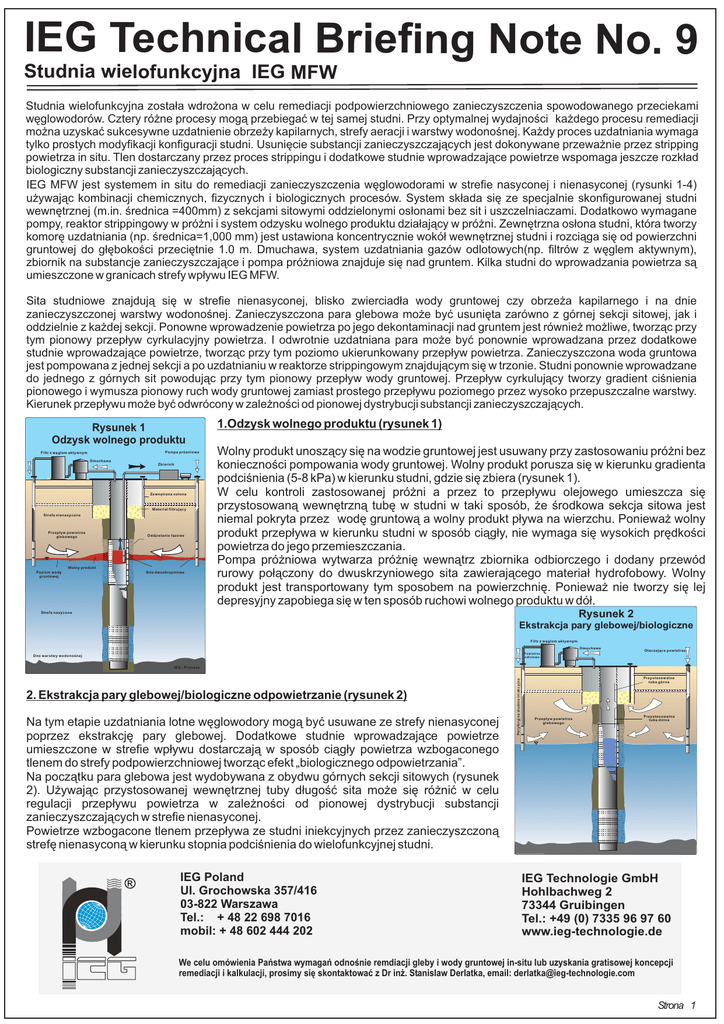 IEG Technical Briefing Note No. 9 Studnia wielofunkcyjna IEG MFW Studnia wielofunkcyjna zosta³a wdro¿ona w celu remediacji podpowierzchniowego zanieczyszczenia spowodowanego przeciekami wêglowodorów. Cztery ró¿ne procesy mog¹ przebiegaæ w tej samej studni. Przy optymalnej wydajnoœci ka¿dego procesu remediacji mo¿na uzyskaæ sukcesywne uzdatnienie obrze¿y kapilarnych, strefy aeracji i warstwy wodonoœnej. Ka¿dy proces uzdatniania wymaga tylko prostych modyfikacji konfiguracji studni. Usuniêcie substancji zanieczyszczaj¹cych jest dokonywane przewa¿nie przez stripping powietrza in situ. Tlen dostarczany przez proces strippingu i dodatkowe studnie wprowadzaj¹ce powietrze wspomaga jeszcze rozk³ad biologiczny substancji zanieczyszczaj¹cych. IEG MFW jest systemem in situ do remediacji zanieczyszczenia wêglowodorami w strefie nasyconej i nienasyconej (rysunki 1-4) u¿ywaj¹c kombinacji chemicznych, fizycznych i biologicznych procesów. System sk³ada siê ze specjalnie skonfigurowanej studni wewnêtrznej (m.in. œrednica =400mm) z sekcjami sitowymi oddzielonymi os³onami bez sit i uszczelniaczami. Dodatkowo wymagane pompy, reaktor strippingowy w pró¿ni i system odzysku wolnego produktu dzia³aj¹cy w pró¿ni. Zewnêtrzna os³ona studni, która tworzy komorê uzdatniania (np. œrednica=1,000 mm) jest ustawiona koncentrycznie wokó³ wewnêtrznej studni i rozci¹ga siê od powierzchni gruntowej do g³êbokoœci przeciêtnie 1.0 m. Dmuchawa, system uzdatniania gazów odlotowych(np. filtrów z wêglem aktywnym), zbiornik na substancje zanieczyszczaj¹ce i pompa pró¿niowa znajduje siê nad gruntem. Kilka studni do wprowadzania powietrza s¹ umieszczone w granicach strefy wp³ywu IEG MFW. Sita studniowe znajduj¹ siê w strefie nienasyconej, blisko zwierciad³a wody gruntowej czy obrze¿a kapilarnego i na dnie zanieczyszczonej warstwy wodonoœnej. Zanieczyszczona para glebowa mo¿e byæ usuniêta zarówno z górnej sekcji sitowej, jak i oddzielnie z ka¿dej sekcji. Ponowne wprowadzenie powietrza po jego dekontaminacji nad gruntem jest równie¿ mo¿liwe, tworz¹c przy tym pionowy przep³yw cyrkulacyjny powietrza. I odwrotnie uzdatniana para mo¿e byæ ponownie wprowadzana przez dodatkowe studnie wprowadzaj¹ce powietrze, tworz¹c przy tym poziomo ukierunkowany przep³yw powietrza. Zanieczyszczona woda gruntowa jest pompowana z jednej sekcji a po uzdatnianiu w reaktorze strippingowym znajduj¹cym siê w trzonie. Studni ponownie wprowadzane do jednego z górnych sit powoduj¹c przy tym pionowy przep³yw wody gruntowej. Przep³yw cyrkuluj¹cy tworzy gradient ciœnienia pionowego i wymusza pionowy ruch wody gruntowej zamiast prostego przep³ywu poziomego przez wysoko przepuszczalne warstwy. Kierunek przep³ywu mo¿e byæ odwrócony w zale¿noœci od pionowej dystrybucji substancji zanieczyszczaj¹cych. Rysunek 1 Odzysk wolnego produktu Pompa prózniowa Filtr z wæglem aktywnym Dmuchawa Zbiornik Zewnætrzna osùona Materiaù filtrujàcy Strefa nienasycona Przepùyw powietrza glebowego Oddzielanie fazowe Wolny produkt Poziom wody gruntowej Sito dwuskrzyniowe 1.Odzysk wolnego produktu (rysunek 1) Wolny produkt unosz¹cy siê na wodzie gruntowej jest usuwany przy zastosowaniu pró¿ni bez koniecznoœci pompowania wody gruntowej. Wolny produkt porusza siê w kierunku gradienta podciœnienia (5-8 kPa) w kierunku studni, gdzie siê zbiera (rysunek 1). W celu kontroli zastosowanej pró¿ni a przez to przep³ywu olejowego umieszcza siê przystosowan¹ wewnêtrzn¹ tubê w studni w taki sposób, ¿e œrodkowa sekcja sitowa jest niemal pokryta przez wodê gruntow¹ a wolny produkt p³ywa na wierzchu. Poniewa¿ wolny produkt przep³ywa w kierunku studni w sposób ci¹g³y, nie wymaga siê wysokich prêdkoœci powietrza do jego przemieszczania. Pompa pró¿niowa wytwarza pró¿niê wewn¹trz zbiornika odbiorczego i dodany przewód rurowy po³¹czony do dwuskrzyniowego sita zawieraj¹cego materia³ hydrofobowy. Wolny produkt jest transportowany tym sposobem na powierzchniê. Poniewa¿ nie tworzy siê lej depresyjny zapobiega siê w ten sposób ruchowi wolnego produktu w dó³. Rysunek 2 Strefa nasycona Ekstrakcja pary glebowej/biologiczne Filtr z wæglem aktywnym Dmuchawa Otaczajàce powietrze Powietrze odlotowe Dno warstwy wodonoúnej 2. Ekstrakcja pary glebowej/biologiczne odpowietrzanie (rysunek 2) Na tym etapie uzdatniania lotne wêglowodory mog¹ byæ usuwane ze strefy nienasyconej poprzez ekstrakcjê pary glebowej. Dodatkowe studnie wprowadzaj¹ce powietrze umieszczone w strefie wp³ywu dostarczaj¹ w sposób ci¹g³y powietrza wzbogaconego tlenem do strefy podpowierzchniowej tworz¹c efekt „biologicznego odpowietrzania”. Na pocz¹tku para glebowa jest wydobywana z obydwu górnych sekcji sitowych (rysunek 2). U¿ywaj¹c przystosowanej wewnêtrznej tuby d³ugoœæ sita mo¿e siê ró¿niæ w celu regulacji przep³ywu powietrza w zale¿noœci od pionowej dystrybucji substancji zanieczyszczaj¹cych w strefie nienasyconej. Powietrze wzbogacone tlenem przep³ywa ze studni iniekcyjnych przez zanieczyszczon¹ strefê nienasycon¹ w kierunku stopnia podciœnienia do wielofunkcyjnej studni. IEG Poland UI. Grochowska 357/416 03-822 Warszawa Tel.: + 48 22 698 7016 mobil: + 48 602 444 202 Peryferyjna studnia iniekcyjna IEG - Process Przystosowalna tuba górna Przepùyw powietrza glebowego Przystosowalna tuba dolna IEG - Process IEG Technologie GmbH Hohlbachweg 2 73344 Gruibingen Tel.: +49 (0) 7335 96 97 60 www.ieg-technologie.de We celu omówienia Pañstwa wymagañ odnoúnie remdiacji gleby i wody gruntowej in-situ lub uzyskania gratisowej koncepcji remediacji i kalkulacji, prosimy siæ skontaktowaã z Dr iný. Stanislaw Derlatka, email: [email protected] Strona 1 IEG Technical Briefing Note No. 9 Multi-Functional Well - IEG MFW Dalej Kiedy gêstoœæ lotnych wêglowodorów w gazie odlotowym przekroczy poziom proces remediacji mo¿e byæ udoskonalony przez zastosowanie pionowego przep³ywu cyrkul