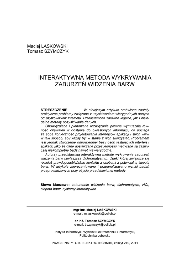 Maciej LASKOWSKI Tomasz SZYMCZYK INTERAKTYWNA METODA WYKRYWANIA ZABURZEŃ WIDZENIA BARW STRESZCZENIE W niniejszym artykule omówione zostały praktyczne problemy związane z uzyskiwaniem wiarygodnych danych od użytkowników Internetu. Przedstawiono zarówno legalne, jak i nielegalne metody pozyskiwania danych. Obowiązujące i planowane rozwiązania prawne wymuszają równość obywateli w dostępie do określonych informacji, co pociąga za sobą konieczność projektowania interfejsów aplikacji i stron www w taki sposób, aby każdy był w stanie z nich skorzystać. Problemem jest jednak stworzenie odpowiedniej bazy osób testujących interfejsy aplikacji, jako że dane dostarczane przez jednostki medyczne są zazwyczaj niekompletne bądź nawet niewiarygodne. Autorzy przedstawiają interaktywną metodę wykrywania zaburzeń widzenia barw (zwłaszcza dichromatyzmu), dzięki której zwiększa się również prawdopodobieństwo kontaktu z osobami z potencjalną ślepotą barw. W artykule zaprezentowano i przeanalizowano wyniki badań przeprowadzonych przy użyciu przedstawionej metody. Słowa kluczowe: zaburzenie widzenia barw, dichromatyzm, HCI, ślepota barw, systemy interaktywne mgr inż. Maciej LASKOWSKI e-mail: [email protected] dr inż. Tomasz SZYMCZYK e-mail: [email protected] Instytut Informatyki, Wydział Elektrotechniki i Informatyki, Politechnika Lubelska PRACE INSTYTUTU ELEKTROTECHNIKI, zeszyt 249, 2011 130 M. Laskowski, T. Szymczyk 1. WSTĘP Ślepota barw jest bardzo specyficzną dysfunkcją ludzkiego organizmu. W większości przypadków [7, 14] osoba osiadające zaburzenie widzenia barw może prowadzić normalne życie, jako że zakłócone jest tylko postrzeganie barw, nie zaś sam wzrok. Co więcej, wiele osób nie jest świadomych swojej wady – standartowo testy dotyczące poprawnego rozpoznawania barw przeprowadzane są tylko w kilku przypadkach – jako część badań wykonywanych przed pójściem do przedszkola lub szkoły podstawowej czy na kursie prawa jazdy [10]. Jednak nawet wtedy istnieje prawdopodobieństwo, że ślepota barw zostanie niewykryta ze względu na niedokładnie bądź nieprawidłowo wykonane badanie. Ślepota barw jest nieuleczalna, choć określone typy barwnych filtrów i szkieł kontaktowych mogą wspomóc proces rozróżniania barw (jednak ich zastosowanie praktyczne jest znikome [10]). Z tego powodu wiele instytucji medycznych nie prowadzi spisów osób z zaburzeniem widzenia barw [9]. Należy zaznaczyć, że ślepota barw nie ma negatywnego wpływu na codzienne życie dotkniętej nią osoby. Nie zmienia to jednak faktu, że uniemożliwiać wykonywanie pewnych czynności bądź mieć negatywny wpływ na interpretowanie i rozumienie sygnałów wizualnych opartych o kolory. 2. ŚLEPOTA BARW 2.1. Typy i powody zaburzeń widzenia barw Wyróżniane są trzy podstawowe typy zaburzeń widzenia barw: • monochromatyzm - określany też jako całkowita ślepota barw [12], • dichromatyzm - zaburzenie rozpoznawania barw związane z całkowitym brakiem jednego z trzech rodzajów czopków w siatkówce oka [5]. Wyróżniane są trzy typy dichromatyzmu: protanopia – jest to forma zaburzeń widzenia barw czerwonej i zielonej, spowodowana przez całkowity brak czerwonych fotoreceptorów w siatkówce oka [5]. Osoby z protanopią mogą mylić czerwienie z odcieniami czerni lub ciemnych szarości, zaś nie są w stanie odróżnić odcieni fioletu, lawendy i purpury od różnych odcieni niebieskiego Interaktywna metoda wykrywania zaburzeń widzenia barw 131 ze względu na obniżenie jaskrawości czerwonej składowej tych kolorów [5], deuteranopia – jest to forma zaburzeń widzenia barw zielonej i czerwonej, spowodowana przez całkowity brak zielonych fotoreceptorów w siatkówce oka [5]. Osoby z deuteranopią mają podobne problemy z rozróżnianiem odcieni barw jak osoby z protanopią, jednak bez anormalnego obniżenia poziomu jasności, tritanopia – jest to forma zaburzeń widzenia barw żółtej i niebieskiej, spowodowana przez całkowity brak niebieskich fotoreceptorów [5]. Jest to najrzadsza forma dichromatyzmu [7], • nieprawidłowy trichromatyzm – obniżenie percepcji nasycenia (w niektórych przypadkach także jaskrawości) jednej z barw (czerwonej, zielonej bądź niebieskiej) [5]. Ślepota barw jest zazwyczaj dziedziczna i dotyka głównie mężczyzn (za wyjątkiem tritanopii, która dotyka w zbliżonym stopniu obydwie płcie) [7], jednak może być także spowodowana przez uraz [9], niektóre choroby (np. cukrzycę [10]) lub niektóre substancje chemiczne (np. niektóre narkotyki [10]). W oparciu o dostępne dane [13, 11, 7] autorzy oszacowali, że około 9.3% mężczyzn i 0,5% kobiet (w sumie około 5% całej populacji) posiada zaburzenia widzenia barw. 2.2. Ekonomiczne i prawne aspekty zaburzeń widzenia barw Ślepota barw może uniemożliwiać pracę w niektórych zawodach, zwłaszcza gdy prawidłowe postrzeganie barw jest powiązane z bezpieczeństwem pracy (np. w przypadku pilota lub zawodowego kierowcy) bądź jest istotne z punktu widzenia samej pracy (np. w przypadku malarza lub projektanta). Niekiedy jest to narzucane przez prawo – np. prawodawstwo niektórych krajów nie pozwala osobom z zaburzeniem widzenia barw starać się o prawo jazdy lub licencję pilota [10]. W literaturze [np. 14, 10] przyjmuje się, że ograniczenia te wynikają z XIX-wiecznej katastrofy kolejowej w Szwecji, która została spowodowana przez inżyniera posiadającego zaburzenie widzenia barw. Osoba prowadząca pojazd powinna być w stanie rozpoznać (i rozróżnić) sygnały oparte o barwy, takie jak światła drogowe bądź ostrzegawcze [7]. Analizując problematykę osób z zaburzeniami widzenia barw należy wziąć po uwagę także aspekty związane z dostępem tych osób do usług i informacji (np. opublikowanych w Internecie) z powodów zarówno prawnych, jak i ekonomicznych. 132 M. Laskowski, T. Szymczyk Prawodawstwo wielu krajów świata gw