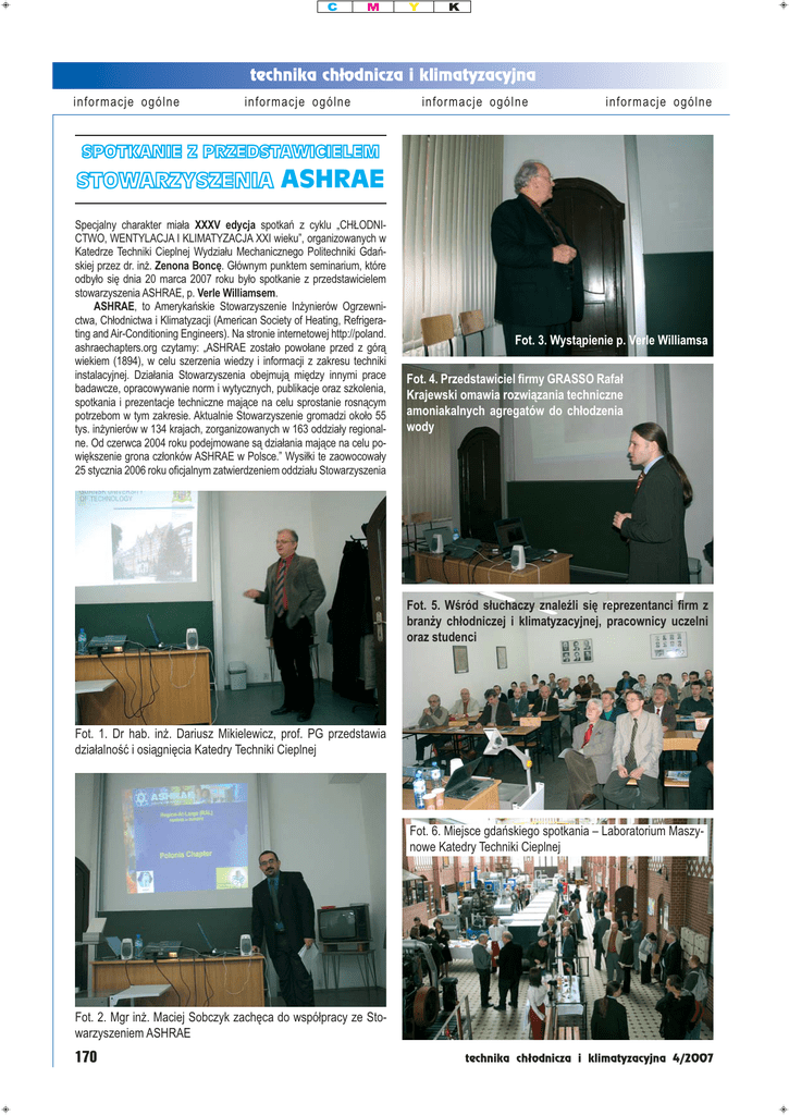 informacje ogólne informacje ogólne informacje ogólne informacje ogólne SPOTKANIE Z PRZEDSTAWICIELEM STOWARZYSZENIA ASHRAE Specjalny charakter miała XXXV edycja spotkań z cyklu „CHŁODNICTWO, WENTYLACJA I KLIMATYZACJA XXI wieku”, organizowanych w Katedrze Techniki Cieplnej Wydziału Mechanicznego Politechniki Gdańskiej przez dr. inż. Zenona Boncę. Głównym punktem seminarium, które odbyło się dnia 20 marca 2007 roku było spotkanie z przedstawicielem stowarzyszenia ASHRAE, p. Verle Williamsem. ASHRAE, to Amerykańskie Stowarzyszenie Inżynierów Ogrzewnictwa, Chłodnictwa i Klimatyzacji (American Society of Heating, Refrigerating and Air-Conditioning Engineers). Na stronie internetowej http://poland. ashraechapters.org czytamy: „ASHRAE zostało powołane przed z górą wiekiem (1894), w celu szerzenia wiedzy i informacji z zakresu techniki instalacyjnej. Działania Stowarzyszenia obejmują między innymi prace badawcze, opracowywanie norm i wytycznych, publikacje oraz szkolenia, spotkania i prezentacje techniczne mające na celu sprostanie rosnącym potrzebom w tym zakresie. Aktualnie Stowarzyszenie gromadzi około 55 tys. inżynierów w 134 krajach, zorganizowanych w 163 oddziały regionalne. Od czerwca 2004 roku podejmowane są działania mające na celu powiększenie grona członków ASHRAE w Polsce.” Wysiłki te zaowocowały 25 stycznia 2006 roku oficjalnym zatwierdzeniem oddziału Stowarzyszenia Fot. 3. Wystąpienie p. Verle Williamsa Fot. 4. Przedstawiciel firmy GRASSO Rafał Krajewski omawia rozwiązania techniczne amoniakalnych agregatów do chłodzenia wody Fot. 5. Wśród słuchaczy znaleźli się reprezentanci firm z branży chłodniczej i klimatyzacyjnej, pracownicy uczelni oraz studenci Fot. 1. Dr hab. inż. Dariusz Mikielewicz, prof. PG przedstawia działalność i osiągnięcia Katedry Techniki Cieplnej Fot. 6. Miejsce gdańskiego spotkania – Laboratorium Maszynowe Katedry Techniki Cieplnej Fot. 2. Mgr inż. Maciej Sobczyk zachęca do współpracy ze Stowarzyszeniem ASHRAE 170 technika chłodnicza i klimatyzacyjna 4/2007 informacje ogólne informacje ogólne informacje ogólne informacje ogólne Fot. 7. Kierownik Katedry Techniki Cieplnej, prof. dr hab. inż. Jan Stąsiek Fot. 10. Sponsor spotkania – firma GRASSO zadbała o regenerację sił jego uczestników Fot. 8. Verle Williams, pomimo bariery językowej, nie narzekał na brak rozmówców Fot. 11. Organizator seminarium, dr inż. Zenon Bonca w rozmowie z Arkadiuszem Orackim (Danfoss) Fot. 9. Rozmowy kuluarowe w scenerii Laboratorium Maszynowego Fot. 12. Dla studentów specjalności chłodniczej i klimatyzacyjnej seminarium było cennym urozmaiceniem zajęć na uczelni w Polsce „POLONIA CHAPTER”. Program gdańskiego spotkania obejmował: - prezentację obszarów działalności naukowo-dydaktycznej Katedry Techniki Cieplnej przedstawioną przez prof. Dariusza Mikielewicza; - omówienie przez mgr. inż. Macieja Sobczyka struktury i działalności Stowarzyszenia ASHRAE i ASHRAE Polonia; - prelekcję p. Verle Williamsa na temat optymalizacji wydajności agregatów chłodniczych i zużycia energii elektrycznej poprzez prawidłowe technika chłodnicza i klimatyzacyjna 4/2007 sterowanie oraz efektywny system pompowy; wystąpienie inż. Rafała Krajewskiego na temat „Chillery amoniakalne firmy GRASSO: budowa + działanie + zastosowanie”; - dyskusję o możliwościach i perspektywach współpracy ze Stowarzyszeniem ASHRAE. Sponsorem seminarium oraz towarzyszącego mu poczęstunku była firma GRASSO. Prezentujemy kilka migawek z tego interesującego spotkania. - 171