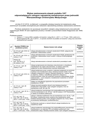 Wykaz zastosowania stawek podatku VAT odpowiadających usługom najczęściej świadczonym przez jednostki Warszawskiego Uniwersytetu Medycznego Uwaga: od dnia 01.01.2014r. na fakturach w przypadku dostawy towarów lub świadczenia usług zwolnionych od podatku obowiązkowe jest wskazanie odpowiedniej podstawy zastosowania zwolnienia. PoniŜsze zestawienie nie wyczerpuje wszystkich rodzajów usług świadczonych przez jednostki organizacyjne WUM. W razie wątpliwości prosimy o kontakt z pracownikami Działu Księgowości (tel. 8408, 8458). Podstawa prawna: ⇒ Ustawa z 11 marca 2004 o podatku od towarów i usług (Dz.U. z 2011 r. nr 177,poz. 1054 z późn.zm.); ⇒ Rozporządzenie MF z 20.12.2013 r., w sprawie zwolnień od podatku od towarów i usług oraz warunków stosowania tych zwolnień Stawka podatku VAT LP Symbol PKWiU lub podstawa prawa 1 art. 43 ust.1 pkt. 30 lit. b) ustawy o VAT Usługi zakwaterowania w domach studenckich WUM, wyłącznie dla studentów i doktorantów uczelni, zwolnione 2 art. 43 ust.1 pkt. 30 lit. c) ustawy o VAT Usługi zakwaterowania w domach studenckich WUM, świadczone dla studentów i doktorantów innych uczelni, z którymi WUM podpisała umowy zwolnione 3 PKWiU 55 poz. 163 Zał. nr 3 do ustawy o VAT Usługi zakwaterowania w domach studenckich pozostałych osób 8% 4 art. 43 ust. 1 pkt. 36 ustawy o VAT Usługi wynajmowania lub dzierŜawy nieruchomości o charakterze mieszkalnym lub części nieruchomości, na własny rachunek, wyłącznie na cele mieszkaniowe (czynsze lokatorskie) zwolnione art. 43 ust.1 pkt. 26 lit. b) ustawy o VAT Usługi świadczone przez uczelnie w zakresie kształcenia na poziomie wyŜszym oraz świadczenie usług i dostawę towarów ściśle z tymi usługami związane (tj. usługi w zakresie edukacji np.: czesne, opłaty za dyplomy, indeksy, nostryfikacje dyplomów związana z kontynuowaniem nauki lub otwarciem przewodu doktorskiego (studia doktoranckie), i inne związane z kształceniem studentów w ramach działalności uczelni zwolnione 5 Nazwa towaru lub usługi Opłaty za nostryfikacje dyplomów nie poprzedzone procesem kształcenia w WUM 6 23% 7 art. 43 ust. 1 pkt. 28 ustawy o VAT Usługi nauczania języków obcych oraz dostawę towarów i świadczenie usług ściśle z tymi usługami związane, inne niŜ wymienione w pkt. 26 i pkt. 29 zwolnione 8 art. 43 ust. 1 pkt. 29 lit. c ustawy o VAT Usługi kształcenia zawodowego lub przekwalifikowania zawodowego, inne niŜ wymienione w art. 43 ust. 1 pkt 26 ustawy o VAT finansowane w całości ze środków publicznych zwolnione 9 § 3. ust.1 pkt. 13 rozp. MF z 20.12.2013r. (Dz.U. z 2013 poz. 1722) Usługi w zakresie kształcenia inne niŜ wymienione w art. 43 ust. 1 pkt. 26 ustawy, świadczone przez uczelnie oraz świadczenie usług i dostawa towarów ściśle z tymi usługami związane (np. kursy, opłaty za przewody habilitacyjne i profesorskie itp.) zwolnione 10 § 3. ust.1 pkt. 13 rozp. MF z 20.12.2013r. (Dz.U. z 2013 poz. 1722) Konferencje naukowe w ramach których usługa kształcenia ma zasadniczy udział zwolnione 11 § 3. ust.1 pkt. 14 rozp. MF z 20.12.2013r. (Dz.U. z 2013 poz. 1722) Usługi kształcenia zawodowego lub przekwalifikowania zawodowego, finansowane w co najmniej 70% ze środków publicznych oraz świadczenie usług i dostawę towarów ściśle z tymi usługami związane zwolnione 12 § 3. ust.1 pkt. 13 rozp. MF z 20.12.2013r. (Dz.U. z 2013 poz. 1722) Kurs przygotowawczy do matury i na studia 13 § 3. ust. 1 pkt. 18 w związku z art. 8 i 9 rozp. MF z 20.12.2013r.. (Dz.U. z 2013 poz. 1722) Usługi w zakresie opieki medycznej słuŜące profilaktyce, zachowaniu, ratowaniu, przywracaniu i poprawie zdrowia oraz świadczenie usług i dostawa towarów ściśle z tymi usługami związane (np. badania immunohistochemiczne, inne procedury np. wysokospecjalistyczne badania medyczne, usługi świadczone przez laboratoria np. Zakład Medycyny Sądowej tylko i wyłącznie w powołanym zakresie) zwolnione Usługi świadczone przez laboratoria (usługi świadczone przez Katedrę i Zakład Medycyny Sądowej w zakresie diagnostyki osób zmarłych i Ŝywych wykonywane na zlecenie sądów, prokuratur i policji, badania genetyczne w celu ustalenia ojcostwa oraz ekspertyzy i opinie sądowo-lekarskie) *) 23% 8% 14 zwolnione 15 PKWiU 96.03 poz. 180 Zał. nr 3 do ustawy o VAT Usługi pogrzebowe i pokrewne, wraz z dostawą trumien, urn i utensyliów pogrzebowych dostarczanych wraz z trumną lub urną (np. przechowywanie zwłok w chłodni) 16 art. 43 ust.1 pkt. 33 lit. a ustawy o VAT Usługi kulturalne świadczone przez podmioty prawa publicznego biblioteki (wyłącznie w zakresie usług świadczonych z wykorzystaniem zasobów bibliotecznych świadczone na rzecz studentów WUM) – z wyłączeniem biletów wstępu oraz wypoŜyczania wydawnictw zwolnione 17 art. 43 ust.1 pkt. 33 lit. a) ustawy o VAT Usługi kulturalne świadczone przez podmioty prawa publicznego (…)(z wyłączeniem biletów wstępu)– np. występ chóru zwolnione Usługi świadczone przez bibliotekę (kserowanie, skanowanie, wydruki, nagranie na płytę) z wykorzystaniem materiałów niebędących w zasobach bibliotecznych 18 23% 19 art. 43 ust. 1 pkt. 2 ustawy o VAT SprzedaŜ uŜywanych środków trwałych i uŜywanego majątku obrotowego **) 20 PKWiU 36.00.30.0 poz. 141 Zał. nr 3 do ustawy o VAT Usługi związane z handlem wodą dostarczaną za pośrednictwem sieci wodociągowych ***) 8% 21 PKWiU 37 poz. 142 Zał. nr 3 do ustawy o VAT Usługi związane z odprowadzaniem i oczyszczaniem ścieków ***) 8% 22 PKWiU 38.21.2 poz. 149 Zał. nr 3 do ustawy o VAT Usługi związane z usuwaniem odpadów innych niŜ niebezpieczne ***) 8% 23 PKWiU 81.29.12 81.29.13 Poz. 174-175 Zał. nr 3 do ustawy o VAT Usługi zamiatania śmieci i usuwania śniegu ***) Pozostałe usługi sanitarne ***) 8% 24 art. 43 ust. 1 pkt. 38 ustawy o VAT Usługi udzielania kredytów lub poŜyczek pienięŜnych 25 PKWiU 58.11.1 poz. 32 i 33 Zał. nr 10 do 