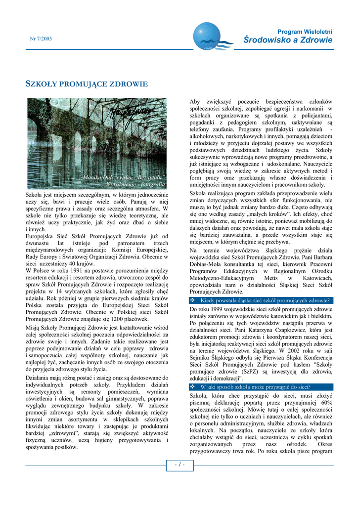 Program Wieloletni Środowisko a Zdrowie Nr 7/2005 SZKOŁY PROMUJĄCE ZDROWIE Aby zwiększyć poczucie bezpieczeństwa członków społeczności szkolnej, zapobiegać agresji i narkomanii w szkołach organizowane są spotkania z policjantami, pogadanki z pedagogiem szkolnym, uaktywniane są telefony zaufania. Programy profilaktyki uzależnień alkoholowych, narkotykowych i innych, pomagają dzieciom i młodzieży w przyjęciu dojrzałej postawy we wszystkich podstawowych dziedzinach ludzkiego życia. Szkoły sukcesywnie wprowadzają nowe programy prozdrowotne, a już istniejące są wzbogacane i udoskonalane. Nauczyciele pogłębiają swoją wiedzę w zakresie aktywnych metod i form pracy oraz przekazują własne doświadczenia i umiejętności innym nauczycielom i pracownikom szkoły. Szkoła realizująca program zakłada przeprowadzenie wielu zmian dotyczących wszystkich sfer funkcjonowania, nie muszą to być jednak zmiany bardzo duże. Często odbywają się one według zasady „małych kroków”. Ich efekty, choć mniej widoczne, są równie istotne, ponieważ mobilizują do dalszych działań oraz powodują, że nawet mała szkoła staje się bardziej zauważalna, a przede wszystkim staje się miejscem, w którym chętnie się przebywa. Na terenie województwa śląskiego prężnie działa wojewódzka sieć Szkół Promujących Zdrowie. Pani Barbara Dobias-Mola konsultantka tej sieci, kierownik Pracowni Programów Edukacyjnych w Regionalnym Ośrodku Metodyczno-Edukacyjnym Metis w Katowicach, opowiedziała nam o działalności Śląskiej Sieci Szkół Promujących Zdrowie. Kiedy powstała śląska sieć szkół promujących zdrowie? Do roku 1999 wojewódzkie sieci szkół promujących zdrowie istniały zarówno w województwie katowickim jak i bielskim. Po połączeniu się tych województw nastąpiła przerwa w działalności sieci. Pani Katarzyna Czapkiewicz, która jest edukatorem promocji zdrowia i koordynatorem naszej sieci, była inicjatorką reaktywacji sieci szkół promujących zdrowie na terenie województwa śląskiego. W 2002 roku w sali Sejmiku Śląskiego odbyła się Pierwsza Śląska Konferencja Sieci Szkół Promujących Zdrowie pod hasłem "Szkoły promujące zdrowie (SzPZ) są inwestycją dla zdrowia, edukacji i demokracji". W jaki sposób szkoła może przystąpić do sieci? Szkoła, która chce przystąpić do sieci, musi złożyć pisemną deklarację popartą przez przynajmniej 60% społeczności szkolnej. Mówię tutaj o całej społeczności szkolnej nie tylko o uczniach i nauczycielach, ale również o personelu administracyjnym, służbie zdrowia, władzach lokalnych. Na początku, nauczyciele ze szkoły która chciałaby wstąpić do sieci, uczestniczą w cyklu spotkań zorganizowanych przez nasz ośrodek. Okres przygotowawczy trwa rok. Po roku szkoła pisze program Monika Dulczewska, „Bez tytułu” Wyróżnienie - fotografia Szkoła jest miejscem szczególnym, w którym jednocześnie uczy się, bawi i pracuje wiele osób. Panują w niej specyficzne prawa i zasady oraz szczególna atmosfera. W szkole nie tylko przekazuje się wiedzę teoretyczną, ale również uczy praktycznie, jak żyć oraz dbać o siebie i innych. Europejska Sieć Szkół Promujących Zdrowie już od dwunastu lat istnieje pod patronatem trzech międzynarodowych organizacji: Komisji Europejskiej, Rady Europy i Światowej Organizacji Zdrowia. Obecnie w sieci uczestniczy 40 krajów. W Polsce w roku 1991 na postawie porozumienia między resortem edukacji i resortem zdrowia, utworzono zespół do spraw Szkół Promujących Zdrowie i rozpoczęto realizację projektu w 14 wybranych szkołach, które zgłosiły chęć udziału. Rok później w grupie pierwszych siedmiu krajów Polska została przyjęta do Europejskiej Sieci Szkół Promujących Zdrowie. Obecnie w Polskiej sieci Szkół Promujących Zdrowie znajduje się 1200 placówek. Misją Szkoły Promującej Zdrowie jest kształtowanie wśród całej społeczności szkolnej poczucia odpowiedzialności za zdrowie swoje i innych. Zadanie takie realizowane jest poprzez podejmowanie działań w celu poprawy zdrowia i samopoczucia całej wspólnoty szkolnej, nauczanie jak najlepiej żyć, zachęcanie innych osób ze swojego otoczenia do przyjęcia zdrowego stylu życia. Działania mają różną postać i zasięg oraz są dostosowane do indywidualnych potrzeb szkoły. Przykładem działań inwestycyjnych są remonty pomieszczeń, wymiana oświetlenia i okien, budowa sal gimnastycznych, poprawa wyglądu zewnętrznego budynku szkoły. W zakresie promocji zdrowego stylu życia szkoły dokonują między innymi zmian asortymentu w sklepikach szkolnych likwidując niektóre towary i zastępując je produktami bardziej „zdrowymi”, starają się zwiększyć aktywność fizyczną uczniów, uczą higieny przygotowywania i spożywania posiłków. -1- Program Wieloletni Środowisko a Zdrowie Nr 7/2005 województwach koordynatorzy w szkołach otrzymują dodatkowe pieniądze na swoje działania. Szkoły należące do śląskiej sieci, mogą skorzystać z szeregu szkoleń odbywających się w naszym ośrodku. Nowe, pilotażowe, szkolenia staramy się w pierwszej kolejności kierować do właśnie takich szkół. Koszt uczestnictwa w takich szkoleniach wynosi około 10 zł. Członkostwo w Sieci Szkół Promujących Zdrowie, może okazać się również pomocne w pozyskiwaniu funduszy z programów europejskich. Co może zachęcić szkołę do przystąpienia do sieci? Dla szkoły zachęcające może być to, że ma okazję zostać zauważona w środowisku lokalnym. O uroczystości wręczeniu certyfikatu powiadamiana jest lokalna prasa, przyjeżdżają przedstawiciele władz lokalnych, kuratorium, wizytatorzy. Jest to szczególnie ważne w dzisiejszych czasach, kiedy ważą się losy niektórych szkół, a intensywne i zauważalne działania szkoły mogą wpłynąć na decyzję władz lokalnych. Czy w śląskiej sieci szkół promujących zdrowie istni