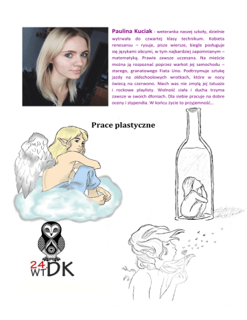Paulina Kuciak - weteranka naszej szkoły, dzielnie wytrwała do czwartej klasy technikum. Kobieta renesansu – rysuje, pisze wiersze, biegle posługuje się językami obcymi, w tym najbardziej zapomnianym – matematyką. Prawie zawsze uczesana. Na mieście można ją rozpoznać poprzez warkot jej samochodu – starego, granatowego Fiata Uno. Podtrzymuje sztukę jazdy na oldschoolowych wrotkach, które w nocy świecą na czerwono. Niech was nie zmylą jej tatuaże i rockowe playlisty. Wolność ciała i ducha trzyma zawsze w swoich dłoniach. Dla siebie pracuje na dobre oceny i stypendia. W końcu życie to przyjemność… Prace plastyczne Sculpture „Fat stomach, wide hips, double chin, and a round face.” So I am, carving my perfect body in mind. Pale skin, a gap in the thighs, every bone sticking out. That’s all I want. People noticed there is something wrong: „Darling, did you eat today?” „You look so pale.” Why are you bothered? Spine, on which you can count the vertebrae. Chest, flat but wrapped in silky skin. Hip bones, making an invisible bridge from side to side. That’s all I want. I finally feel control, my body starts to change. So I sketch the shape of it on a mirror. Is it all I want? Bags under eyes, clothes way too baggy. You call me skinny. But that’s all your fault. Now I feel like a sculpture. Dead and cold. Misunderstood by the people, who gave me the tools.