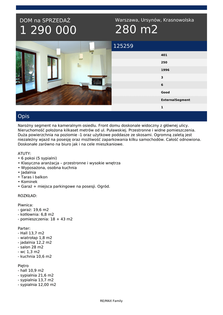DOM na SPRZEDAŻ 1 290 000 Warszawa, Ursynów, Krasnowolska 280 m2 125259 401 250 1996 3 6 Good ExternalSegment 1 Opis Narożny segment na kameralnym osiedlu. Front domu doskonale widoczny z głównej ulicy. Nieruchomość położona kilkaset metrów od ul. Puławskiej. Przestronne i widne pomieszczenia. Duża powierzchnia na poziomie -1 oraz użytkowe poddasze ze skosami. Ogromną zaletą jest niezależny wjazd na posesję oraz możliwość zaparkowania kilku samochodów. Całość odnowiona. Doskonałe zarówno na biuro jak i na cele mieszkaniowe. ATUTY: • 6 pokoi (5 sypialni) • Klasyczna aranżacja – przestronne i wysokie wnętrza • Wyposażona, osobna kuchnia • Jadalnia • Taras i balkon • Kominek • Garaż + miejsca parkingowe na posesji. Ogród. ROZKŁAD: Piwnica: - garaż: 19,6 m2 - kotłownia: 6,8 m2 - pomieszczenia: 18 + 43 m2 Parter: - Hall 13,7 m2 - wiatrołap 1,8 m2 - jadalnia 12,2 m2 - salon 28 m2 - wc 1,3 m2 - kuchnia 10,6 m2 Piętro - hall 10,9 m2 - sypialnia 21,6 m2 - sypialnia 13,7 m2 - sypialnia 12,00 m2 RE/MAX Family - łazienka 6,8 +4,6 m2 Poddasze 30,5 m2 KOSZTY: Cena 1290000 zł Dostępne od zaraz. Serdecznie zapraszam na prezentację Powyższa informacja nie może być uznana za ofertę w rozumieniu art. 66 ust. 1 kodeksu cywilnego lecz stanowi zaproszenie do rokowań w myśl art. 71 kc . RE/MAX Family tel. 22 724 98 28 email: [email protected] RE/MAX Family Powered by TCPDF (www.tcpdf.org)