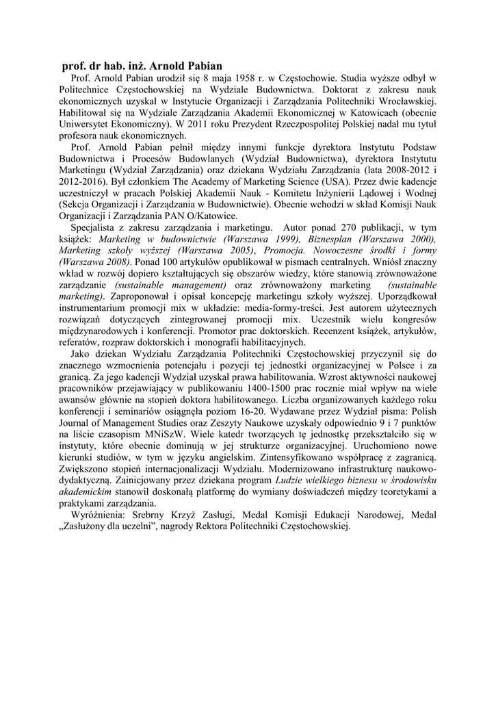 prof. dr hab. inż. Arnold Pabian Prof. Arnold Pabian urodził się 8 maja 1958 r. w Częstochowie. Studia wyższe odbył w Politechnice Częstochowskiej na Wydziale Budownictwa. Doktorat z zakresu nauk ekonomicznych uzyskał w Instytucie Organizacji i Zarządzania Politechniki Wrocławskiej. Habilitował się na Wydziale Zarządzania Akademii Ekonomicznej w Katowicach (obecnie Uniwersytet Ekonomiczny). W 2011 roku Prezydent Rzeczpospolitej Polskiej nadał mu tytuł profesora nauk ekonomicznych. Prof. Arnold Pabian pełnił między innymi funkcje dyrektora Instytutu Podstaw Budownictwa i Procesów Budowlanych (Wydział Budownictwa), dyrektora Instytutu Marketingu (Wydział Zarządzania) oraz dziekana Wydziału Zarządzania (lata 2008-2012 i 2012-2016). Był członkiem The Academy of Marketing Science (USA). Przez dwie kadencje uczestniczył w pracach Polskiej Akademii Nauk - Komitetu Inżynierii Lądowej i Wodnej (Sekcja Organizacji i Zarządzania w Budownictwie). Obecnie wchodzi w skład Komisji Nauk Organizacji i Zarządzania PAN O/Katowice. Specjalista z zakresu zarządzania i marketingu. Autor ponad 270 publikacji, w tym książek: Marketing w budownictwie (Warszawa 1999), Biznesplan (Warszawa 2000), Marketing szkoły wyższej (Warszawa 2005), Promocja. Nowoczesne środki i formy (Warszawa 2008). Ponad 100 artykułów opublikował w pismach centralnych. Wniósł znaczny wkład w rozwój dopiero kształtujących się obszarów wiedzy, które stanowią zrównoważone zarządzanie (sustainable management) oraz zrównoważony marketing (sustainable marketing). Zaproponował i opisał koncepcję marketingu szkoły wyższej. Uporządkował instrumentarium promocji mix w układzie: media-formy-treści. Jest autorem użytecznych rozwiązań dotyczących zintegrowanej promocji mix. Uczestnik wielu kongresów międzynarodowych i konferencji. Promotor prac doktorskich. Recenzent książek, artykułów, referatów, rozpraw doktorskich i monografii habilitacyjnych. Jako dziekan Wydziału Zarządzania Politechniki Częstochowskiej przyczynił się do znacznego wzmocnienia potencjału i pozycji tej jednostki organizacyjnej w Polsce i za granicą. Za jego kadencji Wydział uzyskał prawa habilitowania. Wzrost aktywności naukowej pracowników przejawiający w publikowaniu 1400-1500 prac rocznie miał wpływ na wiele awansów głównie na stopień doktora habilitowanego. Liczba organizowanych każdego roku konferencji i seminariów osiągnęła poziom 16-20. Wydawane przez Wydział pisma: Polish Journal of Management Studies oraz Zeszyty Naukowe uzyskały odpowiednio 9 i 7 punktów na liście czasopism MNiSzW. Wiele katedr tworzących tę jednostkę przekształciło się w instytuty, które obecnie dominują w jej strukturze organizacyjnej. Uruchomiono nowe kierunki studiów, w tym w języku angielskim. Zintensyfikowano współpracę z zagranicą. Zwiększono stopień internacjonalizacji Wydziału. Modernizowano infrastrukturę naukowodydaktyczną. Zainicjowany przez dziekana program Ludzie wielkiego biznesu w środowisku akademickim stanowił doskonałą platformę do wymiany doświadczeń między teoretykami a praktykami zarządzania. Wyróżnienia: Srebrny Krzyż Zasługi, Medal Komisji Edukacji Narodowej, Medal „Zasłużony dla uczelni”, nagrody Rektora Politechniki Częstochowskiej.