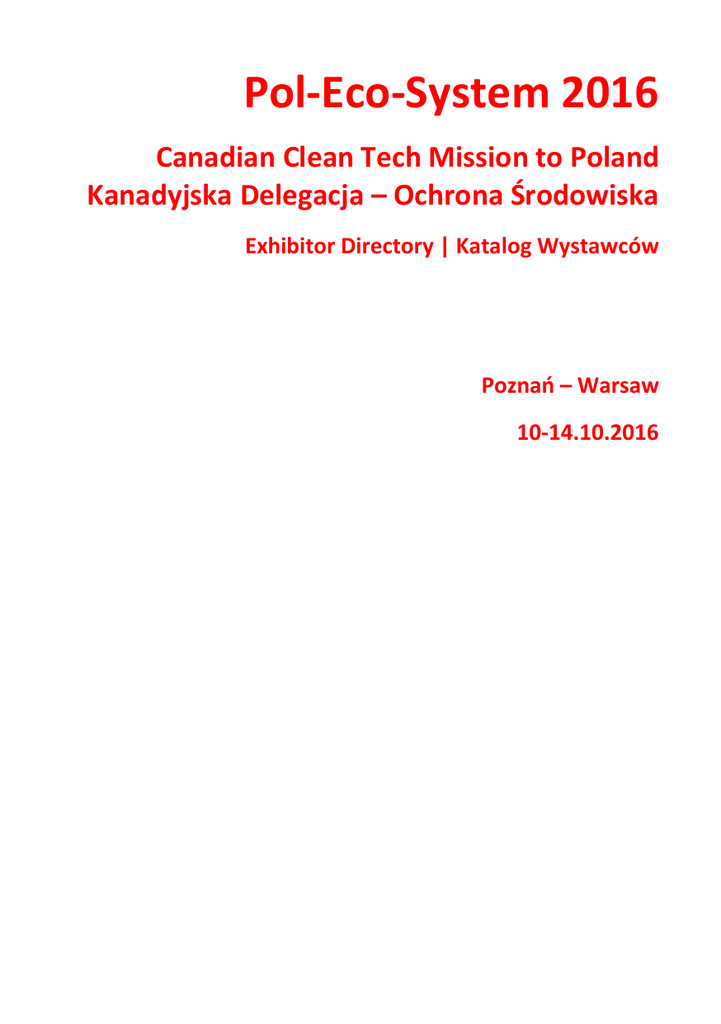 Pol-Eco-System 2016 Canadian Clean Tech Mission to Poland Kanadyjska Delegacja – Ochrona Środowiska Exhibitor Directory | Katalog Wystawców Poznań – Warsaw 10-14.10.2016 CANADA’S SUSTAINABLE TECHNOLOGY CAPABILITIES Canada is a world leader in the development and deployment of cost-effective environmental products and services. From environmental assessments to commercial technologies for water and wastewater treatment; air quality control; solid waste management; hydroelectric power; wind, solar and ocean energies; bioenergy and hydrogen and fuel-cells, Canada continues to lead the way in the sustainable technology sector. Environmental Industries Canadian firms have developed cutting-edge expertise in various areas of water and wastewater treatment, air quality control and solid waste management. Canadian firms are able to provide a wide range of solutions for water and wastewater treatment, with strong capabilities in ultraviolet disinfection, membrane filtration, biosolid recovery and sludge-to-energy conversion. Canada is also a world leader in solid waste management, with expertise in wasteto-energy and recycling. Canadian municipalities and industry leaders have made the concept of reduce, reuse and recycle a cornerstone of Canada’s sustainability plans, generating increased levels of adoption worldwide. Renewable Energy With more biomass resource per capita than any other nation, Canada is at the forefront of the bioenergy industry with expertise in combustion, pyrolysis, gasification, anaerobic digestion, landfill biogas utilization, fermentation and catalytic hydrotreating of biomass oils. Canada is also globally recognized as a leader in the hydrogen and fuel cell industry, where Canadian firms are leaders in proton exchange membrane (PEM) fuel cells, hydrogen production, solid oxide and hydrogen storage, hydrogen distribution, hydrogen safety codes and standards, hydrogen internal combustion and fuelling infrastructure. Canada is a pioneer in hydrogen and fuel cell research, development and demonstration, which includes the largest fleet of fuel cell buses and hydrogen fuelling stations in the world. In solar and wind energy, Canadian firms offer a variety of novel technologies, products and services, ranging from the design and development of solar and wind systems to the overall production and deployment of solar and wind technologies that are able to withstand harsh climates and off-grid applications. Research and Development Through the continuous efforts of Canada’s R&D community, Canadian firms are actively involved in the development and deployment of cutting-edge technologies for many sub-sectors of the sustainable technology sector. For more information on Canadian capabilities, please visit us at Pol-Eco-System Hall 5, stand 2. EKO-TECHNOLOGIE Z KRAJU KLONOWEGO LIŚCIA Kanada jest światowym liderem w rozwoju i wdrażaniu innowacyjnych rozwiązań w wielu sektorach ochrony środowiska: od ocen środowiskowych po technologie oczyszczania wody i ścieków, kontroli jakości powietrza, gospodarki odpadami, energii wodnej, energetyki wiatrowej, solarnej i oceanicznej, bioenergii i ogniw paliwowych. Ochrona środowiska Firmy kanadyjskie są w stanie zapewnić szeroką gamę rozwiązań do oczyszczania wody i ścieków, kontroli jakości powietrza oraz gospodarki odpadami. W zakresie oczyszczania wody i ścieków, kanadyjskie firmy prezentują rozwiązania z zakresu dezynfekcji wody promieniami UV, filtracji membranowej oraz odzysku biologicznych odpadów stałych i przetwarzania osadów pościekowych na energię. Kanada jest również światowym liderem w dziedzinie gospodarki odpadami z doświadczeniem w przetwarzaniu odpadów na energię i recyklingu. Kanadyjskie miasta, we współpracy z wiodącymi firmami, wdrażają zasady minimalizacji wytwarzanych odpadów i recyklingu, które stały się podstawą planów zrównoważonego rozwoju coraz częściej stosowanych na światową skalę. Energia odnawialna Kanada posiada najwięcej zasobów biomasy per capita na świecie, dzięki czemu jest w czołówce branży bioenergii z doświadczeniem w m.in. spalaniu, pirolizie, gazyfikacji, fermentacji beztlenowej i wykorzystywaniu biogazu ze składowisk odpadów. Kanada jest światowym liderem w zakresie ogniw paliwowych PEM, produkcji wodoru, magazynowania wodoru i tlenku stałego, transportu wodoru, standardów bezpieczeństwa, stworzenia infrastruktury dla silników spalinowych zasilanych wodorem oraz stacji uzupełniania paliwa wodorowego. Kanada jest pionierem w dziedzinie wodoru i ogniw paliwowych prowadząc badania, rozwój i demonstracje, i dysponuje największą na świecie flotą autobusów na ogniwa wodorowe wraz z siecią stacji uzupełniania paliwa. W dziedzinie energetyki solarnej i wiatrowej, firmy kanadyjskie oferują szeroką gamę nowoczesnych technologii, produktów i usług – od projektowania i rozwoju systemów solarnych i wiatrowych po produkcję oraz wdrażanie technologii solarnych oraz wiatrowych przystosowanych do skrajnych warunków klimatycznych oraz instalacji pozasieciowych Badania & Rozwój Dzięki stałym wysiłkom nad badaniami i rozwojem, firmy kanadyjskie są aktywnie zaangażowane w rozwój oraz wdrażanie najnowszych technologii w licznych pod-sektorach branży czystych technologii. Zapraszamy na stoisko kanadyjskie podczas targów Pol-Eco-System – Hala 5, stoisko 2. Ms. Ewa Cichocka Trade Commissioner Embassy of Canada to Poland Tel.: +48 22 584 3360 [email protected] www.tradecommissioner.gc.ca Kanada jest światowym liderem w rozwoju i wdrażaniu ekonomicznych kosztowo rozwiązań w zakresie czystych technologii, np. oceny oddziaływania na środowisko; oczyszczanie wody i ścieków; kontrola jakości powietrza; gospodarka odpadami; energie odnawialne; bioenergie; ogniwa paliwowe. Wspieramy polskie firmy w kwestiach inwestycyjnych i handlowych; pomagamy w znalezieniu dostawców towarów i usług z Kanady oraz w rozwoju innow