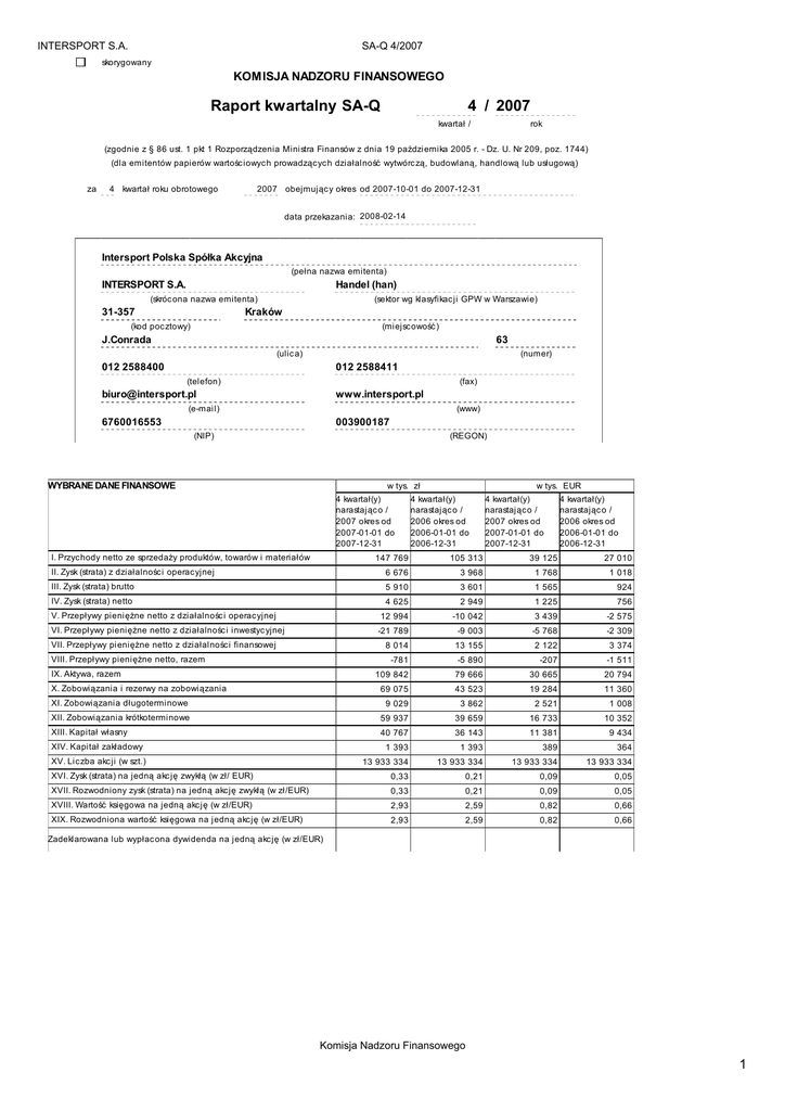 INTERSPORT S.A. SA-Q 4/2007 skorygowany KOMISJA NADZORU FINANSOWEGO Raport kwartalny SA-Q 4 / 2007 kwartał / rok (zgodnie z § 86 ust. 1 pkt 1 Rozporządzenia Ministra Finansów z dnia 19 października 2005 r. - Dz. U. Nr 209, poz. 1744) (dla emitentów papierów wartośc iowyc h prowadząc yc h działalność wytwórc zą, budowlaną, handlową lub usługową) za 2007 obejmując y okres od 2007-10-01 do 2007-12-31 4 kwartał roku obrotowego data przekazania: 2008-02-14 Intersport Polska Spółka Akcyjna (pełna nazwa emitenta) INTERSPORT S.A. Handel (han) (skróc ona nazwa emitenta) 31-357 (sektor wg klasyfikac ji GPW w Warszawie) Kraków (kod poc ztowy) (miejsc owość ) J.Conrada 63 (ulic a) (numer) 012 2588400 012 2588411 (telefon) (fax) [email protected] www.intersport.pl (e-mail) (www) 6760016553 003900187 (NIP) (REGON) WYBRANE DANE FINANSOWE w tys. zł 4 kwartał(y) narastając o / 2007 okres od 2007-01-01 do 2007-12-31 I. Przyc hody netto ze sprzedaży produktów, towarów i materiałów w tys. EUR 4 kwartał(y) narastając o / 2006 okres od 2006-01-01 do 2006-12-31 4 kwartał(y) narastając o / 2007 okres od 2007-01-01 do 2007-12-31 4 kwartał(y) narastając o / 2006 okres od 2006-01-01 do 2006-12-31 147 769 105 313 39 125 27 010 II. Zysk (strata) z działalnośc i operac yjnej 6 676 3 968 1 768 1 018 III. Zysk (strata) brutto 5 910 3 601 1 565 924 IV. Zysk (strata) netto 4 625 2 949 1 225 756 V. Przepływy pieniężne netto z działalnośc i operac yjnej 12 994 -10 042 3 439 -2 575 VI. Przepływy pieniężne netto z działalnośc i inwestyc yjnej -21 789 -9 003 -5 768 -2 309 8 014 13 155 2 122 3 374 -781 -5 890 -207 -1 511 109 842 79 666 30 665 20 794 69 075 43 523 19 284 11 360 XI. Zobowiązania długoterminowe 9 029 3 862 2 521 1 008 XII. Zobowiązania krótkoterminowe 59 937 39 659 16 733 10 352 XIII. Kapitał własny 40 767 36 143 11 381 9 434 1 393 1 393 389 364 13 933 334 13 933 334 13 933 334 13 933 334 XVI. Zysk (strata) na jedną akc ję zwykłą (w zł/ EUR) 0,33 0,21 0,09 0,05 XVII. Rozwodniony zysk (strata) na jedną akc ję zwykłą (w zł/EUR) 0,33 0,21 0,09 0,05 XVIII. Wartość księgowa na jedną akc ję (w zł/EUR) 2,93 2,59 0,82 0,66 XIX. Rozwodniona wartość księgowa na jedną akc ję (w zł/EUR) 2,93 2,59 0,82 0,66 VII. Przepływy pieniężne netto z działalnośc i finansowej VIII. Przepływy pieniężne netto, razem IX. Aktywa, razem X. Zobowiązania i rezerwy na zobowiązania XIV. Kapitał zakładowy XV. Lic zba akc ji (w szt.) Zadeklarowana lub wypłac ona dywidenda na jedną akc ję (w zł/EUR) Komisja Nadzoru Finansowego 1 INTERSPORT S.A. SA-Q 4/2007 BILANS w tys. zł stan na stan na 2007-12-31 2007-09-30 koniec kwartału / koniec poprz. 2007 kwartału / 2007 stan na stan na 2006-12-31 2006-12-31 koniec poprz. roku koniec kwartału / / 2006 2006 AKTYWA I. Aktywa trwałe 1. Wartośc i niematerialne i prawne, w tym: 2. Rzec zowe aktywa trwałe 3. Inwestyc je długoterminowe 39 048 30 666 497 388 19 672 413 38 014 29 728 18 717 319 345 339 3.1. Długoterminowe aktywa finansowe 319 345 339 a) w pozostałyc h jednostkac h 319 345 339 218 205 203 4. Długoterminowe rozlic zenia międzyokresowe 4.1. Aktywa z tytułu odroc zonego podatku doc hodowego 218 203 II. Aktywa obrotowe 70 794 54 729 59 994 1. Zapasy 64 703 50 043 51 087 5 263 3 896 7 224 112 264 196 5 151 3 632 7 028 2. Należnośc i krótkoterminowe 2.1. Od jednostek powiązanyc h 2.2. Od pozostałyc h jednostek 3. Inwestyc je krótkoterminowe 578 715 1 359 3.1. Krótkoterminowe aktywa finansowe 578 715 1 359 a) środki pieniężne i inne aktywa pieniężne 578 715 1 359 250 75 324 109 842 85 395 79 666 36 143 4. Krótkoterminowe rozlic zenia międzyokresowe A kt y w a r a z e m PASYWA I. Kapitał własny 40 767 35 848 1. Kapitał zakładowy 1 393 1 393 1 393 2. Kapitał zapasowy 34 749 34 749 31 801 3. Zysk (strata) netto II. Zobowiązania i rezerwy na zobowiązania 1. Zobowiązania długoterminowe 1.1. Wobec pozostałyc h jednostek 2. Zobowiązania krótkoterminowe 2.1. Wobec pozostałyc h jednostek 2.2. Fundusze spec jalne 3. Rozlic zenia międzyokresowe 4 625 -294 2 949 69 075 49 547 43 523 9 029 5 645 3 862 9 029 5 645 3 862 59 937 43 902 39 659 59 917 43 866 39 651 20 36 8 109 2 3.1. Inne rozlic zenia międzyokresowe 109 2 a) długoterminowe 109 b) krótkoterminowe P a sy w a r a z e m Wartość księgowa Lic zba akc ji (w szt.) Wartość księgowa na jedną akc ję (w zł) Rozwodniona lic zba akc ji (w szt.) Rozwodniona wartość księgowa na jedną akc ję (w zł) 2 109 842 85 395 79 666 40 767 35 848 36 143 13 933 334 13 933 334 13 933 334 2,93 2,57 2,59 13 933 334 13 933 334 13 933 334 2,93 2,57 2,59 Uwaga! W przypadku raportów za I kwartał roku obrotowego, należy wypełnić jedynie pierwszą (stan na koniec I kwartału bieżąc ego roku obrotowego), trzec ią (stan na koniec poprzedniego roku obrotowego) i c zwartą kolumnę (stan na koniec I kwartału poprzedniego roku obrotowego). POZYCJE POZABILANSOWE w tys. zł stan na stan na 2007-12-31 2007-09-30 koniec kwartału / koniec poprz. 2007 kwartału / 2007 1. Należnośc i warunkowe 1.1. Od pozostałyc h jednostek (z tytułu) Pozyc je pozabilansowe, razem stan na stan na 2006-12-31 2006-12-31 koniec poprz. roku koniec kwartału / / 2006 2006 3 954 4 065 3 267 3 954 4 065 3 267 3 954 4 065 3 267 Komisja Nadzoru Finansowego 2 INTERSPORT S.A. SA-Q 4/2007 Uwaga! W przypadku raportów za I kwartał roku obrotowego, należy wypełnić jedynie pierwszą (stan na koniec I kwartału bieżąc ego roku obrotowego), trzec ią (stan na koniec poprzedniego roku obrotowego) i c zwartą kolumnę (stan na koniec I kwartału poprzedniego roku obrotowego). RACHUNEK ZYSKÓW I STRAT w tys. zł 4 kwartały narastając o / 2007 okres od 2007-01-01 do 2007-12-31 4 kwartał/2007 okres od 2007-10-01 do 2007-12-31 I. Przyc hody netto ze sprzedaży produktów, towarów i materiałów, w tym: 53 853 - od jednostek powiązanyc h 4 kwartały narastając o / 2006 