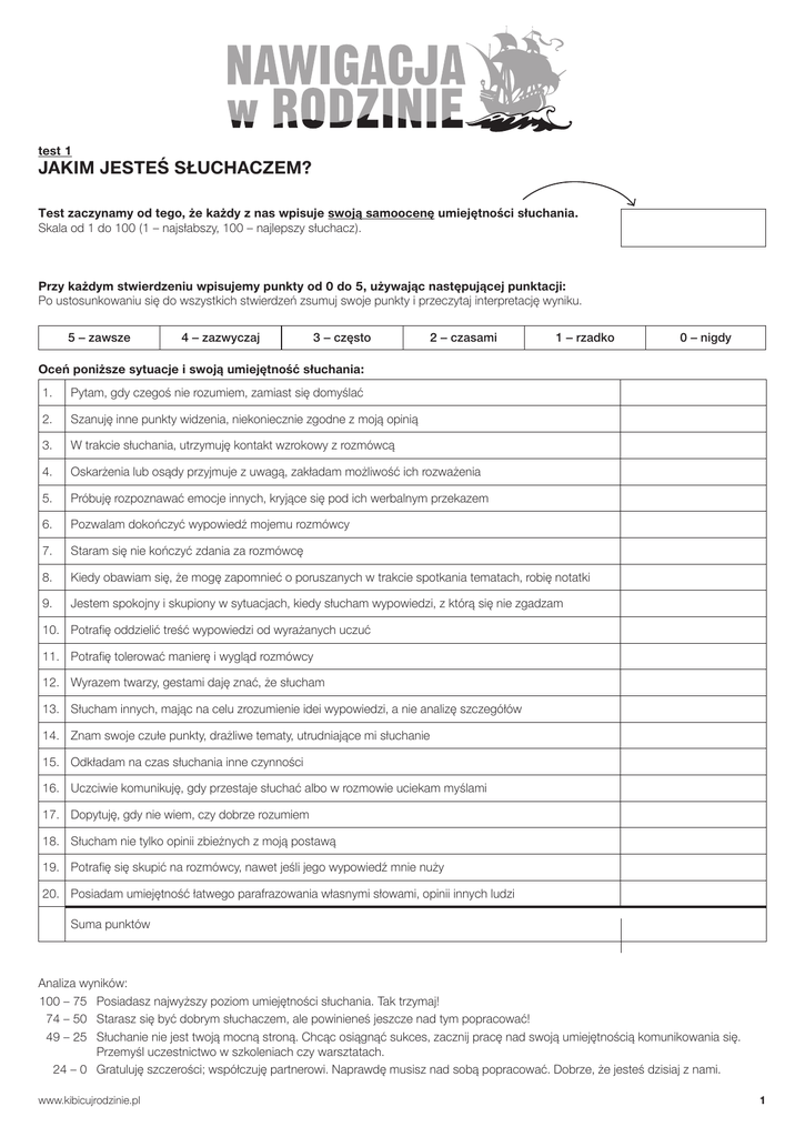 test 1 JAKIM JESTEŚ SŁUCHACZEM? Test zaczynamy od tego, że każdy z nas wpisuje swoją samoocenę umiejętności słuchania. Skala od 1 do 100 (1 – najsłabszy, 100 – najlepszy słuchacz). Przy każdym stwierdzeniu wpisujemy punkty od 0 do 5, używając następującej punktacji: Po ustosunkowaniu się do wszystkich stwierdzeń zsumuj swoje punkty i przeczytaj interpretację wyniku. 5 – zawsze 4 – zazwyczaj 3 – często 2 – czasami 1 – rzadko 0 – nigdy Oceń poniższe sytuacje i swoją umiejętność słuchania: 1. Pytam, gdy czegoś nie rozumiem, zamiast się domyślać 2. Szanuję inne punkty widzenia, niekoniecznie zgodne z moją opinią 3. W trakcie słuchania, utrzymuję kontakt wzrokowy z rozmówcą 4. Oskarżenia lub osądy przyjmuje z uwagą, zakładam możliwość ich rozważenia 5. Próbuję rozpoznawać emocje innych, kryjące się pod ich werbalnym przekazem 6. Pozwalam dokończyć wypowiedź mojemu rozmówcy 7. Staram się nie kończyć zdania za rozmówcę 8. Kiedy obawiam się, że mogę zapomnieć o poruszanych w trakcie spotkania tematach, robię notatki 9. Jestem spokojny i skupiony w sytuacjach, kiedy słucham wypowiedzi, z którą się nie zgadzam 10. Potrafię oddzielić treść wypowiedzi od wyrażanych uczuć 11. Potrafię tolerować manierę i wygląd rozmówcy 12. Wyrazem twarzy, gestami daję znać, że słucham 13. Słucham innych, mając na celu zrozumienie idei wypowiedzi, a nie analizę szczegółów 14. Znam swoje czułe punkty, drażliwe tematy, utrudniające mi słuchanie 15. Odkładam na czas słuchania inne czynności 16. Uczciwie komunikuję, gdy przestaje słuchać albo w rozmowie uciekam myślami 17. Dopytuję, gdy nie wiem, czy dobrze rozumiem 18. Słucham nie tylko opinii zbieżnych z moją postawą 19. Potrafię się skupić na rozmówcy, nawet jeśli jego wypowiedź mnie nuży 20. Posiadam umiejętność łatwego parafrazowania własnymi słowami, opinii innych ludzi Suma punktów Analiza wyników: 100 – 75 Posiadasz najwyższy poziom umiejętności słuchania. Tak trzymaj! 74 – 50 Starasz się być dobrym słuchaczem, ale powinieneś jeszcze nad tym popracować! 49 – 25 Słuchanie nie jest twoją mocną stroną. Chcąc osiągnąć sukces, zacznij pracę nad swoją umiejętnością komunikowania się. Przemyśl uczestnictwo w szkoleniach czy warsztatach. 24 – 0 Gratuluję szczerości; współczuję partnerowi. Naprawdę musisz nad sobą popracować. Dobrze, że jesteś dzisiaj z nami. www.kibicujrodzinie.pl 1 test 2 test 3 Jakie masz słabe strony jako mąż/żona? Przeczytaj opisy poniższych zachowań. Dotyczą one głównie komunikacji małżeńskiej Zaznacz X przy tych zachowaniach, które u siebie zauważasz. Przeczytaj opisy poniższych zachowań. Zaznacz X przy tych zachowaniach, które stosujesz i które ułatwiają relacje małżeńskie. Interpretację wyników znajdziesz pod testem. Jednak nie zaglądaj tam dopóki nie rozwiążesz testu! POZNAJMY NASZE SŁABOŚCI 1. 2. 3. 4. 5. 6. 7. 8. 9. 10. 11. 12. 13. 14. 15. 16. 17. 18. 19. 20. Obwinianie siebie nawzajem (np.: Gdybyś TY się zmienił, zmieniła…) Nadmierne emocje… Przemądrzałość (Ja wiem najlepiej) Nie słuchanie/brak słuchania Moralizowanie Wypominanie – wyciąganie zranień z przeszłości Wzbudzanie poczucia winy we współmałżonku Robię to tylko dla Ciebie – poświęcanie się Groźby (np.: Pamiętaj, że będziesz tego żałować) Narzekanie, zrzędzenie, marudzenie Epitety (np.: TY mule bagienny itp.) Złośliwość, ironia, sarkazm ZAWSZE, NIGDY – wielkie kwantyfikatory Szantaż – Ja coraz bardziej naciskam, Ty coraz głośniej nie rozumiesz Zamiatanie pod dywan – unikanie tematu Pytania nie w porę (np. zadane przy dzieciach) Rozkazy, dyrygowanie (ty musisz...) Doradzanie (sugerowanie rozwiązań bez wyraźnej prośby o to) Egzaminowanie, przesłuchiwanie, wypytywanie Ignorowanie, lekceważenie, odtrącanie Podsumuj liczbę X-ów. Zapisz Twój wynik: Oto interpretacja wyników: 0‑1 Masz dziś dobry humor. 2‑3 Trzeba mieć małe wady. Jest dobrze. 4‑5 Nie jesteś ideałem, ale pracujesz nad sobą. Brawo. 6‑7 Znasz siebie i wiesz, że powinieneś solidnie pracować nad sobą. 8‑9 Utrudniasz porozumienie w swoim małżeństwie. Nie odkładaj pracy nad sobą. 10‑11Alarm. Stan zagrożenia dla małżeństwa. 12‑14 Jest źle, ale masz solidne podstawy. Szczerość. 15‑16 „Musi Cię kochać, skoro z Tobą wytrzymuje”. Czas się odwzajemnić. 17‑18 Prawdopodobnie potrzebujesz pomocy specjalistów. Będzie lepiej. 19‑20Jesteś na dnie. Może być tylko lepiej. Warto żebyście po powrocie z warsztatu przedyskutowali swoje wyniki w małżeństwie. Zapytaj w domu, w dobrej atmosferze swoją drugą połowę, jak On/Ona odbiera Twoje zachowania utrudniające komunikację. Trudności są Wam dane po to, żeby się wzajemnie wspierali w ich pokonywaniu. Dobrze, gdy oboje jesteście ich świadomi. Z pewnością Twoje zalety i zasoby są o wiele bogatsze. Wiedza o nich jest równie ważna, jak wiedza o Twoich słabościach. Słabe i mocne strony, to jakby dwie nogi. Trzeba chodzić na obu nogach czyli mieć równą świadomość swoich zalet i wad. 2 POZNAJMY NASZE SILNE STRONY I ZASOBY 1. 2. 3. 4. 5. 6. 7. 8. 9. 10. 11. 12. 13. 14. 15. 16. 17. 18. 19. 20. 21. 22. 23. 24. 25. 26. 27. 28. 29. 30. Dziękuję Słucham z uwagą Żartuję nieraz z siebie, lub dla rozładowania trudnej sytuacji Okazuję miłość tak, jak to lubi małżonek/małżonka Usprawiedliwiam, tłumaczę na plus zachowania współmałżonka Przyznaję się, gdy popełnię błąd Szukam kompromisów w kwestiach trudnych Przepraszam za upór i wracam do negocjacji Mówię o swoich uczuciach, tych przyjemnych i tych nieprzyjemnych Dążę do podjęcia wspólnej decyzji Okazuję wdzięczność nawet za drobne rzeczy Chwalę małżonka/ę i doceniam jego/jej zaangażowania Szanuję odmienność małżonka/ki Pytam o poglądy i opinię współmałżonka W s