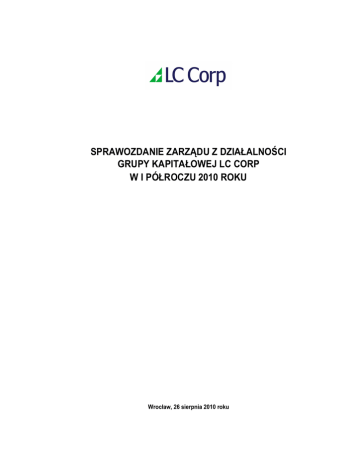 SPRAWOZDANIE ZARZĄDU Z DZIAŁALNOŚCI GRUPY KAPITAŁOWEJ LC CORP W I PÓŁROCZU 2010 ROKU Wrocław, 26 sierpnia 2010 roku Sprawozdanie Zarządu z działalności Grupy Kapitałowej LC Corp S.A. w I półroczu 2010 roku SPIS TREŚCI ZASADY SPORZĄDZENIA ŚRÓDROCZNEGO SKRÓCONEGO SKONSOLIDOWANEGO SPRAWOZDANIA FINANSOWEGO GRUPY KAPITAŁOWEJ LC CORP .................................................................................................... 3 I. PODSTAWOWE INFORMACJE O GRUPIE ......................................................................................................... 3 II. OPIS DZIAŁALNOŚCI PROWADZONEJ PRZEZ GRUPĘ W I PÓŁROCZU 2010 ROKU ........................................... 7 III. SYTUACJA MAJĄTKOWA, FINANSOWA I DOCHODOWA GRUPY LC CORP W I PÓŁROCZU 2010 ROKU ............ 8 IV. ZDARZENIA ISTOTNIE MAJĄCE LUB MOGĄCE MIEĆ WPŁYW NA DZIAŁALNOŚĆ GRUPY ORAZ FINANSOWANIE DZIAŁALNOŚCI GRUPY W I PÓŁROCZU 2010 ROKU................................................................................................ 10 V. INNE ZDARZENIA JAKIE NASTĄPIŁY PO DNIU 30 CZERWCA 2010 ROKU ........................................................ 11 VI. STANOWISKO ZARZĄDU ODNOŚNIE DO MOŻLIWOŚCI ZREALIZOWANIA WCZEŚNIEJ PUBLIKOWANYCH PROGNOZ WYNIKÓW ZA DANY ROK, W ŚWIETLE WYNIKÓW ZAPREZENTOWANYCH W RAPORCIE PÓŁROCZNYM W STOSUNKU DO WYNIKÓW PROGNOZOWANYCH ............................................................................................... 12 VII. SPRAWY SĄDOWE ......................................................................................................................................... 12 VIII. WSKAZANIE CZYNNIKÓW, KTÓRE W OCENIE EMITENTA BĘDĄ MIAŁY WPŁYW NA OSIĄGNIĘTE PRZEZ NIEGO WYNIKI W PERSPEKTYWIE CO NAJMNIEJ KOLEJNEGO KWARTAŁU ...................................................................... 12 IX. INNE INFORMACJE, KTÓRE ZDANIEM EMITENTA SĄ ISTOTNE DLA OCENY JEGO SYTUACJI KADROWEJ, MAJĄTKOWEJ, FINANSOWEJ, WYNIKU FINANSOWEGO I ICH ZMIAN ORAZ INFORMACJE, KTÓRE SĄ ISTOTNE DLA OCENY MOŻLIWOŚCI REALIZACJI ZOBOWIĄZAŃ PRZEZ EMITENTA ...................................................................... 12 X. INFORMACJE O ZAWARCIU PRZEZ EMITENTA LUB JEDNOSTKĘ OD NIEGO ZALEŻNĄ JEDNEJ LUB WIELU TRANSAKCJI Z PODMIOTAMI POWIĄZANYMI, JEŻELI POJEDYNCZO LUB ŁĄCZNIE SĄ ONE ISTOTNE I ZOSTAŁY ZAWARTE NA INNYCH WARUNKACH NIŻ RYNKOWE .............................................................................................. 12 XI. INFORMACJE O UDZIELENIU PRZEZ EMITENTA LUB PRZEZ JEDNOSTKĘ OD NIEGO ZALEŻNĄ PORĘCZEŃ KREDYTU LUB POŻYCZKI LUB UDZIELENIU GWARANCJI O WARTOŚCI CO NAJMNIEJ 10% KAPITAŁÓW WŁASNYCH EMITENTA .............................................................................................................................................................. 13 XII. CHARAKTERYSTYKA CZYNNIKÓW RYZYKA ISTOTNYCH DLA DZIAŁALNOŚCI GRUPY ................................... 13 XIII. PODSUMOWANIE ........................................................................................................................................... 15 2 ZASADY SPORZĄDZENIA ŚRÓDROCZNEGO SKRÓCONEGO SKONSOLIDOWANEGO SPRAWOZDANIA FINANSOWEGO GRUPY KAPITAŁOWEJ LC CORP Grupa Kapitałowa LC Corp, w której podmiotem dominującym jest spółka LC Corp S.A., zobowiązana jest sporządzać skonsolidowane sprawozdanie finansowe zgodnie z MSSF przyjętymi przez Unię Europejską. Śródroczne skrócone skonsolidowane sprawozdanie finansowe Grupy LC Corp za okres sprawozdawczy od 01.01.2010 do 30.06.2010 roku zostało sporządzone zgodnie z Międzynarodowymi Standardami Sprawozdawczości Finansowej („MSSF”) w kształcie zatwierdzonym przez UE, mającymi zastosowanie do śródrocznej sprawozdawczości finansowej. Informacje o zasadach zastosowanych przy sporządzeniu śródrocznego skróconego skonsolidowanego sprawozdania finansowego Grupy zostały również przedstawione nocie 6 do załączonego śródrocznego skróconego skonsolidowanego sprawozdania finansowego. Zmiany stosowanych przez Grupę Kapitałową LC Corp zasad rachunkowości i ich wpływ na politykę rachunkowości Grupy oraz na sposób prezentacji danych zostały przedstawione w nocie 4 do załączonego półrocznego skróconego skonsolidowanego sprawozdania finansowego. I. PODSTAWOWE INFORMACJE O GRUPIE Grupa Kapitałowa LC Corp („Grupa”) składa się z LC Corp S.A. i jej spółek zależnych. LC Corp S.A. (dalej również jako „LC Corp” lub „Emitent”) została utworzona aktem notarialnym dnia 3 marca 2006 roku i wpisana w dniu 15 marca 2006 r. do rejestru przedsiębiorców Krajowego Rejestru Sądowego prowadzonego przez Sąd Rejonowy dla Wrocławia – Fabrycznej we Wrocławiu, VI Wydział Gospodarczy Krajowego Rejestru Sądowego pod numerem KRS 0000253077. Siedziba Spółki dominującej mieści się w Polsce we Wrocławiu, ul. Powstańców Śląskich 2-4. Spółce dominującej nadano numer statystyczny REGON 020246398 oraz NIP 899-25-62-750 Kapitał zakładowy LC Corp to 447.558.311 PLN (w pełni opłacony) Czas trwania Spółki dominującej oraz jednostek wchodzących w skład Grupy Kapitałowej jest nieoznaczony. Podstawowym przedmiotem działania Spółki dominującej jest: • PKD 64.20.Z Działalność holdingów finansowych Podstawowym przedmiotem działalności spółek zależnych jest prowadzenie inwestycji budowlanych na należących do tych spółek gruntach w celu ich późniejszego wynajmu i sprzedaży nieruchomości mieszkaniowych i komercyjnych. Podmiotem dominującym spółki LC Corp S.A. oraz całej Grupy jest LC Corp B.V., która jest kontrolowana przez pana Leszka Czarneckiego. W skład Grupy Kapitałowej LC Corp na dzień 30.06.2010 roku wchodzą LC Corp S.A. oraz następujące spółki zależne od LC Corp S.A.: • Arkady Wrocławskie S.A. - z siedzibą we Wrocławiu, ul. Powstańców Śl. 2-4, • Katowice Ceglana Sp. z o.o. -