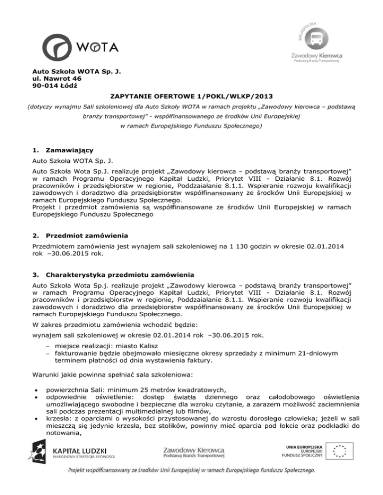 Auto A Szkołła WOTA Sp. S J. ul. u Nawrott 46 90-014 9 Łódź ZAPYTA ANIE OFER RTOWE 1/P POKL/WLK KP/2013 (do otyczy wynaj ajmu Sali szk koleniowej dla d Auto Szko oły WOTA w ramach projjektu „Zawo odowy kierow wca – podsta awą branży transportow wej” - współffinansowaneg go ze środkó ów Unii Euro opejskiej w ramach Europejjskiego Fund duszu Społec cznego) 1. 1 Zamaw wiający Auto A Szkoła a WOTA Sp. J. Auto A Szkoła a Wota Sp.J. realizuje e projekt „Z Zawodowy kierowca – podstawą ą branży tra ansportowe ej” w ramach Programu Operacyjnego Kapiitał Ludzkii, Priorytett VIII - D Działanie 8.1. 8 Rozwó ój pracownikó p siębiorstw w regionie,, Poddzaiałłanie 8.1.1. Wspieran nie rozwoju u kwalifikac cji w i przeds zawodowyc z h i doradzttwo dla prz zedsiębiorsstw współfinansowany y ze środkó ów Unii Europejskiej w ramach r Eurropejskiego o Funduszu Społeczneg go. Projekt P i przedmiot zamówienia z są współffinansowan ne ze środków Unii E Europejskie ej w ramac ch Europejskie E ego Fundusz zu Społecznego 2. 2 Przedm miot zamó ówienia Przedmiotem P m zamówie enia jest wy ynajem salii szkoleniow wej na 1 13 30 godzin w okresie 02.01.2014 rok r –30.06 6.2015 rok. 3. 3 Charak kterystyka a przedmio otu zamów wienia Auto A Szkoła a Wota Sp.j. realizuje projekt „Z Zawodowy kierowca – podstawą ą branży tra ansportowe ej” w ramach Programu Operacyjnego Kapiitał Ludzkii, Priorytett VIII - D Działanie 8.1. 8 Rozwó ój pracownikó p siębiorstw w regionie,, Poddzaiałłanie 8.1.1. Wspieran nie rozwoju u kwalifikac cji w i przeds zawodowyc z h i doradzttwo dla prz zedsiębiorsstw współfinansowany y ze środkó ów Unii Europejskiej w ramach r Eurropejskiego o Funduszu Społeczneg go. W zakres prrzedmiotu zamówienia z a wchodzić będzie: wynajem w sa ali szkolenio owej w okresie 02.01..2014 rok –30.06.2015 rok. − miejsce realizac cji: miasto Kalisz urowanie bę ędzie obejm mowało mie esięczne ok kresy sprzedaży z min nimum 21-d dniowym − faktu term minem płatn ności od dnia wystawie enia faktury y. Warunki W jak kie powinna a spełniać sala s szkolen niowa: • • • powierz zchnia Sali:: minimum 25 metrów w kwadratowych, oraz całłodobowego oświetlenia odpowiednie ośw wietlenie: dostęp światła dziennego d wiającego swobodne s i bezpieczne e dla wzrok ku czytanie, a zarazem m możliwoś ść zaciemnienia umożliw sali pod dczas preze entacji multtimedialnej lub filmów w, krzesła: z oparcia ami o wyso okości przysstosowanejj do wzrosttu dorosłeg go człowiek ka; jeżeli w sali zą się jedy ynie krzesła a, bez stolik ków, powin nny mieć oparcia pod łokcie oraz podkładk ki do mieszcz notowa ania, • • • do dysp pozycji stołły/stoliki dla a 15 osób, łatwy d dostęp do źródła prądu u ( gniazdk ka + przedłu użacz), ekran lub przyna ajmmniej je edna biała ściana (lu ub bardzo jasna) pio onowa, na której mo ożna etlać obraz z rzutnika, rzutnik, wyświe miejsce e na caterin ng (kawa, herbata, h wo oda, ciastka a), dostęp do toalety,, możliwo ość swobod dnego wietrrzenia sali, ogrzew wanie sali, głość od źró ódeł hałasu u lub wycisz zenie sali, odpowiednia odleg nione waru unki dyskre ecji (sala zzamknięta, bez możliwości prze echodzenia przez nią ą lub zapewn przebyw wania osób b nie biorących udziału u w szkolen niu), miejsce e na przech howywanie odzieży wie erzchniej i//lub bagażu u, dostępn ność miejsc c parkingow wych dla tre enerów, ob bsługi szkole eniowej ora az uczestników szkole eń. • • • • • • • • Nie N dopuszc cza się podnajmu sali szkoleniow wej. Zamawiając Z cy zastrzega sobie pra awo do niezzrealizowan nia w całośc ci przedmio otu zamówienia. Kody K Wspóllnego Słownika Zamów wień (CPV)) 70220000-9 7 9 Usługi wy ynajmu lub leasingu n ieruchomości innych niż n mieszka alne 4. 4 Zasady y składania oferty: − ofertty należy sk kładać zgod dnie ze wzo orem formu ularza ofertty, stanowią ącym załąc cznik nr 1 do ninie ejszego zap pytania wraz z załączn nikiem nr 2 i 3 dołączo onym do za apytania ofe ertowego; − do ofert należy dołączyć zaświadczen z nie z ZUS i US (nie sta arsze niż 2 miesiące);; − porządzić w języku po olskim, w fo ormie pisem mnej, na m aszynie, ko omputerze, oferttę należy sp nieśc cieralnym atramentem a m lub długo opisem; − ofertta winna by yć podpisan na przez ossobę upowa ażnioną do reprezento wania ofere enta; Ofertę można: cznej w forrmie skanu podpisane ego przez o osobę upow ważnioną do d przesłać w wersji elektronic entowania oferenta o na a adres maiilowy [email protected] m.pl;lub repreze przesłać pocztą na a adres sied dziby zama awiającego Auto Szkoła WOTA sp p. j, ul. Naw wrot 46, 90 0ódź (każdorrazowo z dopiskiem d „„Zapytanie ofertowe – wynajem m sali szkoleniowej”) – 014 Łó decyduje data wpłływu oferty y, lub p nr 42 674 27 27, llub przesłać faksem pod osobiście w siedzibie Zamawiają ącego Auto o Szkoła WO OTA sp. j, ul. Nawrott 46, 90-01 14 złożyć o Łódź. − − − − 5. 5 Termin n złożenia oferty: Ofertę O złoży yć należy do dnia 30.1 12.2013r. d do godz. 12 2.00. 6. 6 Proces s oceny ofe erty: − ocen nie podlegać będą tylk ko komplettne formula arze ofertow we, opraco owane na załączniku z n nr 1 i złłożone w te erminie; - Przy wy yborze oferrt Zamawiający będzie e się kierow wał następu ującym krytterium: Krytterium oce eny ofert – cena 100 0% − za na ajkorzystniejszą ofertę uznana zzostanie ofe erta z najniższą ceną; − ocen na zostanie dokonana przez Kom misję, w skła ad w którejj wchodzić będą 2 prz zedstawiciele realizatora Projjektu; − 7. 7 na dokonana przez Komisję ma ccharakter ostateczny. ocen Dodatk kowe inforrmacje Dodatkowyc D ch informa acji udziela Kierown nik projekttu – Magdalena Sta aniaszek pod p nr te el. +48 + 607 5 551 496 lub b adresem e-mail: bi