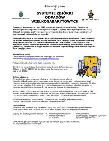 Informacja gminy o SYSTEMIE ZBIÓRKI ODPADÓW WIELKOGABARYTOWYCH Stavanger kommune, w roku 2012 proponuje mieszkańcom dzielnicy Storhaug i Hundvåg odbiór odpadów wielkogabarytowych. Odpady wielkogabarytowe to takie, których nie można pozbyć się poprzez wrzucenie ich do normalnych pojemników czy podziemnych pojemników na odpady. System funkcjonuje w ten sposób, że otrzymujemy od ciebie wiadomość, kiedy chciałbyś by odpady wielkogabarytowe zostały odebrane spod twojego domu. Na odwrocie strony znajduje się informacja o rodzajach przedmiotów i materiałów, które objęte są tym systemem zbiórki. Stavanger kommune przydzieli ci określony dzień odbioru odpadów (zazwyczaj jeden dzień w ciągu najbliższych dwóch tygodni) i tego dnia odbierze odpady spod twojego domu. Zamawianie usługi Usługę zamawiasz poprzez formularz, znajdujący się na stronie internetowej: http://renovasjon.stavanger.kommune.no/ Maksymalna ilość odbiorów to 3 zamówienia na rok. Ci, którzy nie mają dostępu do internetu, mogą dzwonić do Renovasjonen IKS pod nr tel. 51 800 800 lub do działu usług Stavanger kommune pod nr tel. 04005. Odbiór odpadów Po zamówieniu usługi otrzymasz informację z potwierdzoną datą odbioru odpadów. Odpady powinny być wystawione przed domem od strony ulicy - najlepiej w granicach nieruchomości - najwcześniej wieczorem dnia poprzedzającego odbiór i najpóźniej do godziny 07:30 w dniu odbioru odpadów. Jeśli musisz korzystać z chodnika przy wystawianiu odpadów, pamiętaj że odpady muszą być tak usytuowane, by nie ograniczać dostępu do chodnika/drogi. W celu uniknięcia nieporozumień, ważne jest by odpady wielkogabarytowe były usytuowane w taki sposób, by nie było wątpliwości co powinno być zabrane. Stavanger kommune i Renovasjonen IKS nie ponoszą odpowiedzialności za inne rzeczy zabrane razem z odpadami wielkogabarytowymi. Spółdzielnie/wspólnoty mieszkaniowe z dużymi ilościami odpadów wielkogabarytowych prosimy o bezpośredni, telefoniczny kontakt z Renovasjonen IKS. Ograniczenia Minimalna ilość odpadów przy zamawianiu usługi to 0,5 m3, co odpowiada w przybliżeniu wielkości pralki. Maksymalna ilość odpadów to 3 m3 na jedną zbiórkę, na jedno gospodarstwo domowe. Odpady nie objęte systemem zbiórki: Odpady ogrodowe/choinki Odpady remontowe i z rozbiórki Ziemia/kamienie Zwykłe odpady (mogą być wyrzucane do szarych pojemników) UWAGA! Usługa kierowana jest wyłącznie do prywatnych gospodarstw domowych, nie do przedsiębiorstw handlowych. PRZYKŁADOWE ODPADY WIELKOGABARYTOWE PODLEGAJĄCE ZBIÓRCE Sprzęt radiowo-telewizyjny i sprzęt AGD PC, TV, anteny satelitarne, anteny, głośniki, maszyny do szycia, odkurzacze, lodówki, kuchenki mikrofalowe, zamrażarki, pralki, suszarki, kuchenki. Przedmioty użytku codziennego/meble Dywany (zwinięte), meble, materace, miotły, meble ogrodowe, grille, kosiarki, narzędzia ogrodowe, deski do prasowania, rolety, maszyny do pisania itd. Rowery/sprzęt sportowy/akcesoria samochodowe Sanki, rowery, felgi, narty, sprzęt do ćwiczeń, bagażniki dachowe itd. Czerwone pojemniki: odpady niebezpieczne i drobny sprzęt elektryczny Pozostałości oleju, farby, rozpuszczalniki, środki ochrony roślin, telefony komórkowe, miksery kuchenne, radia kieszonkowe. Odpady niebezpieczne muszą być w oryginalnych opakowaniach lub wyraźnie oznakowane. Papierowe pudła, kartony, tektura falista w większych ilościach Tektura falista i papierowe pudła złożone i związane taśmą lub sznurkiem. Odzież/buty (do Fretex) Odzież używana, buty i tekstylia zapakowane w szczelne worki/reklamówki. Brukbare klær, sko og tekstiler pakkes i tett pose/sekk. PAMIĘTAJ: Jeśli posiadasz rzeczy, których chcesz się pozyć, a które nadają się do użytku, zajrzyj najpierw na kiermasz z rzeczami używanymi, do sklepów z rzeczami używanymi, do ”Namiotu” przy stacji odzysku Forus albo zamieść ogłoszenie np. na www.finn.no Jeśli nie chcesz, by rzeczy obierane od ciebie wykorzystywane były do ponownego użytku, umieść na nich żółtą karteczkę.