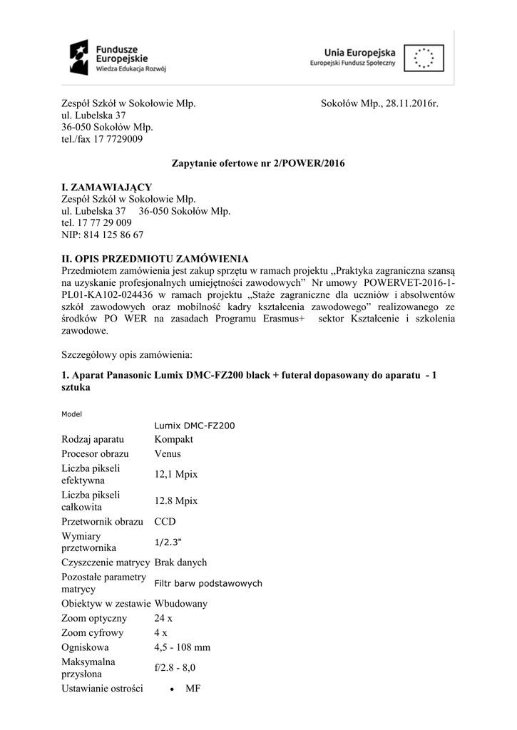 Zespół Szkół w Sokołowie Młp. ul. Lubelska 37 36-050 Sokołów Młp. tel./fax 17 7729009 Sokołów Młp., 28.11.2016r. Zapytanie ofertowe nr 2/POWER/2016 I. ZAMAWIAJĄCY Zespół Szkół w Sokołowie Młp. ul. Lubelska 37 36-050 Sokołów Młp. tel. 17 77 29 009 NIP: 814 125 86 67 II. OPIS PRZEDMIOTU ZAMÓWIENIA Przedmiotem zamówienia jest zakup sprzętu w ramach projektu ,,Praktyka zagraniczna szansą na uzyskanie profesjonalnych umiejętności zawodowych” Nr umowy POWERVET-2016-1PL01-KA102-024436 w ramach projektu „Staże zagraniczne dla uczniów i absolwentów szkół zawodowych oraz mobilność kadry kształcenia zawodowego” realizowanego ze środków PO WER na zasadach Programu Erasmus+ sektor Kształcenie i szkolenia zawodowe. Szczegółowy opis zamówienia: 1. Aparat Panasonic Lumix DMC-FZ200 black + futerał dopasowany do aparatu - 1 sztuka Model Lumix DMC-FZ200 Rodzaj aparatu Procesor obrazu Liczba pikseli efektywna Liczba pikseli całkowita Przetwornik obrazu Wymiary przetwornika Czyszczenie matrycy Pozostałe parametry matrycy Obiektyw w zestawie Zoom optyczny Zoom cyfrowy Ogniskowa Maksymalna przysłona Ustawianie ostrości Kompakt Venus 12,1 Mpix 12.8 Mpix CCD 1/2.3" Brak danych Filtr barw podstawowych Wbudowany 24 x 4x 4,5 - 108 mm f/2.8 - 8,0 MF AF-A (AF-S/AF-C) Pozostałe parametry LEICA DC VARIO-ELMARIT (powłoka Nano) obiektywu Wizjer Tak Przekątna ekranu 3'' Pozostałe parametry wyświetlacza Wbudowana lampa błyskowa Pomiar światła Wizjer: - 0,21-calowy - Kolorowy wizjer EVF (ekwiwalent 1312 tys. pikseli) - Pole widzenia: około 100%, - Zbliżenie 18,4 LCD: - 7.5cm(3.0") - Wychylny wyświetlacz LCD TFT (460K punktów) - Powłoka AR Tak Punktowy Centralnie-ważony Matrycowy Czułość ISO (min.) 100 Czułość ISO (maks.) 6400 Balans bieli Migawka Tryby migawki Tryby / Efekty Format zdjęć Automatyczny Światło jarzeniowe Światło słoneczne Światło lampy błyskowej Światło dzienne (pochmurno) Ustawienie temperatury barwowej Elektroniczna Pojedyncze zdjęcie Zdjęcia seryjne Samowyzwalacz Automatyczny Czarno-biały Film Krajobraz Nocny Portret Sport Żywy JPEG RAW Rozdzielczość JPEG (maks.) Rozdzielczość RAW (maks.) Nagrywanie filmów Rozdzielczość filmów (maks.) Format wideo 4000 x 3000 px 4000 x 3000 px Tak 1920 x 1080 px AVCHD Funkcje specjalne - Edycja zdjęć: Kontrast, Ostrość, Nasycenie koloru, Jasność, Redukcja szumów - Korekcja czerwonych oczu: Tak - Tryb odtwarzania: Normalne odtwarzanie, Pokaz slajdów, Odtwarzanie po kategorii (tylko zdjęcia, tylko filmy, 3D, wg kategorii, wg ulubionych), Wg daty z kalendarza Typ kart pamięci SD Standard pamięci SD / CF Komunikacja bezprzewodowa Złącza SD SDHC SDXC AV miniHDMI miniUSB Nie Zasilanie Akumulator dedykowany Akcesoria w zestawie - Ładowarka do akumulatora - Akumulator - Przewód USB - Przewód AC - Pasek na ramię - CD-ROM - Osłona obiektywu - Pokrywka obiektywu - Oprogramowanie (PHOTOfunSTUDIO 8.3 PE, SilkyPix Developer Studio, Adobe Reader) Kolor Wysokość Szerokość Głębokość Waga Czarny 86.6 mm 125.2 mm 110.2 mm 537 g Pozostałe parametry - Wbudowana pamięć: Około 70MB - Mikrofon / Głośnik: Stereo / Mono 2. Karta SanDisk Ultra SDXC 64GB 48MB/s UHS-I Class 10 – 1 sztuka Pojemność pamięci Typ kart pamięci 64 GB SD Prędkość odczytu Klasa pamięci 48 MB/s Class10 SDXC UHS-I Standard pamięci SD / CF 3. SanDisk ULTRA USB 3.0 FLASH DRIVE 16GB – 2 sztuki Pojemność pamięci Interfejs Prędkość odczytu Wymiary Obsługiwane systemy operacyjne 16 GB USB 3.0 100 MB/s 56,09 mm x 21,59 mm x 10,41 mm Linux Mac OS Windows XP Windows Vista Windows 7 4. SanDisk ULTRA USB 3.0 FLASH DRIVE 32GB – 1 sztuka Pojemność pamięci Interfejs Prędkość odczytu Wymiary Obsługiwane systemy operacyjne 32 GB USB 3.0 100 MB/s 56,09 mm x 21,59 mm x 10,41 mm Linux Mac OS Windows XP Windows Vista Windows 7 TERMIN WYKONANIA ZAMÓWIENIA Termin wykonania przedmiotu zamówienia do 22.12.2016r. IV. RODZAJ I OPIS KRYTERIÓW, KTÓRYMI ZAMAWIAJĄCY BĘDZIE SIĘ KIEROWAŁ PRZY WYBORZE OFERTY, WRAZ Z SPOSOBEM OCENY OFERT Przy wyborze oferty Zamawiający kierował będzie się następującymi kryteriami: 1 kryterium: cena - waga 100 pkt. Sposób oceny ofert: P (liczba punktów za kryterium dla poszczególnych ofert) = najniższa cena brutto łączna spośród złożonych ofert/cenę brutto łączną oferty badanej x 100 pkt. Do realizacji zamówienia zostanie wybrany oferent, który otrzyma największą liczbę punktów. V. OPIS SPOSOBU PRZYGOTOWANIA OFERTY Oferent powinien stworzyć ofertę na formularzu załączonym do niniejszego zapytania ofertowego (załącznik 1 Wzór formularza ofertowego). VI. MIEJSCE ORAZ TERMIN SKŁADANIA OFERT - Oferta powinna być przesłana za pośrednictwem: faksem 17 7729009, poczty, poczty elektronicznej, kuriera lub też dostarczona osobiście na adres: Zespół Szkół w Sokołowie Młp. ul. Lubelska 37 36-050 Sokołów Młp. do dnia 06.12.2016r. Koperta zawierającą ofertę powinna być zaadresowana: Zespół Szkół w Sokołowie Młp. ul. Lubelska 37 36-050 Sokołów Młp z dopiskiem: Oferta na wybór dostawcy w związku z realizacją projektu - Praktyka zagraniczna szansą na uzyskanie profesjonalnych umiejętności zawodowych. - Ocena ofert zostanie dokonana w dniu 06.12.2016r. Oferent którego oferta będzie najatrakcyjniejsza zostanie poinformowanym telefonicznie, mailem lub faxem. - Oferty złożone po terminie nie będą rozpatrywane VI. DODATKOWE INFORMACJE 1. Wszelkie wyjaśnienia dotyczące niniejszego zapytania przekazywane będą pisemnie, faksem, pocztą e-mail na adres [email protected] 2. Zamawiający z wykonawcą będzie porozumiewał się mailem, osobiści, faksem, telefonicznie oraz pocztą tradycyjną. 3. Osobą uprawnioną do porozumiewania się z wykonawcą będzie Pani Anna Kolano. 5. Wybór Wykonawcy nastąpi z zachowaniem zasady uczciwej konkurencji i równego traktowania ubiegających się o zamówienie. 6. Wszelkich info