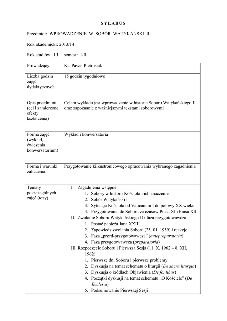 SYLABUS Przedmiot: WPROWADZENIE W SOBÓR WATYKAŃSKI II Rok akademicki: 2013/14 Rok studiów: III semestr I-II Prowadzący Ks. Paweł Pietrusiak Liczba godzin zajęć dydaktycznych 15 godzin tygodniowo Opis przedmiotu (cel i zamierzone efekty kształcenia) Celem wykładu jest wprowadzenie w historie Soboru Watykańskiego II oraz zapoznanie z ważniejszymi tekstami soborowymi Forma zajęć (wykład, ćwiczenia, konwersatorium) Wykład i konwersatoria Forma i warunki zaliczenia Przygotowanie kilkustronicowego opracowania wybranego zagadnienia Tematy poszczególnych zajęć (tezy) I. Zagadnienia wstępne 1. Sobory w historii Kościoła i ich znaczenie 2. Sobór Watykański I 3. Sytuacja Kościoła od Vaticanum I do połowy XX wieku 4. Przygotowania do Soboru za czasów Piusa XI i Piusa XII II. Zwołanie Soboru Watykańskiego II i faza przygotowawcza 1. Postać papieża Jana XXIII 2. Zapowiedz zwołania Soboru (25. 01. 1959) i reakcje 3. Faza „przed-przygotowawcza” (antepreparatoria) 4. Faza przygotowawcza (preparatoria) III. Rozpoczęcie Soboru i Pierwsza Sesja (11. X. 1962 – 8. XII. 1962) 1. Pierwsze dni Soboru i pierwsze problemy 2. Dyskusja na temat schematu o liturgii (De sacra liturgia) 3. Dyskusja o źródłach Objawienia (De fontibus) 4. Początki dyskusji na temat schematu „O Kościele” (De Ecclesia) 5. Podsumowanie Pierwszej Sesji Literatura podstawowa Lektura 6. Okres „intersessio” a) Prace komisji soborowych b) Śmierć Jana XXIII i wybór Pawła VI IV. Druga Sesja Soboru (29 IX 1963 – 4. XII. 1963) 1. Kontynuacja debaty De Ecclesia 2. Kontynuacja debaty De sacra liturgia i promulgacja Sacrosanctum Concilium 3. Podsumowanie Drugiej Sesji 4. Okres intersessio V. Trzecia Sesja Soboru (14. IX. 1964 – 21. XI. 1964) 1. Ostatnie debaty o De Ecclesia i promulgacja Konstytucji Dogmatycznej Lumen gentium 2. Tzw. „czarny tydzień” (14-21 XI 1964) a) Nota explicativa praevia b) Tytuł Mater ecclesiae dla Maryi 3. Debaty i promulgacja Dekretów Unitatis redintegratio i Orientalium ecclesiarum 4. Zakończenie i bilans III Sesji. Ostatnia intersesja VI. Czwarta Sesja Soboru (14. IX. 1965 – 8. XII. 1965) 1. Ostatnie debaty doktrynalne i promulgacja dokumentów soborowych 2. Zakończenie obrad Soboru Watykańskiego II VII. Próba oceny 1. Udział i wkład polskich biskupów w Sobór Watykański II 2. Początek okresu „posoborowego” i problem recepcji 3. Kryteria właściwej hermeneutyki nauki Vaticanum II VIII. Studium niektórych dokumentów soborowych i ich problematyki 1. Constitutio dogmatica de Ecclesia „Lumen gentium” 2. Constitutio dogmatica de Divina Revelatione „Dei Verbum” G. Alberigo (dir.), Histoire du concile Vatican II. Tomy 1-5, Cerf/Peters, Paris/Louvain 2000-2005 G. Alberigo, Krótka historia II Soboru Watykańskiego, Pax, Warszawa 2005 J. W. Malley, Co się zdarzyło podczas Soboru Watykańskiego II, WAM, 2011 O. Pesch, Il Concilio Vaticano II. Preistoria, svolgimento, risultati, storia post-concliare, Queriniana, Brescia 2005 G. Routhier (dir.), L’autorité et les autorités. L’hérmeneutique théologique de Vatican II, Cerf, Paris 2010. G. Routhier (dir.), Réception de Vatican II, Peeters, Leuven 2004 Ch. Theobald, La Reception du concile Vatican II, Tomy 1-2, Cerf, Paris 2011 K. Wenzel, Mała historia Soboru Watykańskiego II, WAM 2007 uzupełniająca