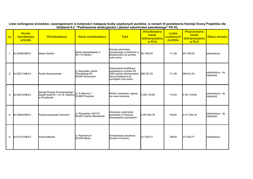 Lista rankingowa wniosków, uszeregownych w kolejności malejącej liczby uzyskanych punktów, w ramach III posiedzenia Komisji Oceny Projektów dla Działania 9.2 "Podniesienie atrakcyjności i jakości szkolnictwa zawodowego" PO KL Wnioskowana Proponowana Numer Liczba kwota kwota Lp kancelaryjny Wnioskodawca Adres wnioskodawcy Tytuł uzyskanych Status wniosku dofinansowania dofinansowania wniosku punktów w PLN w PLN 1 KL/02080/08/9.2 Miasto Siedlce Skwer Niepodległości 2 08-110 Siedlce Rozwój szkolnictwa zawodowego w Siedlcach w 521 000,00 dostosowaniu do potrzeb rynku pracy 111,50 521 000,00 zatwierdzony ul. Marszałka Józefa Piłsudskiego 65 96-500 Sochaczew Podnoszenie kwalifikacji zawodowych uczniów ZS CKP poprzez dostosowanie 289 021,53 oferty kształcenia do wymogów rynku pracy 111,50 289 021,53 zatwierdzony - do negocjacji Mobilni zawodowo i gotowi na nowe wyzwania 3 355 178,69 110,00 3 351 416,69 zatwierdzony - do negocjacji 2 KL/02211/08/9.2 Powiat Sochaczewski 3 KL/02615/08/9.2 Zarząd Powiatu Pruszkowskiego / ul. S.Staszica 1 Zespół Szkół Nr 1 im. St. Staszica 05-800 Pruszków w Pruszkowie 4 KL/02644/08/9.2 Powiat warszawski Zachodni ul. Poznańska 129/133 05-850 Ożarów Mazowiecki Atrakcyjne szkolnictwo zawodowe w Powiecie Warszawskim Zachodnim 2 497 844,78 109,00 2 417 844,78 zatwierdzony - do negocjacji 5 KL/01317/08/9.2 Powiat Mławski ul. Reymonta 6 06-500 Mława Kompetencje zawodowe kluczem do kariery 217 633,77 108,00 217 633,77 zatwierdzony 6 KL/02005/08/9.2 Miasto Stołeczne Warszawa Plac Bankowy 3/5 00-950 Warszawa Zawody budowlane na rynku 885 237,00 pracy 104,00 651 237,00 zatwierdzony - do negocjacji 7 KL/02599/08/9.2 Miasto Stołeczne Warszawa pl. Bankowy 3/5 00-950 Warszawa Europejski Certyfikat Umiejętności Komputerowych 682 390,00 103,50 525 400,00 zatwierdzony - do negocjacji Absolwent Zespołu Szkół im. Jarosława Iwaszkiewicza 435 558,40 człowiekiem sukcesu zawodowego 100,50 435 558,40 zatwierdzony 8 KL/02210/08/9.2 Powiat Sochaczewski ul. Marszałka Józefa Piłsudskiego 65 96-500 Sochaczew 9 KL/02485/08/9.2 Miasto Stołeczne Warszawa Pl. Bankowy 3/5 00-950 Warszawa Rozwój szkolnictwa zawodowego w Warszawie a 1 252 690,00 potrzeby rynku pracy diagnoza i prognoza 100,00 1 252 690,00 zatwierdzony Miasto Stołeczne Warszawa Plac Bankowy 3/5 00-950 Warszawa Mam wsparcie i aktywnie szukam pracy - program doradczo-szkoleniowy dla uczniów zawodowych szkół specjalnych 625 815,00 99,50 625 815,00 zatwierdzony Skwer Niepodległości 2 08-110 Siedlce JUŻ WIEM KIM BĘDĘ! Doradztwo zawodowe dla uczniów szkół 428 205,00 ponadgimnazjalnych miasta Siedlce 98,00 428 205,00 zatwierdzony - do negocjacji 10 KL/02639/08/9.2 11 KL/02079/08/9.2 Miasto Siedlce 12 KL/02199/08/9.2 Stowarzyszenie Polski Ruch Społeczno Humanitarny ul. Górskiego 1 m 109 00-033 Warszawa Dziś nauka - jutro pewna praca. 134 934,00 96,00 134 934,00 zatwierdzony 95,00 1 303 015,00 zatwierdzony 94,00 108 211,00 zatwierdzony 13 KL/01621/08/9.2 Powiat Płoński / Powiatowa Jednostka Obsługi Placówek Oświatowych ul. Sienkiewicza 8 09-100 Płońsk Moja wiedza, moje umiejetności, moja przyszłość - program wyrównywania szans 1 303 015,00 edukacyjnych uczniów szkół zawodowych prowadzonych przez Powiat Płoński. 14 KL/02641/08/9.2 POWIAT OTWOCKI/STAROSTWO POWIATOWE W OTWOCKU ul. Górna 13 05-400 OTWOCK ZNAJOMOŚĆ JĘZYKA OBCEGO WAŻNYM ATUTEM ZAWODOWYM 15 KL/01575/08/9.2 Powiat żuromiński/Zespół Szkół Ponadgimnazialnych im. Jana Pawła II w Żurominie Plac Piłsudskiego 4 09-300 Żuromin W przyszłość - przygotowani 84 597,64 zawodowo 93,50 88 674,48 zatwierdzony - do negocjacji 16 KL/01646/08/9.2 Powiat Radomski ul. Domagalskiego 7 26-600 Radom Wszystko jest trudne dopóki 143 981,50 nie stanie się proste 93,00 143 981,50 zatwierdzony - do negocjacji 17 KL/02081/08/9.2 Miasto Siedlce Skwer Niepodległości 2 08-110 Siedlce LEPSZY W ZAWODZIE 90,00 1 624 448,00 zatwierdzony 108 211,00 1 624 448,00 18 KL/02083/08/9.2 Powiat Ostrołęcki Wizytówki Powiatu - zajęcia Plac Generała Józefa Bema 5 pozalekcyjne z 07-410 Ostrołęka autoprezentacji dla uczniów 289 670,00 szkół zawodowych z Powiatu Ostrołęckiego 19 KL/02425/08/9.2 Zakład Doskonalenia Zawodowego w Warszawie ul. Podwale 13 00-252 Warszawa "Europejski zawód & sukces" 4 187 680,00 89,50 3 631 230,00 zatwierdzony - do negocjacji 20 KL/01627/08/9.2 Zarząd Powiatu Sokołowskiego ul. Wolności 23 08-300 Sokołów Podlaski Logistyk - zawód przyszłości 693 935,08 88,50 0,00 odrzucony 21 KL/02638/08/9.2 Zakład Doskonalenia Zawodowego w Warszawie ul. Podwale 13 00-252 Warszawa Więcej wiedzieć, więcej móc 702 297,05 88,50 702 297,05 zatwierdzony - do negocjacji 22 KL/02429/08/9.2 Powiat Pułtuski ul. Białowiejska 5 06-100 Pułtusk Wysoka jakość szkolnictwa zawodowego w powiecie pułtuskim 87,50 193 075,00 zatwierdzony - do negocjacji Gmina Miasta Radomia ul. Kilińskiego 30 26-610 Radom Zostań fachowcem - zajęcia dodatkowe i wyrównawcze dla uczniów radomskich 1 900 384,00 szkół zawodowych w latach 2009 - 2010 86,50 1 900 384,00 zatwierdzony - do negocjacji 23 KL/02204/08/9.2 298 634,00 90,00 289 670,00 zatwierdzony 24 KL/02205/08/9.2 Gmina Miasta Radomia ul. Kilińskiego 30 26-610 Radom Grunt to dobry zawód na dobrym gruncie - zajęcia dodatkowe i wyrównawcze dla uczniów radomskich szkół zawodowych w latach 2009 - 2010 25 KL/02603/08/9.2 Miasto Stołeczne WarszawaDzielnica Ursus m.st. Warszawy Plac Bankowy 3/5 00-950 Warszawa Tygrysy rynku pracy 923 570,00 86,50 836 870,00 zatwierdzony - do negocjacji Powiat Węgrowski ul. Przemysłowa 5 07-100 Węgrów "Korzystam z szansy" Projekt Powiatu Węgrowskiego dla uczniów zasadnicznych szkół zawodowych 253 861,00 85,50 253 861,00 zatwierdzony - do negocjacji 27 KL/02209/08/9.2 Powiat Sochaczewski ul. Marszałka Józefa Piłsudskiego 65 96-500 Sochaczew Absolwent szkoły zawodowej Powiatu Sochaczewskiego 531 410,27 poszukiwanym fachowcem na 