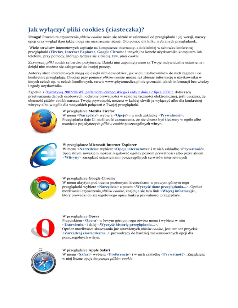 Jak wyłączyć pliki cookies (ciasteczka)? Uwaga! Procedura czyszczenia plików cookie może się różnić w zależności od przeglądarki i jej wersji, nazwy opcji oraz wygląd ikon także mogą się nieznacznie różnić. Oto pomoc dla kilku wybranych przeglądarek. Wiele serwisów internetowych zapisuje na komputerze internauty, a dokładniej w schowku konkretnej przeglądarki (Firefox, Internet Explorer, Google Chrome i innych) na koncie użytkownika komputera lub telefonu, przy pomocy, którego łączysz się z Siecią, tzw. pliki cookie. Zazwyczaj pliki cookie są bardzo pożyteczne. Dzięki nim zapamiętywane są Twoje indywidualne ustawienia i dzięki nim możesz się zalogować do swojej poczty. Autorzy stron internetowych mogą się dzięki nim dowiedzieć, jak wielu użytkowników do nich zagląda i co konkretnie przeglądają. Chociaż przy pomocy plików cookie można też zbierać informację o użytkowniku w innych celach np. w celach handlowych, serwis www.phytomedica.pl nie gromadzi takich informacji bez wiedzy i zgody użytkownika. Zgodnie z Dyrektywą 2002/58/WE parlamentu europejskiego i rady z dnia 12 lipca 2002 r. dotyczącą przetwarzania danych osobowych i ochrony prywatności w sektorze łączności elektronicznej, jeśli uważasz, że obecność plików cookie narusza Twoją prywatność, możesz w każdej chwili je wyłączyć albo dla konkretnej witryny albo w ogóle dla wszystkich połączeń z Twojej przeglądarki. W przeglądarce Mozilla Firefox W menu <Narzędzia> wybierz <Opcje> i w nich zakładkę <Prywatność>. Przeglądarka daje Ci możliwość zaznaczenia, że nie chcesz być śledzony w ogóle albo usunięcia pojedynczych plików cookie poszczególnych witryn. W przeglądarce Microsoft Internet Explorer W menu <Narzędzia> wybierz <Opcje internetowe> i w nich zakładkę <Prywatność>. Specjalnym suwakiem możesz regulować ogólny poziom prywatności albo przyciskiem <Witryny> zarządzać ustawieniami poszczególnych serwisów internetowych W przeglądarce Google Chrome W menu ukrytym pod trzema poziomymi kreseczkami w prawym górnym rogu przeglądarki wybierz <Narzędzia> a potem <Wyczyść dane przeglądania...>. Oprócz możliwości czyszczenia plików cookie, znajduje się tam link <Więcej informacji>, który prowadzi do szczegółowego opisu funkcji prywatności przeglądarki. W przeglądarce Opera Przyciskiem <Opera> w lewym górnym rogu otwórz menu i wybierz w nim <Ustawienia> i dalej <Wyczyść historię przeglądania...>. Oprócz możliwości skasowania już ustawionych plików cookie, jest tam też przycisk <Zarządzaj ciasteczkami...> prowadzący do bardziej zaawansowanych opcji dla poszczególnych witryn. W przeglądarce Apple Safari W menu <Safari> wybierz <Preferencje> i w nich zakładkę <Prywatność>. Znajdziesz w niej liczne opcje dotyczące plików cookie. W telefonach komórkowych, tabletach i innych urządzeniach mobilnych Każdy model telefonu może tę funkcję obsługiwać w inny sposób. Dlatego należy zapoznać się z opcjami prywatności w dokumentacji na stronie internetowej producenta urządzenia mobilnego. Android przeglądarka domyślna 1. Wybierz przycisk Menu . 2. Wybierz polecenie Ustawienia > Prywatność i bezpieczeństwo. 3. W sekcji „Pliki cookie” wybierz polecenie „Usuń wszystkie pliki cookie”. W przeglądarce Chrom na Androida 1. Uruchom przeglądarkę Chrome. 2. W zależności od telefonu wybierz przycisk Menu lub przycisk 3. Wybierz polecenie „Ustawienia” > „Ochrona prywatności”. 4. Kliknij polecenie da dole ekranu „Wyczyść dane przeglądarki” 5. Zaznacz opcję „Wyczyść cookie, dane witryn”. 6. Kliknij „Wyczyść”. obok paska adresu. W przeglądarce Maxthon 1. Uruchom przeglądarkę Maxthon. 2. Wybierz przycisk Menu lub przycisk w dolnym pasku narzędzi. 3. Kliknij przycisk . 4. Wybierz polecenie „Bezpieczeństwo i prywatność”. 5. Wybierz polecenie „Usuń cookies”. 6. Kliknij „Ok”. W przeglądarce Dolphin 1. Uruchom przeglądarkę Dolphin i wybierz przycisk Menu 2. Wybierz przycisk Więcej . 3. Wybierz polecenie „Ustawienia”. 4. Wybierz polecenie „Prywatność i dane osobiste”. 5. Wybierz polecenie „Wyczyść dane”. 6. Zaznacz opcję „Usuń ciasteczka” 7. Kliknij przycisk „Wyczyść wybrane dane”. W przeglądarce Safari na Androida 1. Kliknij ikonę „Ustawienia”. 2. Wybierz pozycję „Safari”. 3. Wybierz polecenie „Wymaż pliki cookie i dane”. W przeglądarce Internet Explorer na Windows Phone 1. Uruchom przeglądarkę Internet Explorer. 2. Kliknij ikonę . 3. Wybierz polecenie „ustawienia”. 4. Kliknij przycisk „usuń historię”. .