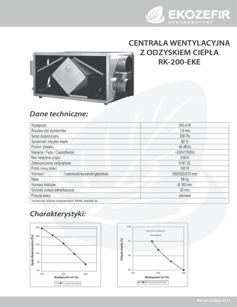 CENTRALA WENTYLACYJNA Z ODZYSKIEM CIEPŁA RK-200-EKE Dane techniczne: 200 m3/h 1.8 mm Wydajność Rozstaw płyt wymiennika Spręż dyspozycyjny Sprawność odzysku ciepła Poziom dźwięku Napięcie / Faza / Częstotliwość Max natężenie prądu Zabezpieczenie nadprądowe Pobór mocy (max) Wymiary* szerokość/wysokość/głębokość Masa Wymiary króćców Grubość izolacji wełna/kauczuk Pozycja pracy 200 Pa 92 % 46 dB(A) ~230V/1/50Hz 0.80 A S191 2C 100 W 930/530/370 mm 68 kg Ø 160 mm 25 mm pionowa *wymiary bez króćców przyłączeniowych, klamek, zawiasów, itp. Charakterystyki: 100 290 nieosiągalne Odzysk ciepła [%] Spręż dyspozycyjny [Pa] Wartości w praktyce 240 190 140 90 95 90 85 40 100 200 300 Wydajność [m3/h] spręż nominalny 100 200 300 Wydajność [m3/h] sprawność nominalna Wersja 3.0 luty 2011 1160 930 450 370 160 ø1 530 60 530 160 70 40 ø1 160 160 40 60 Schemat działania: OPCJA W1 OPCJA WA odzysk FW W1 WK FN CZA-czerpnia np. ścienna N1 T CA TC TW SE WB bypass T CB W2 N2 TN WN N1 – powietrze zewnętrzne N2 – nawiew do pomieszczeń W1 – wywiew z pomieszczeń W2 – wywiew na zewnątrz WN – wentylator nawiewny WW – wentylator wywiewny WK – wymiennik krzyżowy TS CZB-czerpnia np. gruntowa GWC WW FN – filtr nawiewu FW – filtr wywiewu TP – zabezp. przeciwzamr. ZT – zabezpieczenie termiczne SE – sterowanie elektryczne SE – sterowanie elektryczne TS – taca skroplin z odpływem TW - czyjnik wywiewu TN - czujnik nawiewu TC - czujnik czerpnia (TCA, TCB w przypadku wyboru czerpni WB, WA - bypass, odzysk (opcja w przypadku oobejścia wymiennika Ekoklimax - Projekt Sp. j., 85-055 Bydgoszcz, ul. Podolska 13, tel.: +4852 321 24 53, fax: +4852 349 51 35 www.ekozefir.pl, email: [email protected] Wersja 3.0 luty 2011 W związku ze stałym rozwojem produktów, Ekoklimax-Projekt sp.j. zastrzega sobie prawo do wprowadzania zmiany parametrów i wymiarów bez uprzedniego informowania o tym. Wymiary:
