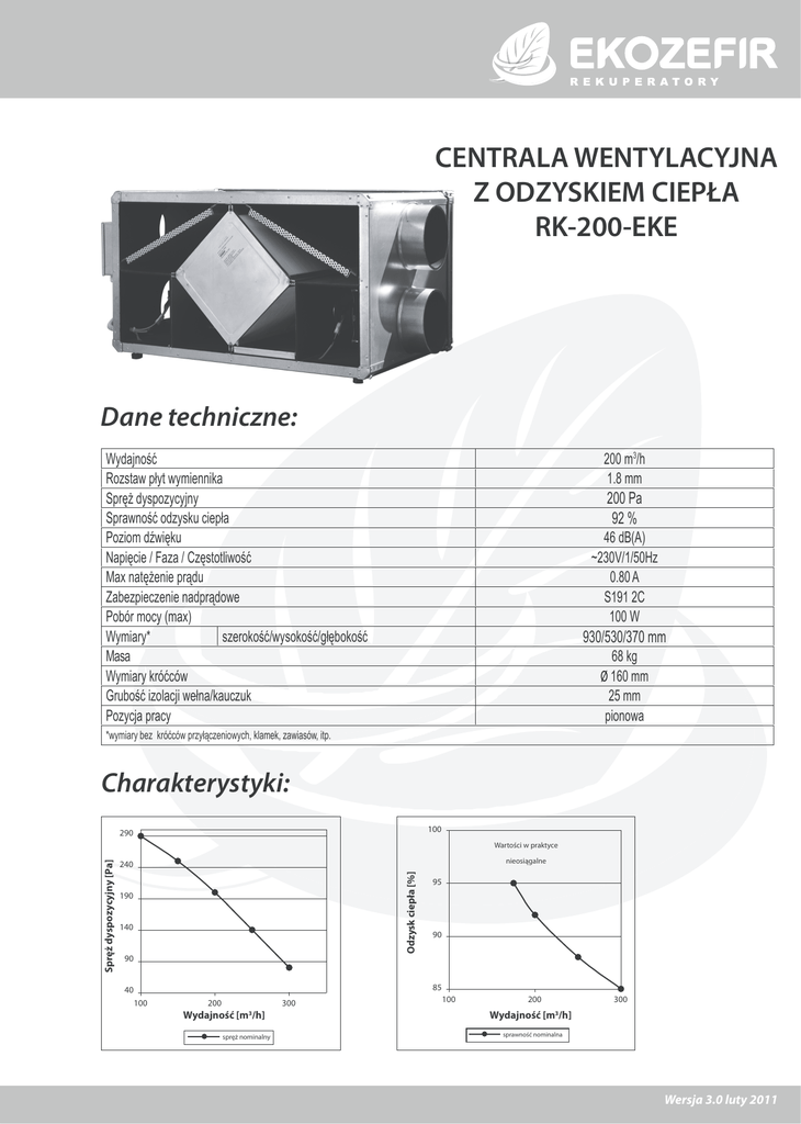 CENTRALA WENTYLACYJNA Z ODZYSKIEM CIEPŁA RK-200-EKE