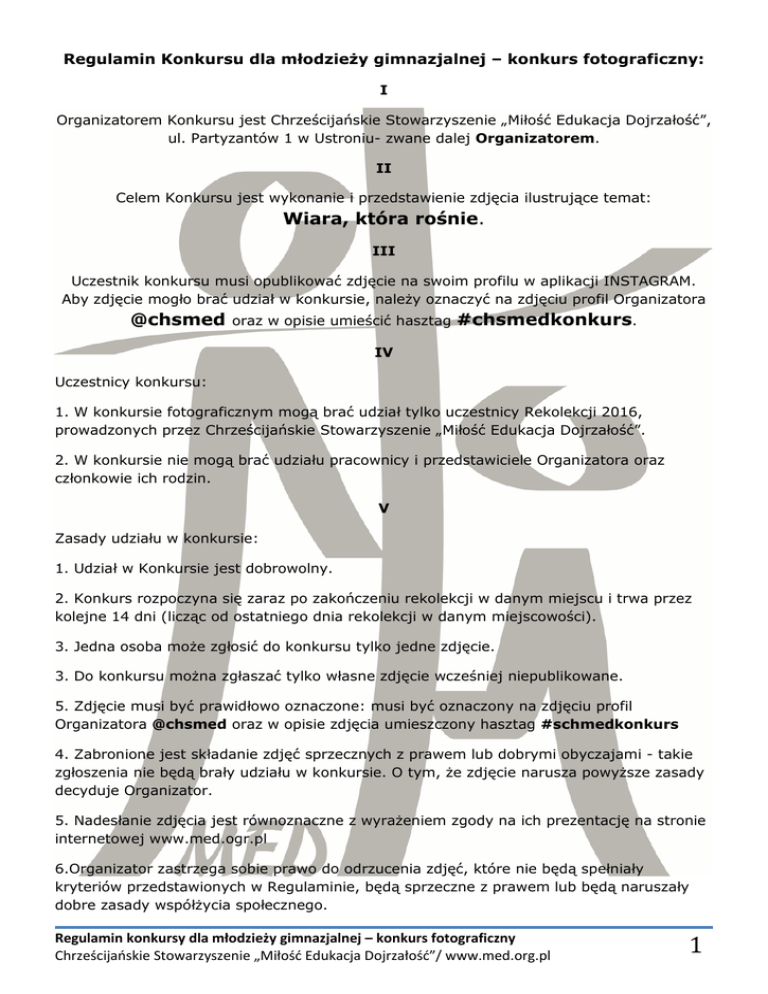 Regulamin Konkursu dla młodzieży gimnazjalnej – konkurs fotograficzny: I Organizatorem Konkursu jest Chrześcijańskie Stowarzyszenie „Miłość Edukacja Dojrzałość”, ul. Partyzantów 1 w Ustroniu- zwane dalej Organizatorem. II Celem Konkursu jest wykonanie i przedstawienie zdjęcia ilustrujące temat: Wiara, która rośnie. III Uczestnik konkursu musi opublikować zdjęcie na swoim profilu w aplikacji INSTAGRAM. Aby zdjęcie mogło brać udział w konkursie, należy oznaczyć na zdjęciu profil Organizatora @chsmed oraz w opisie umieścić hasztag #chsmedkonkurs. IV Uczestnicy konkursu: 1. W konkursie fotograficznym mogą brać udział tylko uczestnicy Rekolekcji 2016, prowadzonych przez Chrześcijańskie Stowarzyszenie „Miłość Edukacja Dojrzałość”. 2. W konkursie nie mogą brać udziału pracownicy i przedstawiciele Organizatora oraz członkowie ich rodzin. V Zasady udziału w konkursie: 1. Udział w Konkursie jest dobrowolny. 2. Konkurs rozpoczyna się zaraz po zakończeniu rekolekcji w danym miejscu i trwa przez kolejne 14 dni (licząc od ostatniego dnia rekolekcji w danym miejscowości). 3. Jedna osoba może zgłosić do konkursu tylko jedne zdjęcie. 3. Do konkursu można zgłaszać tylko własne zdjęcie wcześniej niepublikowane. 5. Zdjęcie musi być prawidłowo oznaczone: musi być oznaczony na zdjęciu profil Organizatora @chsmed oraz w opisie zdjęcia umieszczony hasztag #schmedkonkurs 4. Zabronione jest składanie zdjęć sprzecznych z prawem lub dobrymi obyczajami - takie zgłoszenia nie będą brały udziału w konkursie. O tym, że zdjęcie narusza powyższe zasady decyduje Organizator. 5. Nadesłanie zdjęcia jest równoznaczne z wyrażeniem zgody na ich prezentację na stronie internetowej www.med.ogr.pl 6.Organizator zastrzega sobie prawo do odrzucenia zdjęć, które nie będą spełniały kryteriów przedstawionych w Regulaminie, będą sprzeczne z prawem lub będą naruszały dobre zasady współżycia społecznego. Regulamin konkursy dla młodzieży gimnazjalnej – konkurs fotograficzny Chrześcijańskie Stowarzyszenie „Miłość Edukacja Dojrzałość”/ www.med.org.pl 1 VI Rozstrzygnięcie konkursu: 1. Wśród uczestników z danej parafii zostaną rozlosowane nagrody za miejsce I, II i III. Natomiast po zakończeniu wszystkich rekolekcji zostanie wylosowana nagroda główna wśród wszystkich uczestników niniejszego konkursu. Nagrodą główną jest darmowy wyjazd na obóz dla nastolatków w okresie wakacji letnich 2016 (termin wyjazdu do wyboru: 30.06-10.07.2016 – Wisła; lub 20.07-30.07.2016 - Wisła). 2. Organizator powołuje Komisję konkursową, której zadaniem jest wybranie zwycięzców niniejszego konkursu fotograficznego. 3. Komisja konkursowa wybiera fotografię, która będzie ciekawą i trafną ilustracją tematu konkursu. 4. Zwycięzcy konkursu zostaną powiadomieni o zwycięstwie oraz dalszych formalnościach przez aplikację Instagram. 5. Zwycięzca zobowiązany jest przesłać nagrodzone zdjęcie oraz wypełniony formularz konkursowy na adres Organizatora. 6. Wybrane przez Komisję konkursową zdjęcia zostaną opublikowane na stronie internetowej www.med.org.pl wraz z opisem. 7. Przekazanie nagród Zwycięzcom Konkursu, nastąpi w wyznaczonym przez Organizatora terminie i miejscu, jednak nie później niż w terminie do 30 dni od opublikowania wyników. VII 1. Organizator zastrzega sobie prawo do wprowadzenia zmian w niniejszym Regulaminie. 2. W sprawach nieuregulowanych niniejszym Regulaminem zastosowanie mają odpowiednie przepisy prawa. 3. Zgłoszenie przez uczestnika swoich zdjęć do Konkursu dla młodzieży gimnazjalnej – konkurs fotograficzny, uważane będzie za akceptację warunków niniejszego Regulaminu oraz wyrażenie zgody na przetwarzanie danych osobowych zgodnie z ustawą z dnia 29.08.1997 r. o ochronie danych osobowych (Dz. U. 2014 r. poz. 1182 ze zm.) Regulamin konkursy dla młodzieży gimnazjalnej – konkurs fotograficzny Chrześcijańskie Stowarzyszenie „Miłość Edukacja Dojrzałość”/ www.med.org.pl 2